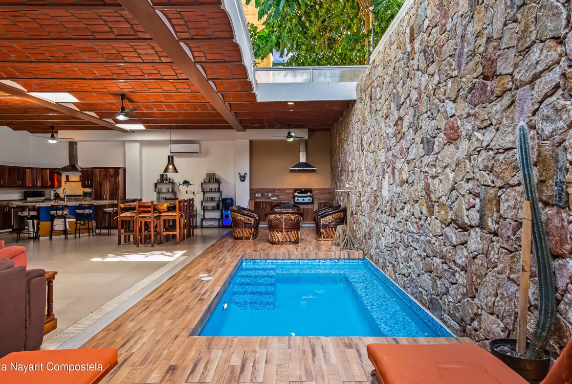 Espacioso duplex de 4 dormitorios y 4 banos, (ambas unidades de 2 dormitorios y 2 banos) cada uno con su propio Piscina privada! Vive en uno, alquila el otro o Airbnb en ambos. Disenado para la comodidad ysostenibilidad: paneles solares, y a 4 cuadras de playa, supermercado, excelente Restaurantes y mas! A 15 minutos en coche de puertos deportivos, campos de golf y mas actividades.A solo 10 millas del aeropuerto de Vallarta!Las caracteristicas incluyen techos altos de ladrillo abovedado, acabados de madera de parota, un techo retractiljunto a la piscina, y una unidad independiente de 2 camas en el segundo piso con entrada privada, completaCocina y balcon con piscina de inmersion.Mejoras recientes: techo nuevo, bomba de agua, pintura y mas