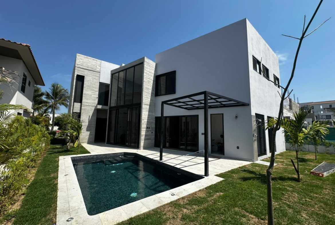 Hermosa residencia ubicada en Residencial Los Tigres, uno de los desarrollos mas exclusivos de Nuevo Vallarta. Construida sobre un terreno de 503.20 m con 396.90 m de construccion, esta elegante propiedad de dos niveles ofrece 4 amplias recamaras, cada una con vestidor y bano completo, ademas de bano para visitas, cuarto de servicio, cuarto de lavado y bano de servicio. La casa cuenta con cochera techada, pisos de granito, carpinteria en madera solida de parota y canceleria alemana de PVC, con acabados de primera calidad. Los residentes disfrutan de acceso al club deportivo y parque infantil, dentro de un entorno seguro, exclusivo y rodeado de naturaleza. Ideal para vivir o invertir en la Riviera Nayarit.