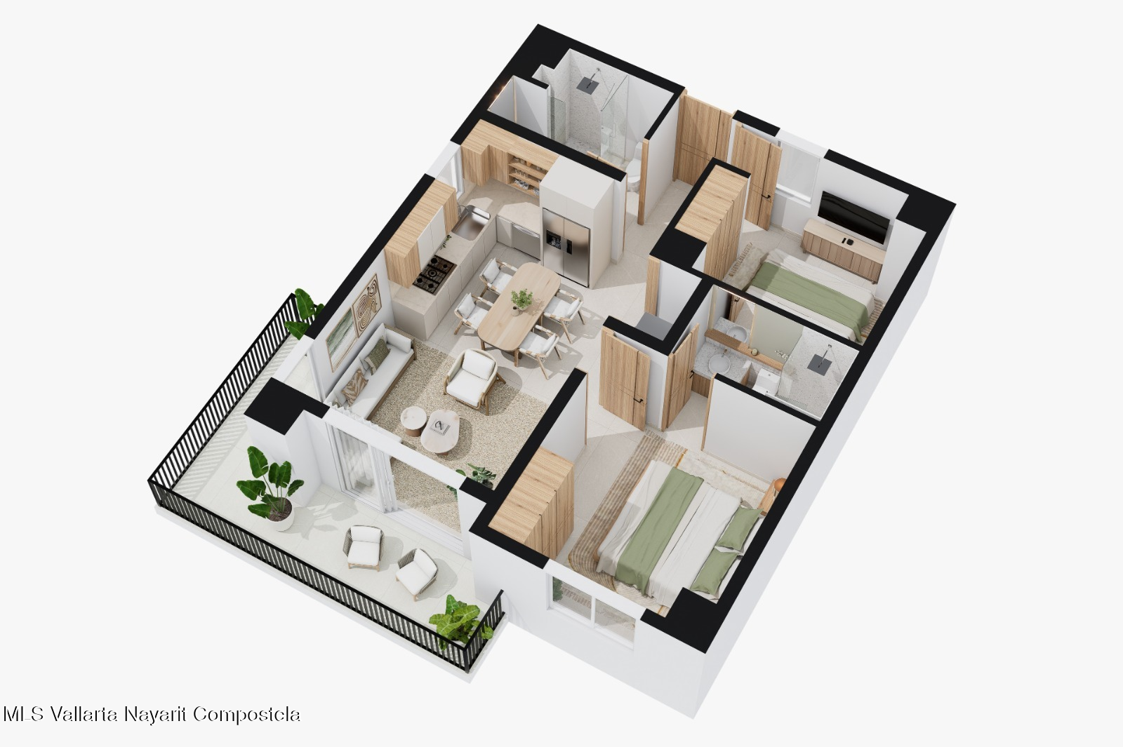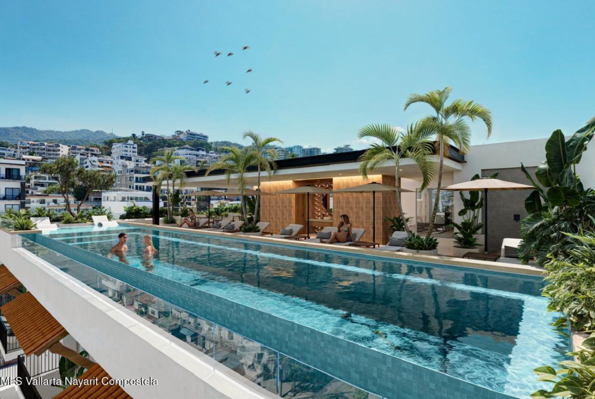 Condo 504 is a 2-bedroom, 2-bath condominium located on the corner of the building, featuring a spacious wraparound terrace along Honduras and Colombia Streets with views to the bay and mountains. Just two blocks from the beach, its well-planned layout combines functionality and comfort for everyday living. Alero is a boutique pre-construction development in the 5 de Diciembre neighborhood, with only 26 condominiums across six levels, offering studios, one- and two-bedroom layouts. Amenities include a welcoming lobby, an interior garden inspired by Vallarta’s traditional architecture, and a rooftop with infinity pool, gym, lounge, BBQ area, and 360 panoramic views. Secure it now with pre-construction discounts starting at 12% with multiple payment plan options available.