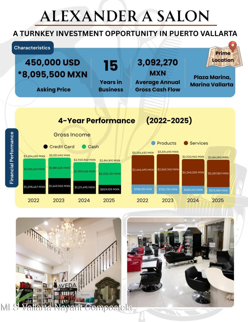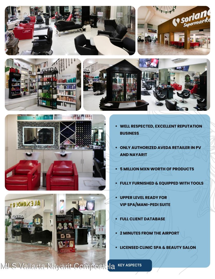 Business Opportunity – Alexander A Salon, Plaza Marina This is a rare opportunity to invest in a successful, established business with over 14 years of operation and an excellent reputation. This is more than just a salon–it’s a thriving, well-respected business with a loyal client base. With its high visibility and proven success, you’re not buying a location-you’re stepping into a profitable, turn-key opportunity, ready for your vision to grow it even further. Prime LocationLocated at the heart of Marina Vallarta, between Puerto Vallarta International Airport just 2 minutes away and the city’s historic downtown. The salon sits in Plaza Marina, ideally positioned next to Soriana grocery shop, and surrounded by banks, dentists, lawyers, and other essential service businesses.