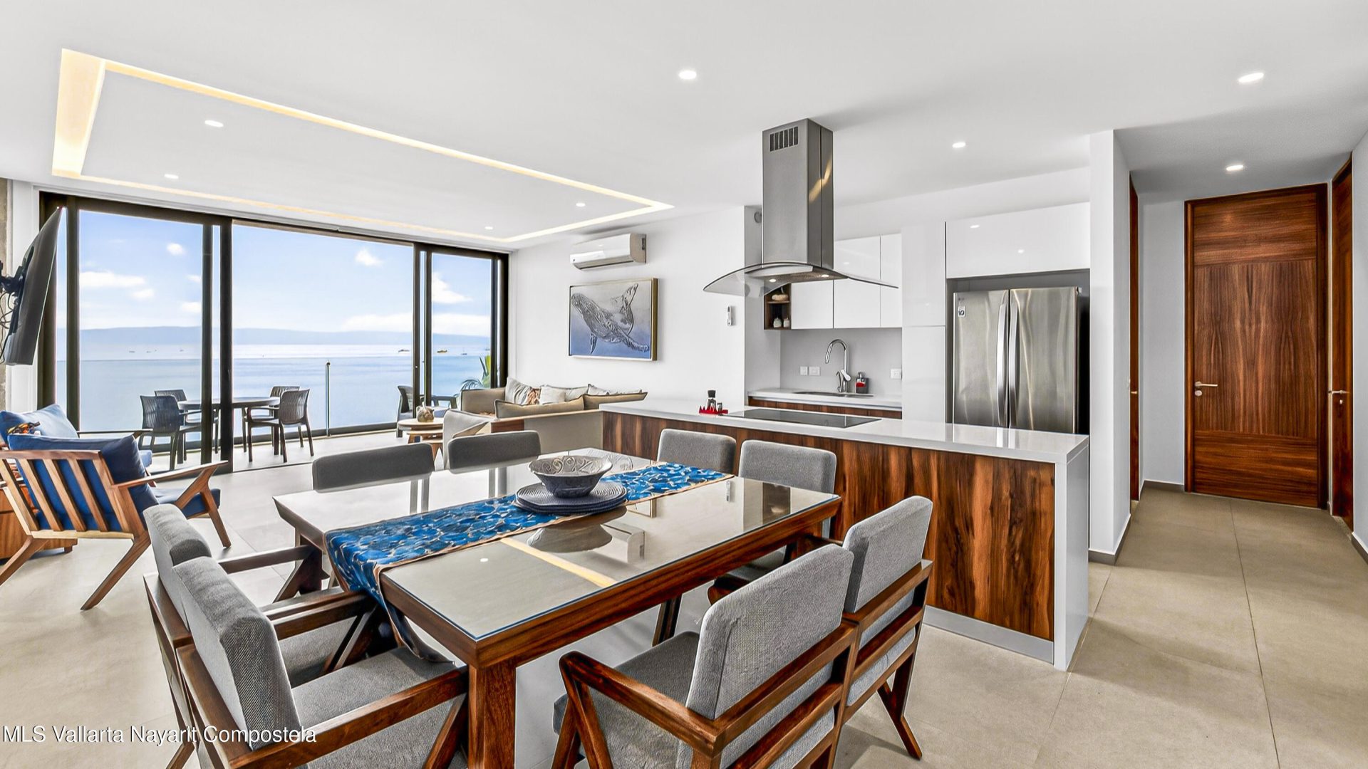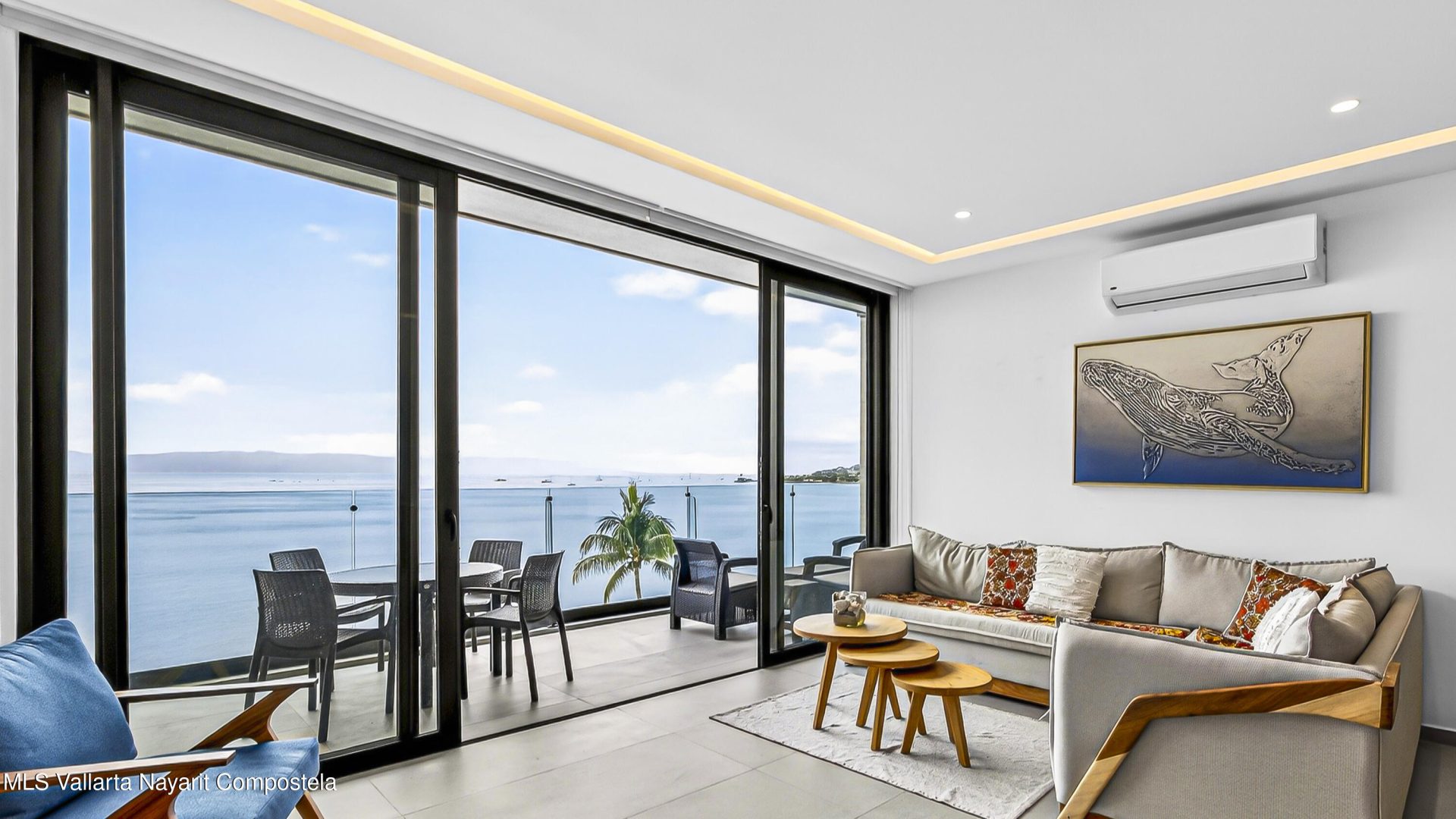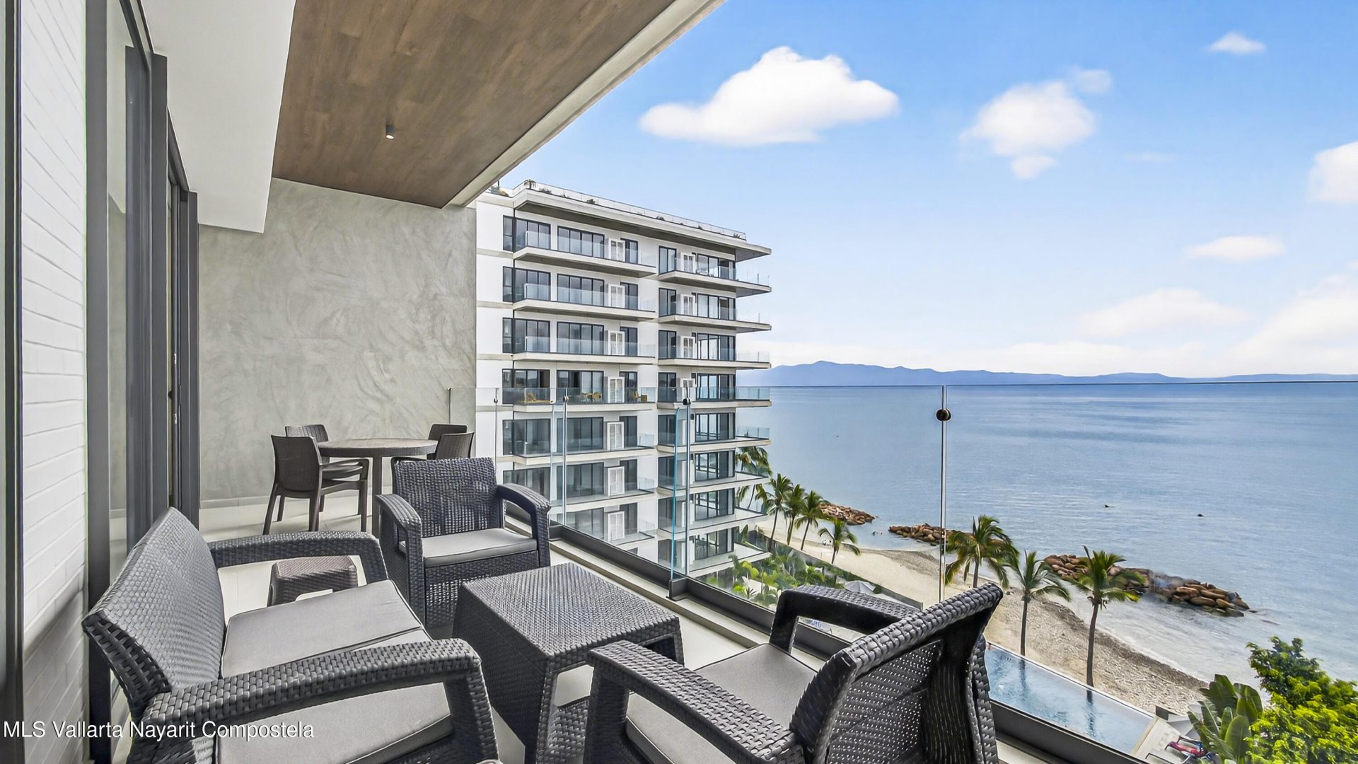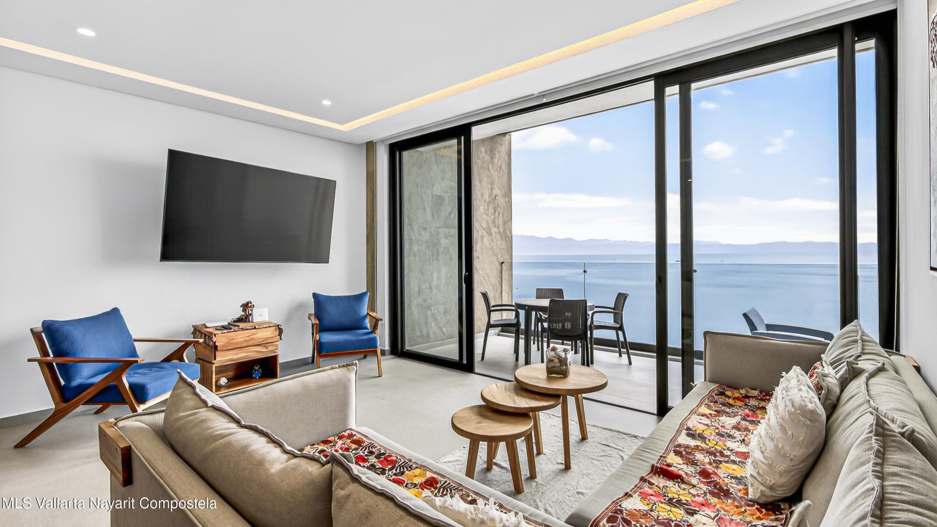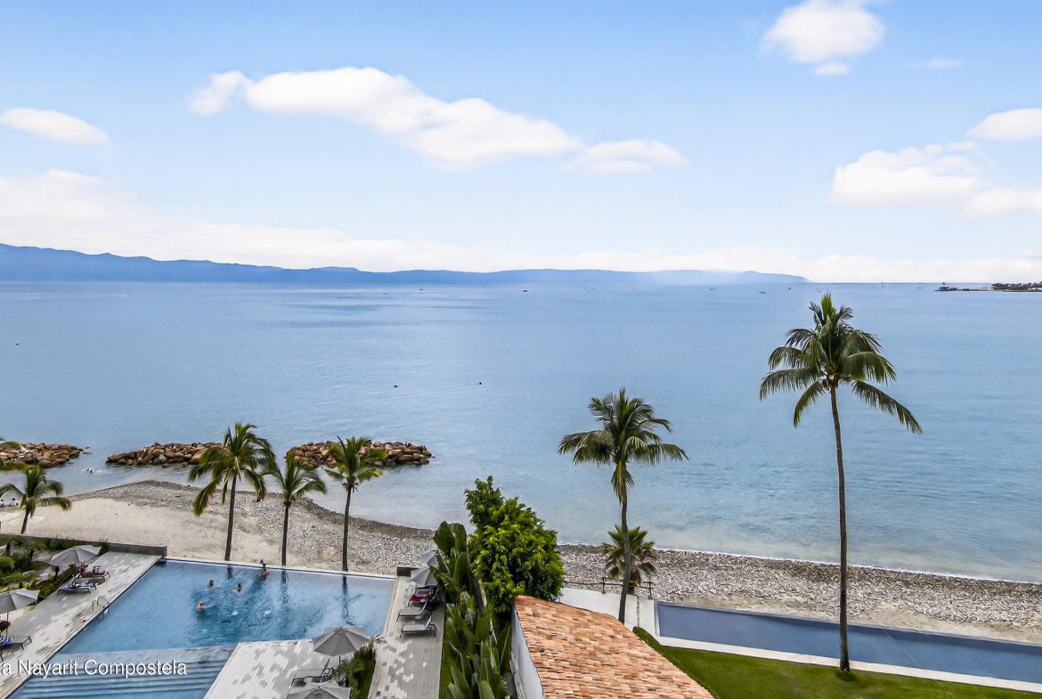 Experience beach front luxury at Arama Bay B505. This 3-bedrrom, 3-bathroom sanctuary features a seamless open-concept design where floor-to-ceiling glass frames breathtaking views of Banderas Bay. The gourment kitchen boast a waterfall-edge island and premium appliances.Retreat to the master suite with custom wood cabinetry or versatile guest rooms twin and bunk beds. Relax in spa-like bathrooms with dual vanities and stone finishes.Step onto your private terrace for whale watching or head to the rooftop terrace. The building offers elite amenities including multiple infinity-edge hot tubs and plush loungers overlooking the sea. Residents will enjoy one-of-a-kind pool with stunning ocean views, a fully equipped gym, and a business center.