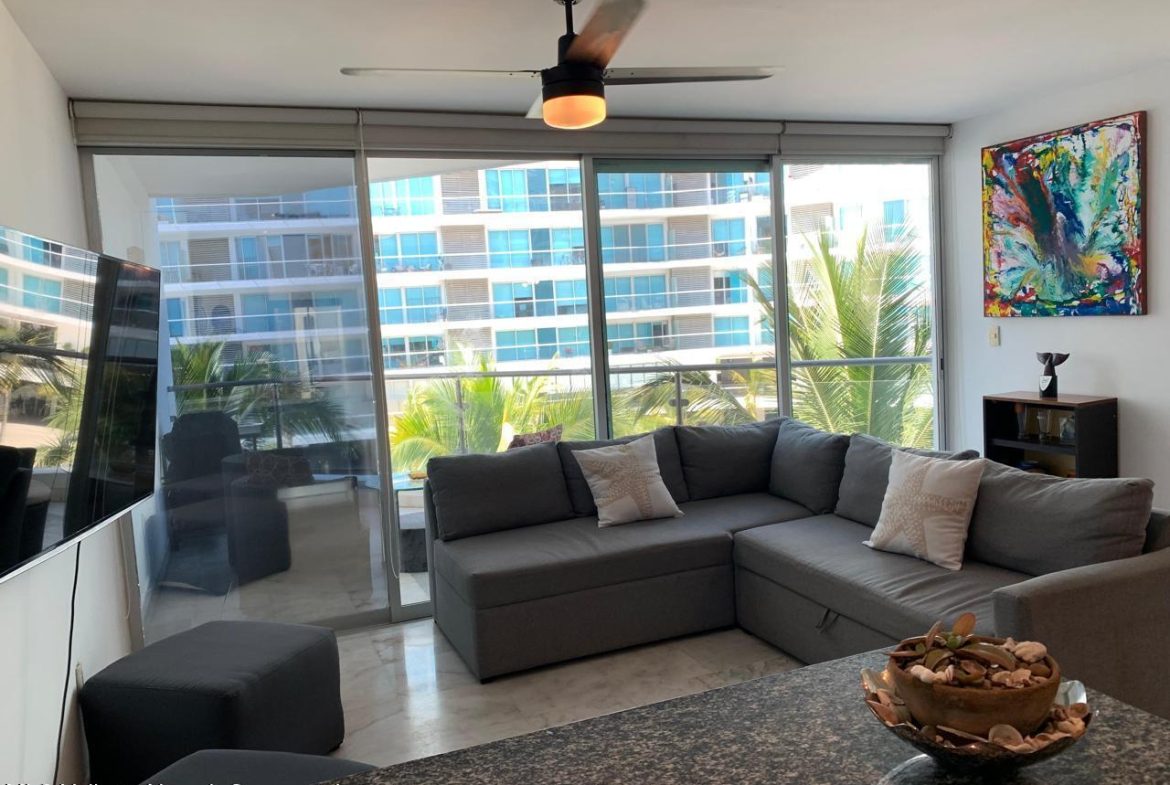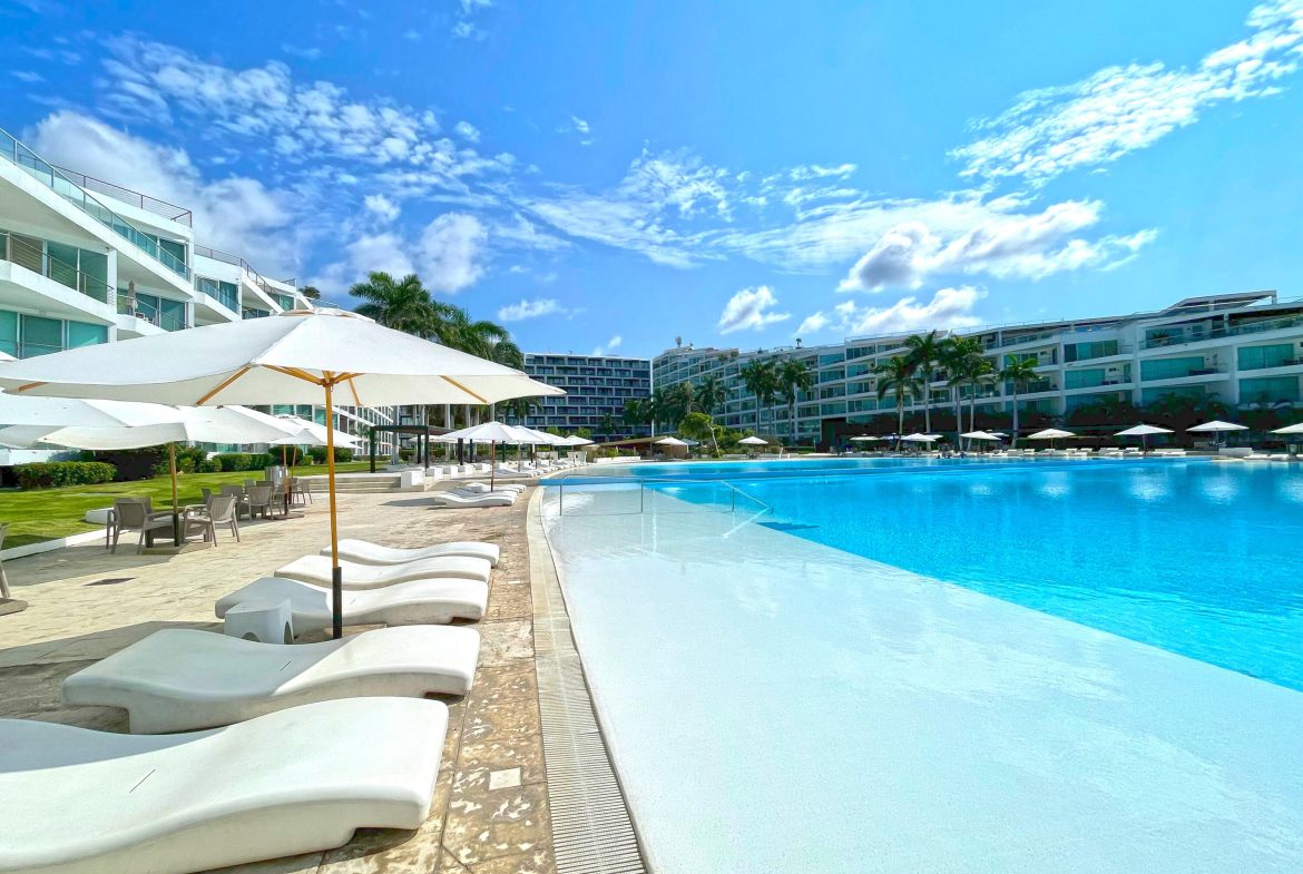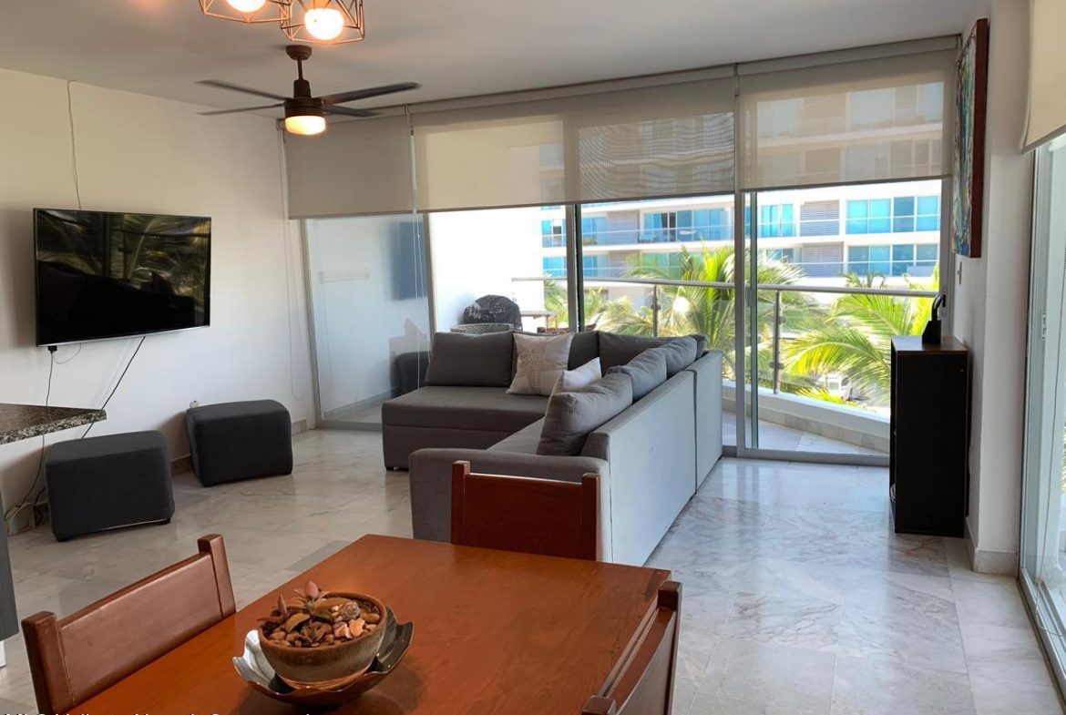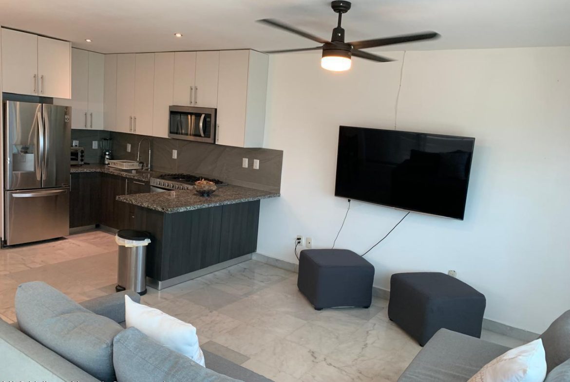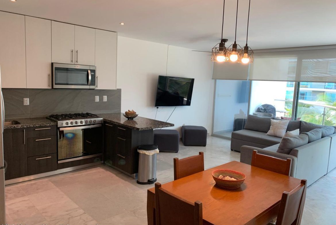 On the pristine beach of Nuevo Vallarta in Bahia de Banderas is this Beautiful beachfront 2 bedroom 2 bath condo, set on the long white sand beaches of Flamingos, Nuevo Vallarta in Condo Aria Ocean. The calm surf invites you to come take a dip in the warm water or simply lounge around one of the two large infinity pools or the smaller pool set right on the sand. The beautiful grounds filled with palm trees, plants, flowers and a large fountain make this a truly calming space. This turnkey condo has been completely remodeled. Additionally the 2 large balconies with make for a great outdoor space with privacy to rest or have a BBQ.