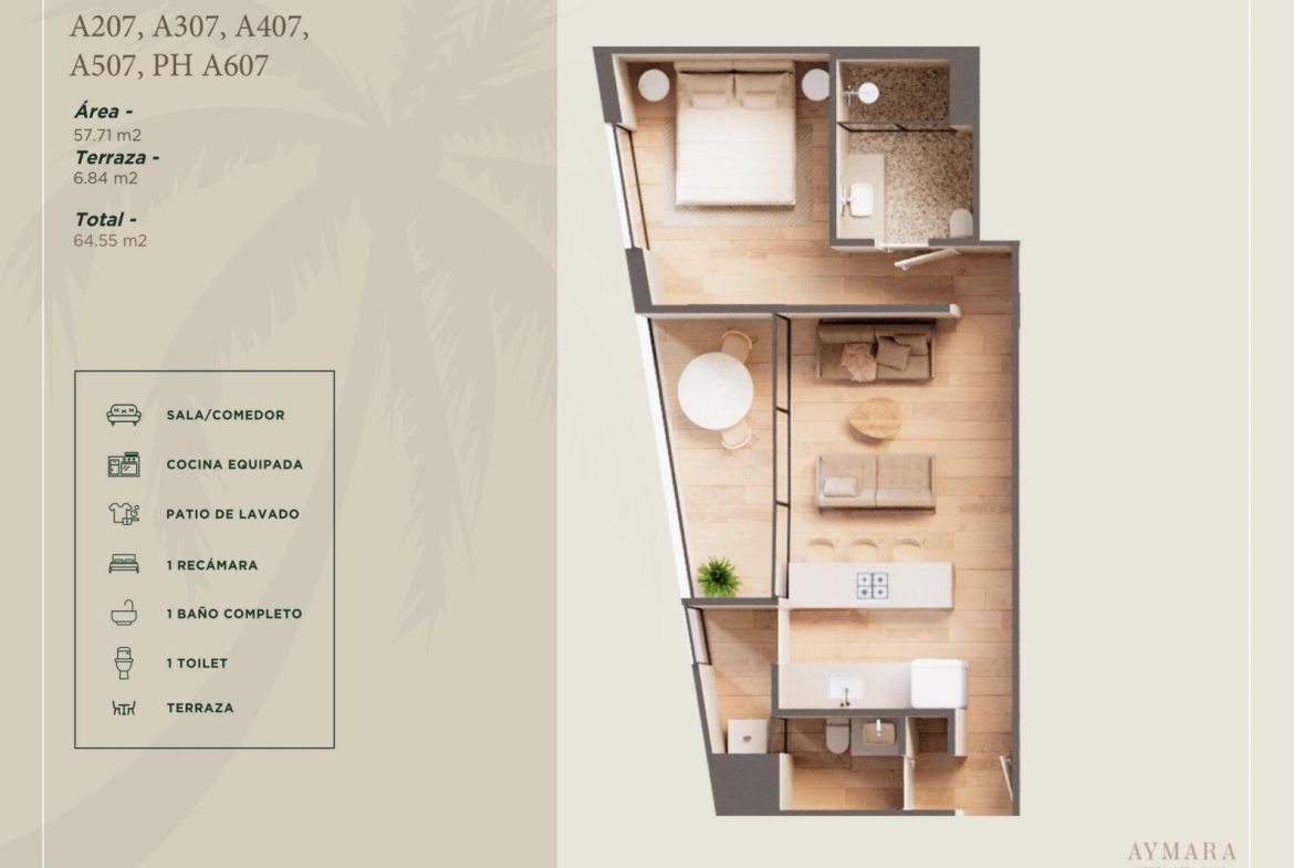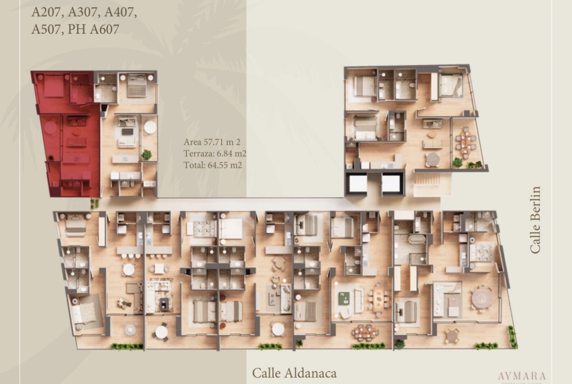 Aymara Versalles, ubicado en el centro de la Colonia Versalles, Sobre calle Aldanaca yBerlin, es un proyecto unico y exclusivo que consta de 43 espectaculares departamentos y7 locales comerciales con una propuesta y diseno inigualable. Los departamentos tienen un area desde 64.55 m2 hasta los 143.88 m2. Se configura el edificio de 12 unidades de unarecamara y 1.5 Banos (Tipo A). Hay 16 unidades de 2 recamaras 2 banos completos (Tipo B). 5 unidades de 2 recamaras 2.5 Banos completos (Tipo B+), y 10 unidades de 3 recamaras 3 banos completos (Tipo C).Los acabados premium, las amplias terrazas, las increibles areas comunes, las encantadoras vistas y todo aquello que conforma el proyecto lo hace ser la mejor Inversion