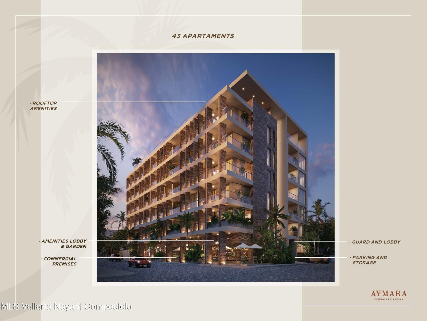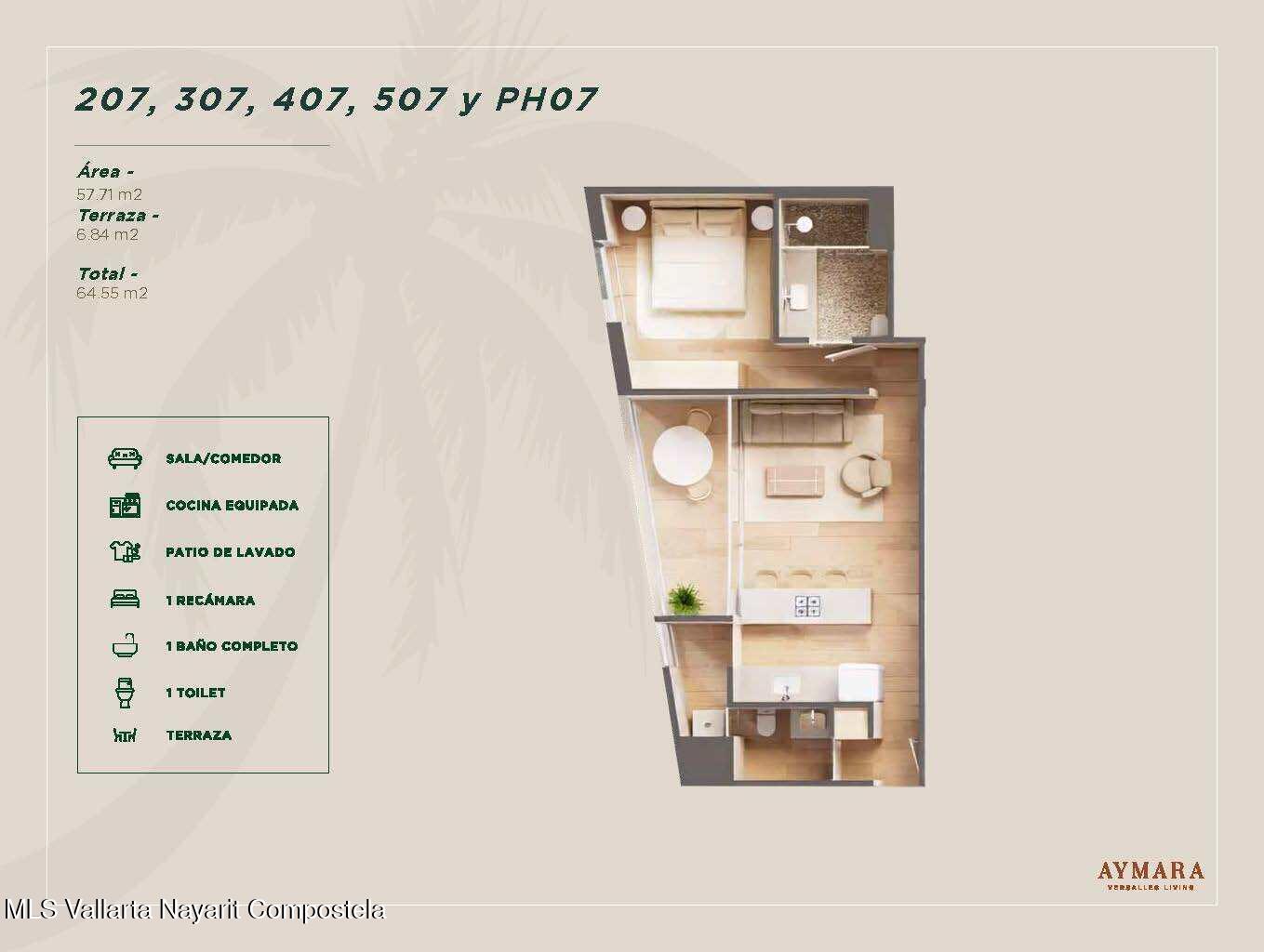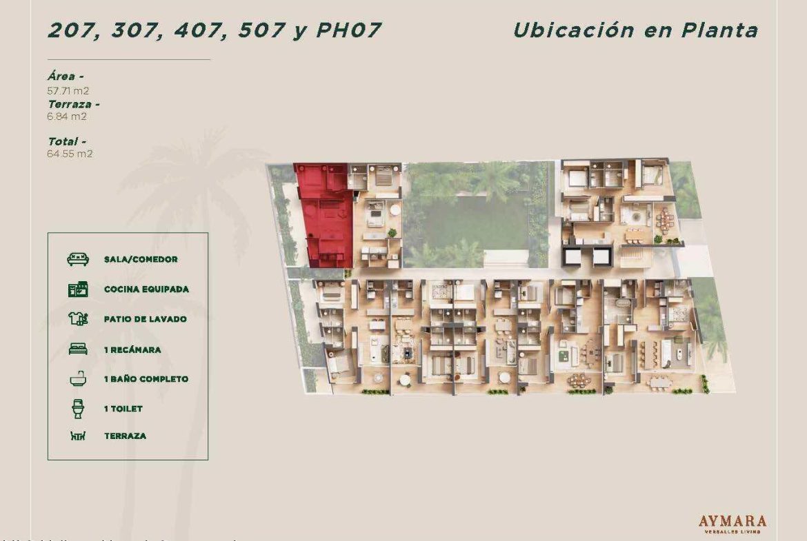 Aymara Versalles se encuentra en el corazon de la Colonia Versalles, en las calles Aldanaca y Berlin, una de las zonas de mas rapido crecimiento de Puerto Vallarta. El complejo cuenta con 43 unidades residenciales y una selecta variedad de practicos locales comerciales, dentro de un concepto moderno que combina un diseno cuidado, funcionalidad y una ubicacion muy conveniente. Las residencias tienen entre 64,55 m2 y 143,88 m2, con distribuciones de 1, 2 y 3 dormitorios disenadas tanto para una vida comoda como para un solido potencial de inversion. El proyecto ofrece acabados de alta calidad, amplias terrazas y acogedoras zonas comunes que complementan el dinamico estilo de