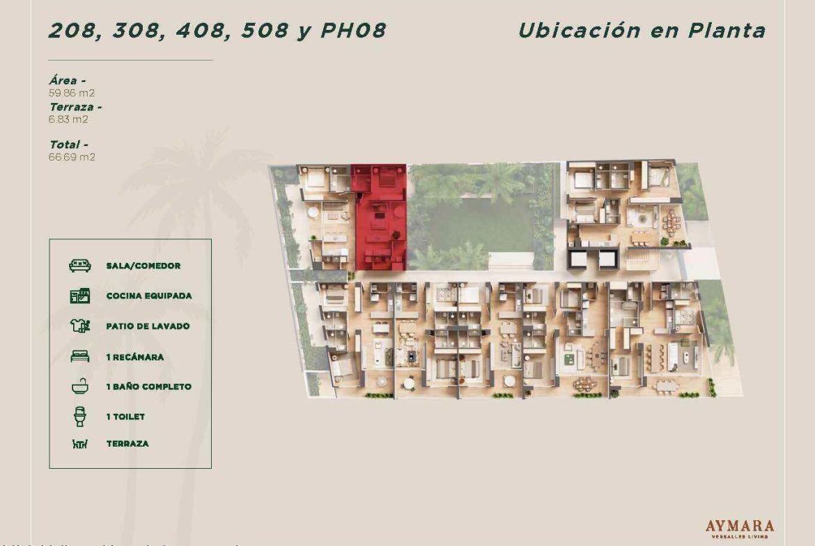Aymara Versalles se encuentra en el corazon de la Colonia Versalles, en las calles Aldanaca y Berlin, una de las zonas de mas rapido crecimiento de Puerto Vallarta. El complejo cuenta con 43 unidades residenciales y una selecta variedad de practicos locales comerciales, dentro de un concepto moderno que combina un diseno cuidado, funcionalidad y una ubicacion muy conveniente. Las residencias tienen entre 64,55 m2 y 143,88 m2, con distribuciones de 1, 2 y 3 dormitorios disenadas tanto para una vida comoda como para un solido potencial de inversion. El proyecto ofrece acabados de alta calidad, amplias terrazas y acogedoras zonas comunes que complementan el dinamico estilo de