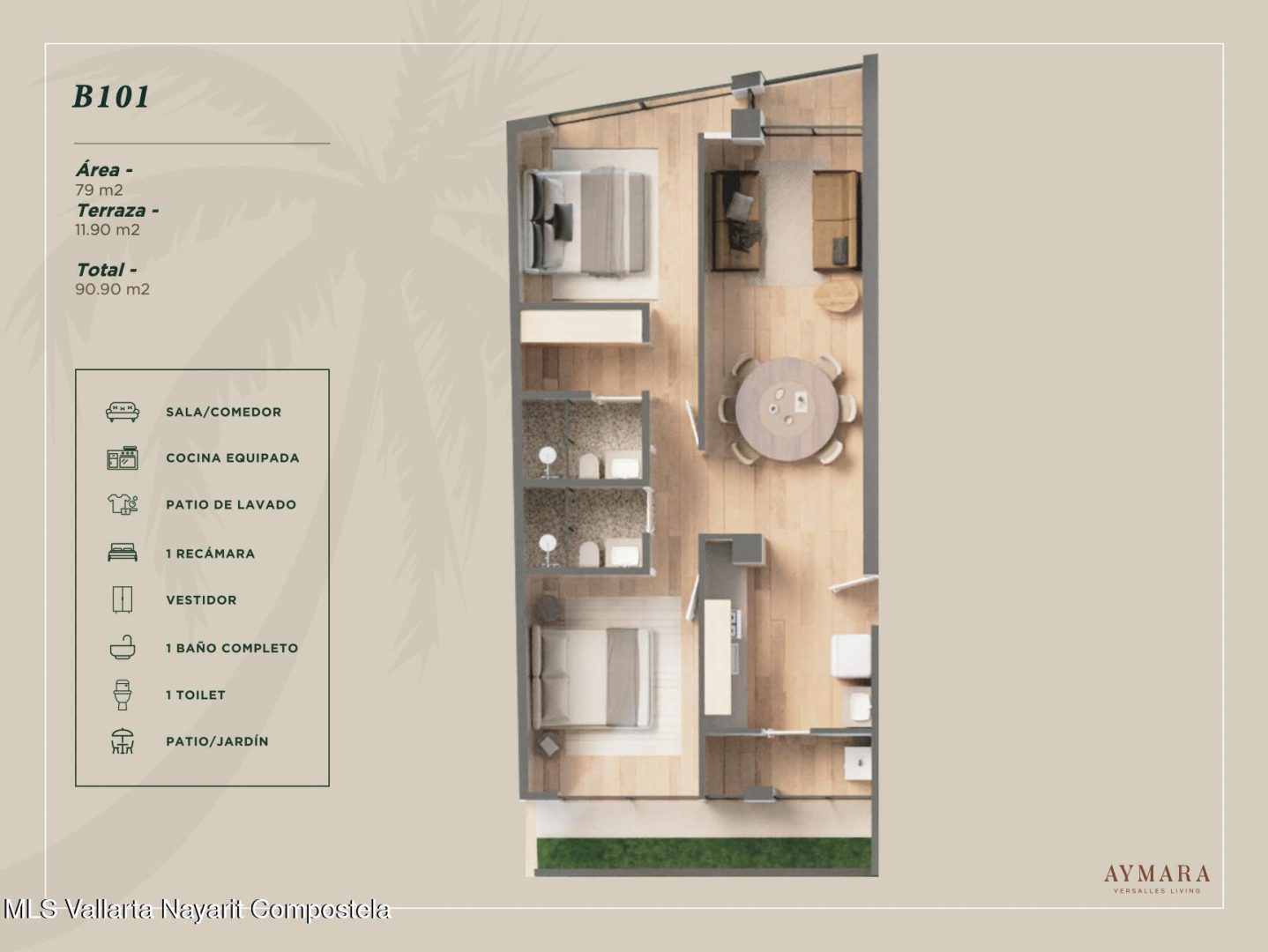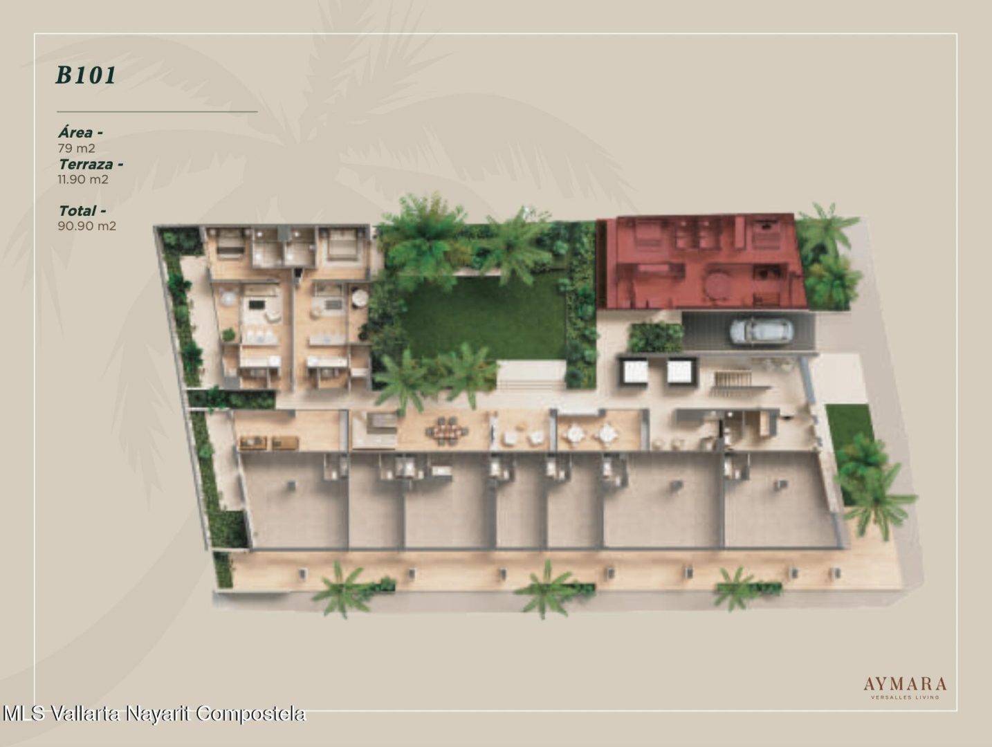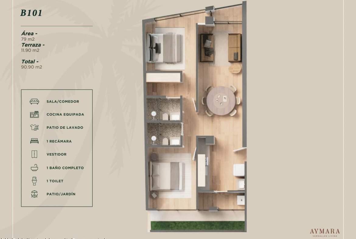 Aymara Versalles se encuentra en el corazon de la Colonia Versalles, en las calles Aldanaca y Berlin, una de las zonas de mas rapido crecimiento de Puerto Vallarta. El complejo cuenta con 43 unidades residenciales y una selecta variedad de practicos locales comerciales, dentro de un concepto moderno que combina un diseno cuidado, funcionalidad y una ubicacion muy conveniente. Las residencias tienen entre 64,55 m2 y 143,88 m2, con distribuciones de 1, 2 y 3 dormitorios disenadas tanto para una vida comoda como para un solido potencial de inversion. El proyecto ofrece acabados de alta calidad, amplias terrazas y acogedoras zonas comunes que complementan el dinamico estilo de