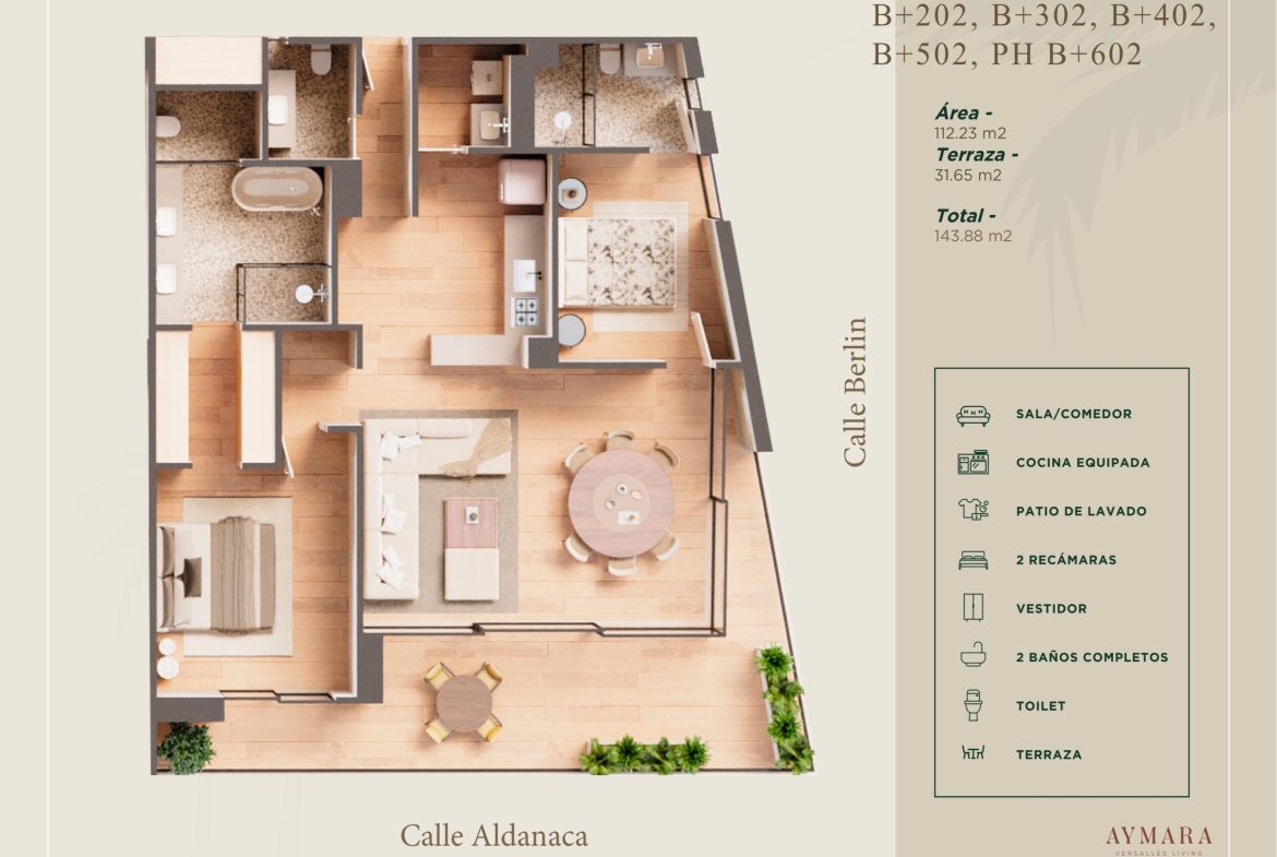 Aymara Versalles se encuentra en el corazon de la Colonia Versalles, en las calles Aldanaca y Berlin, una de las zonas de mas rapido crecimiento de Puerto Vallarta. El complejo cuenta con 43 unidades residenciales y una selecta variedad de practicos locales comerciales, dentro de un concepto moderno que combina un diseno cuidado, funcionalidad y una ubicacion muy conveniente. Las residencias tienen entre 64,55 m2 y 143,88 m2, con distribuciones de 1, 2 y 3 dormitorios disenadas tanto para una vida comoda como para un solido potencial de inversion. El proyecto ofrece acabados de alta calidad, amplias terrazas y acogedoras zonas comunes que complementan el dinamico estilo de