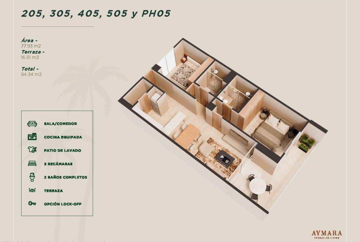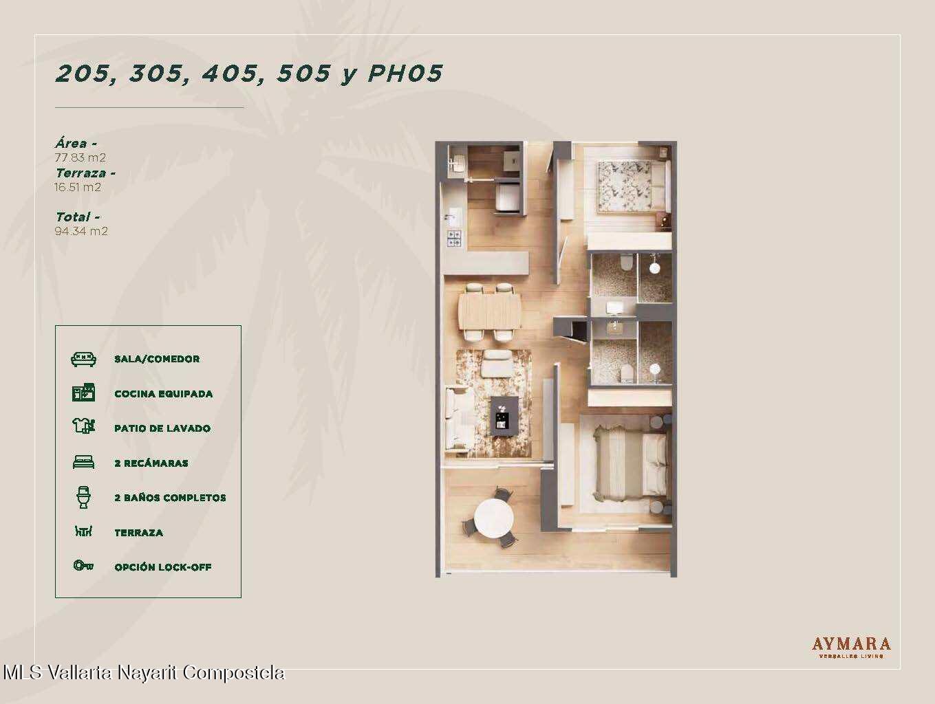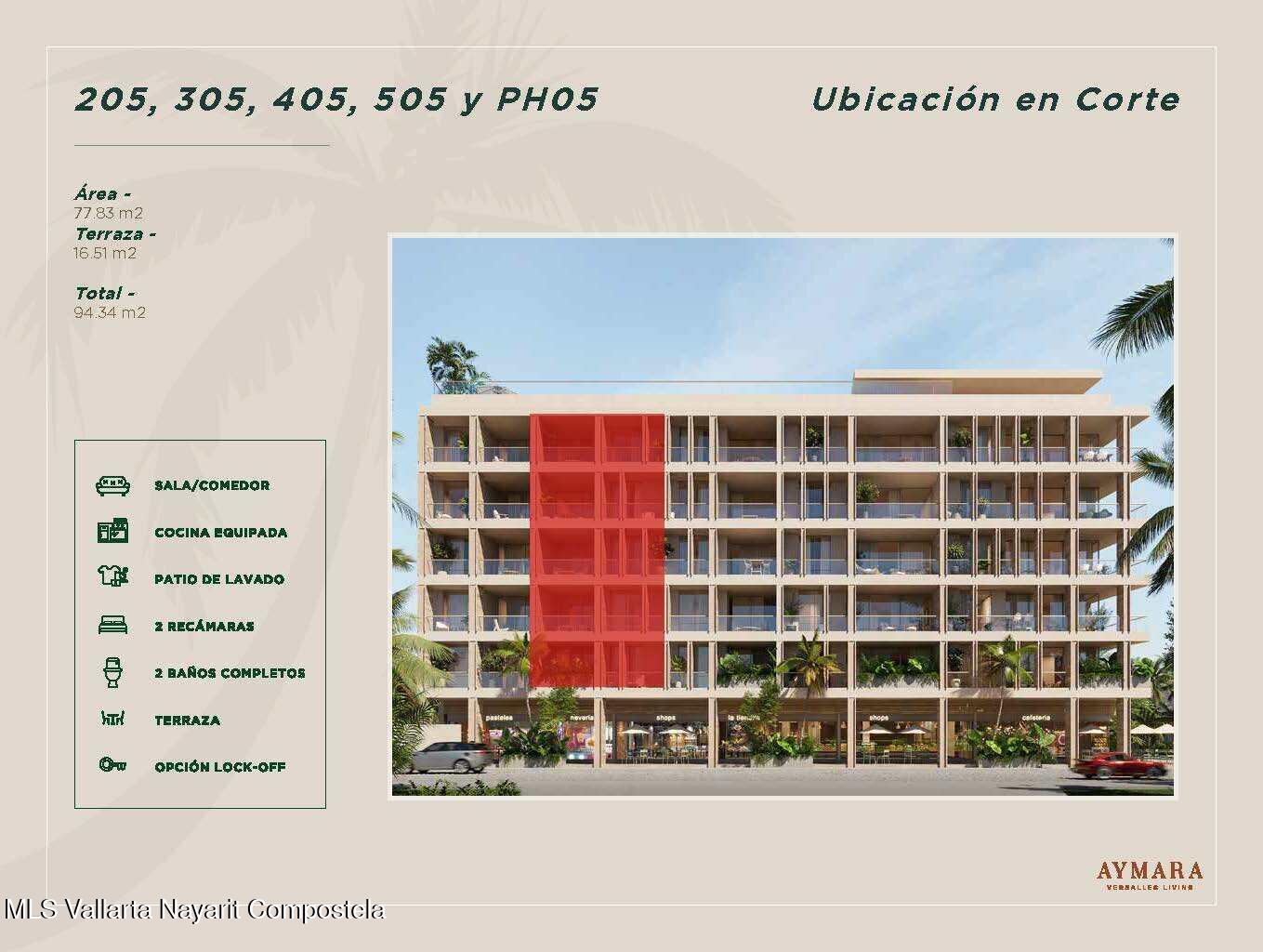 Aymara Versalles se encuentra en el corazon de la Colonia Versalles, en las calles Aldanaca y Berlin, una de las zonas de mas rapido crecimiento de Puerto Vallarta. El complejo cuenta con 43 unidades residenciales y una selecta variedad de practicos locales comerciales, dentro de un concepto moderno que combina un diseno cuidado, funcionalidad y una ubicacion muy conveniente. Las residencias tienen entre 64,55 m2 y 143,88 m2, con distribuciones de 1, 2 y 3 dormitorios disenadas tanto para una vida comoda como para un solido potencial de inversion. El proyecto ofrece acabados de alta calidad, amplias terrazas y acogedoras zonas comunes que complementan el dinamico estilo de