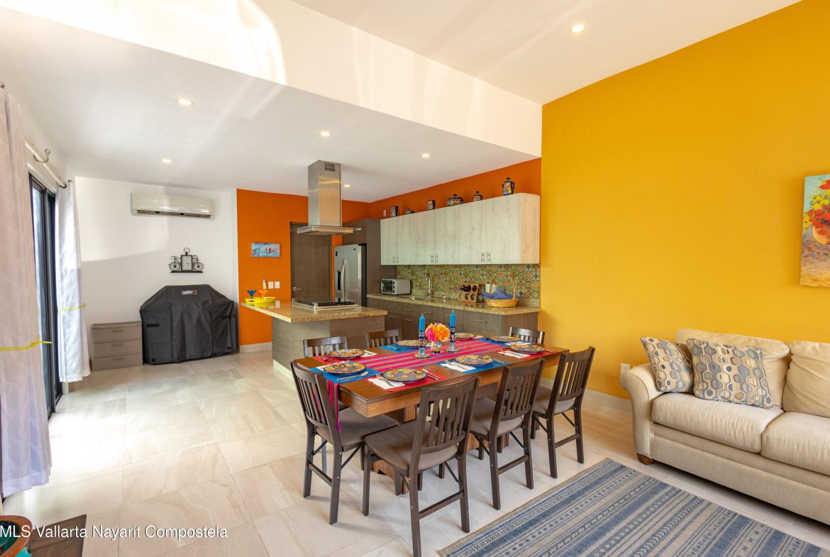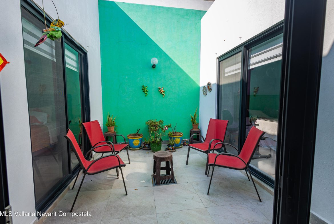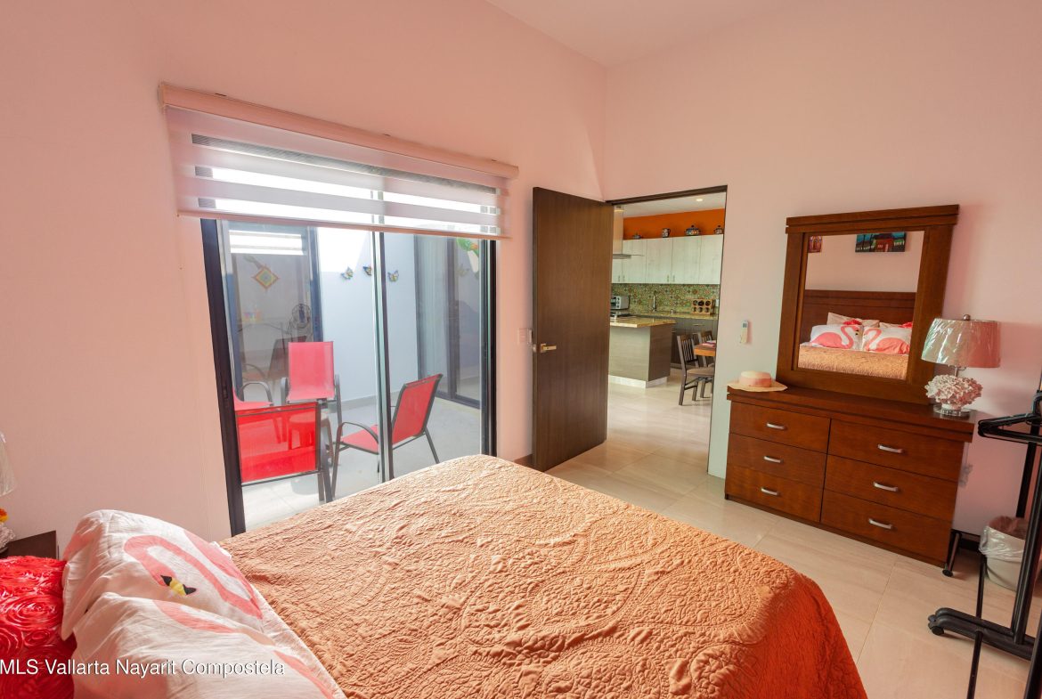 Acogedora casa de una planta en Jarretaderas: 2 recamaras, 2 banos, cocina integral, patio, cuarto de servicio y 2 estacionamientos. Se vende totalmente amueblada y equipada con 12 paneles solares, A/C, ventiladores y lavanderia. Coto con seguridad, alberca y asadores.