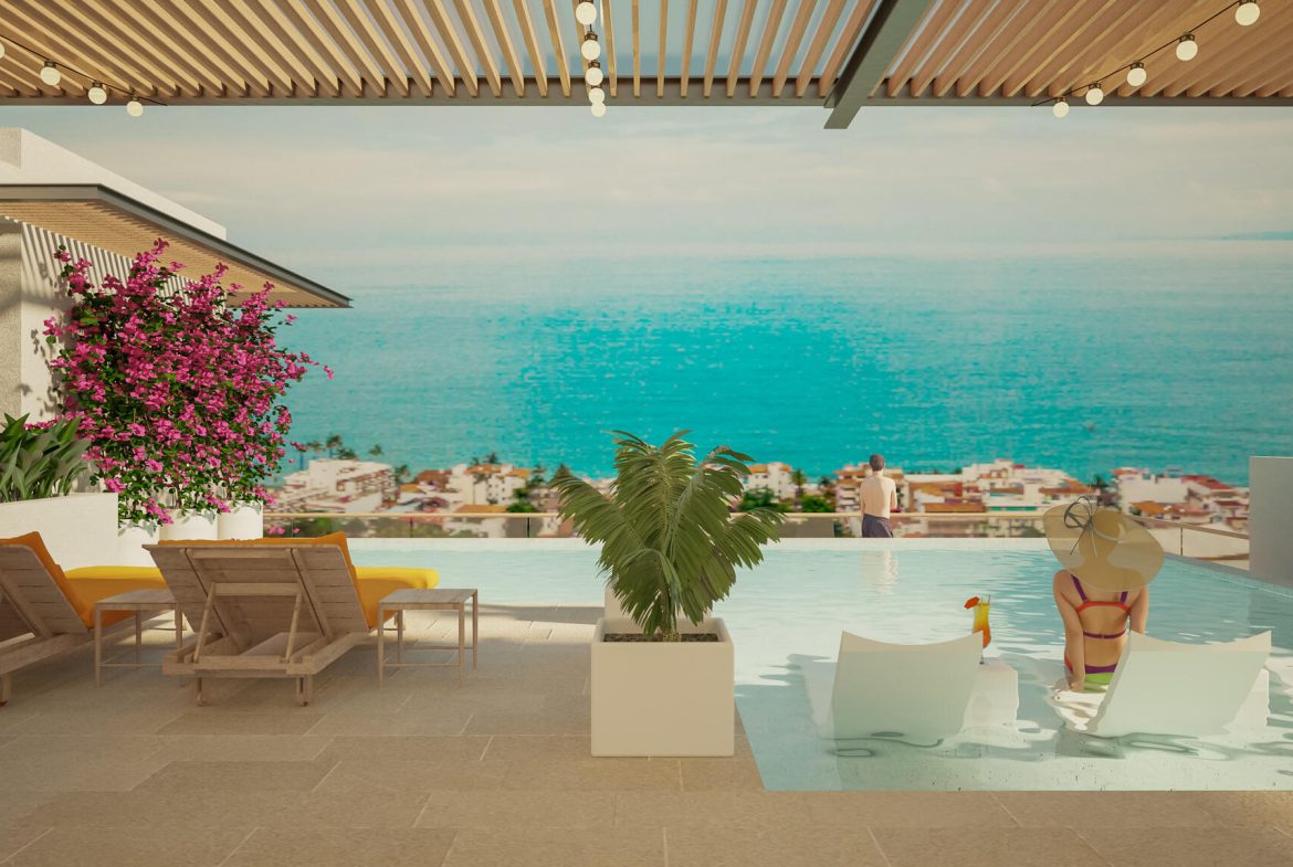 Own one of the best views in Puerto Vallarta. Enjoy the entire panoramic city and bay views during the day from the rooftop pool, sunsets every evening, and see the stunning display of city lights at night. Blue Sky is a luxury development with outstanding finishes. Located just 7 blocks from the beach and the north-end of the Malecon. Walk to restaurants, bars, and shops. The building has elevator, roof top pool and lounge, ocean-view gym, and comes with an in garage parking spot. Penthouse 2 is a spacious ocean view 2-bedroom, 2-bath home.. Enjoy high end luxury materials and fixtures throughout this stylish and spacious floor plan.