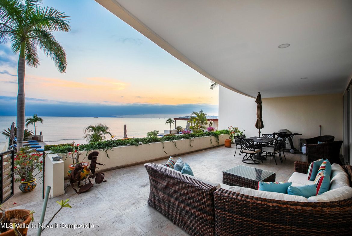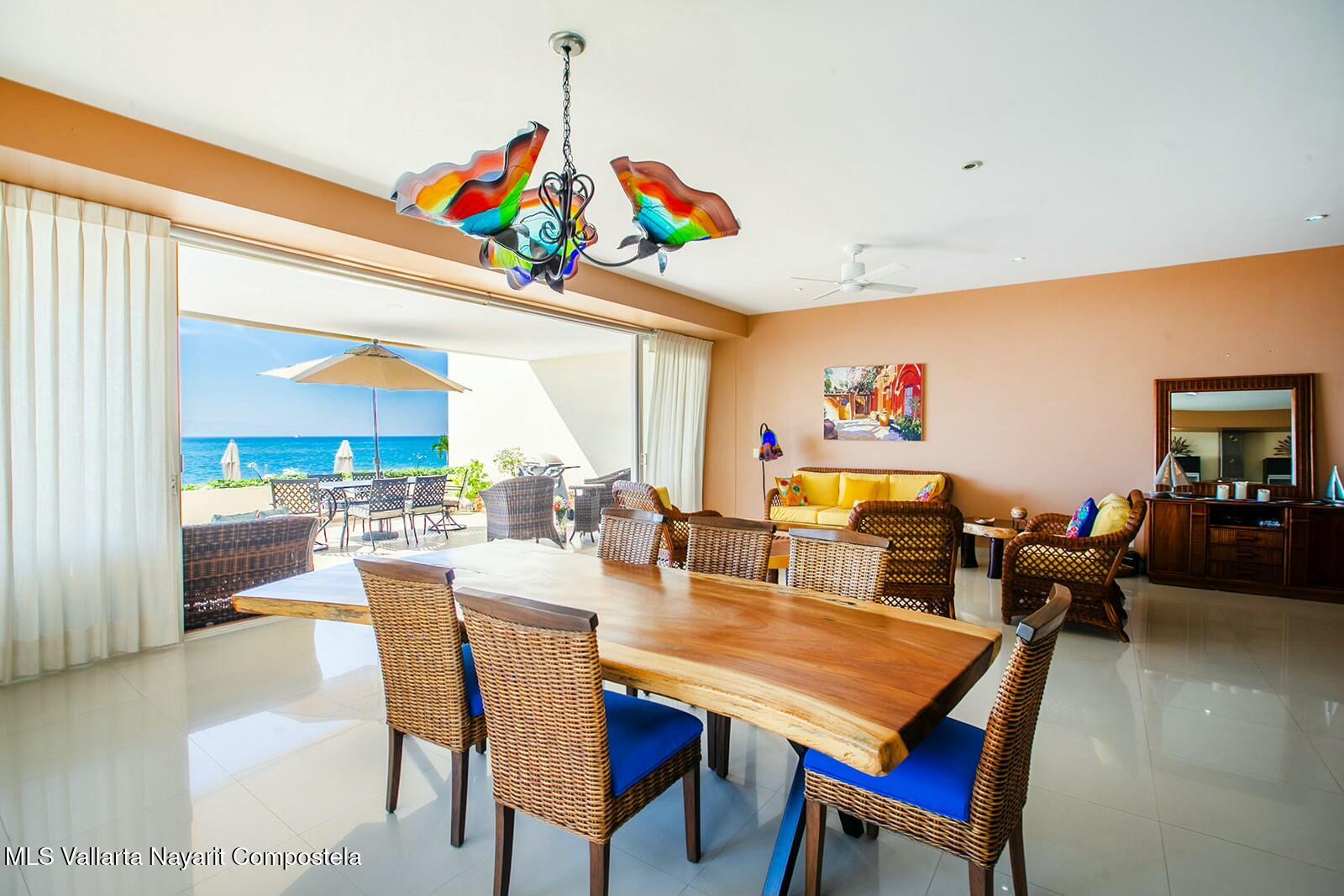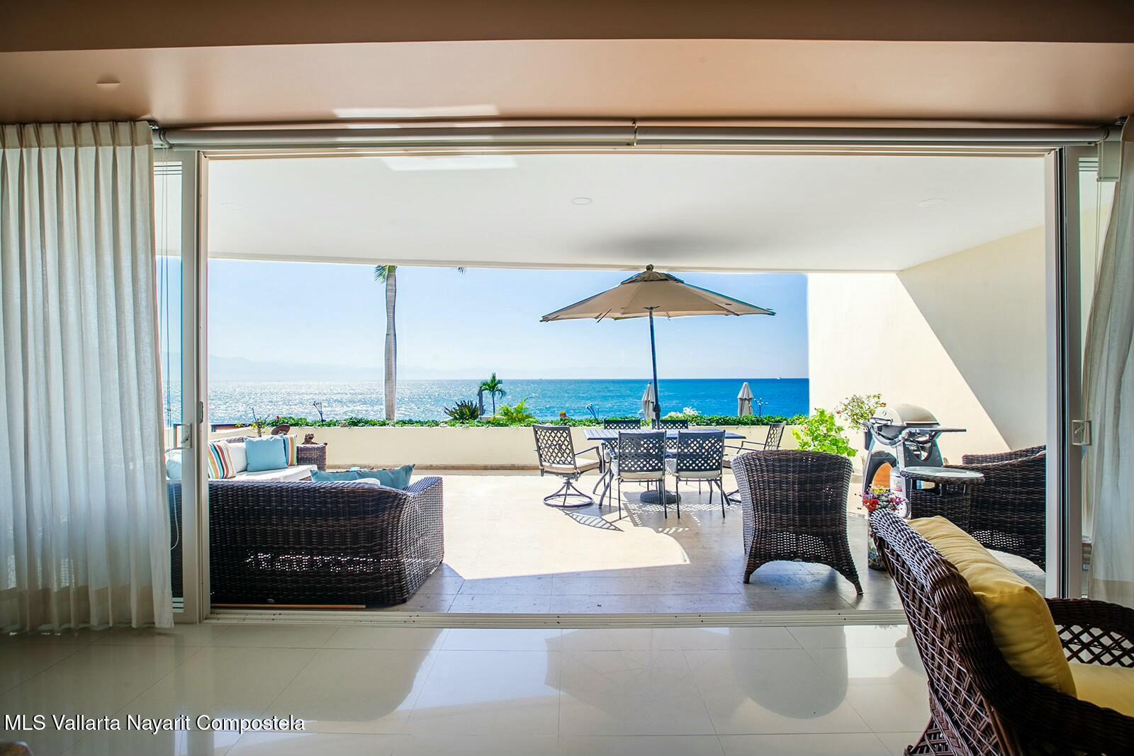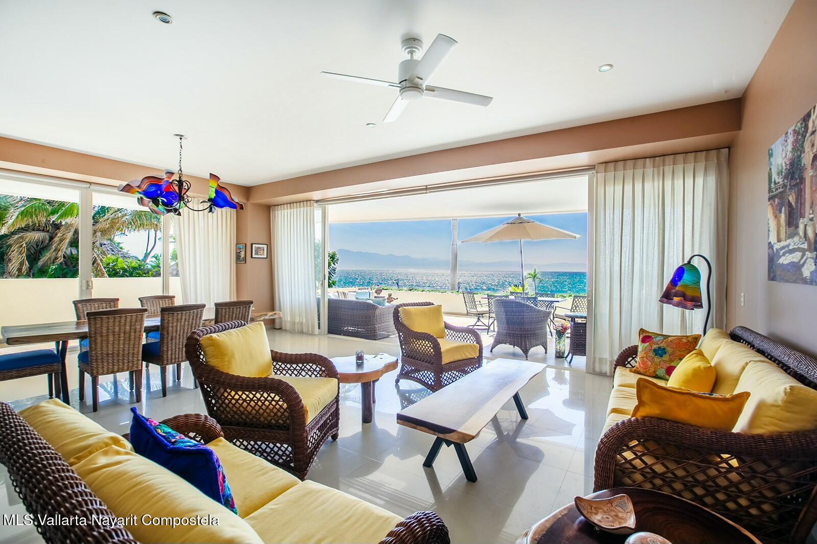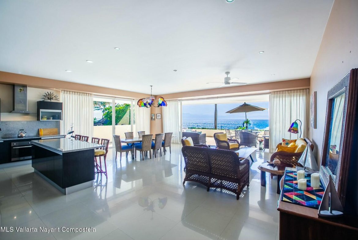 BUCERIAS GRAND PB-APrecious indoor-outdoor living is offered in this sprawling condo with three bedrooms, a studio and four bathrooms just steps from the sandy Bucerias beach in the quiet oceanside residential area north of centro know as Playas de Huanacaxtle. This condo lives like a house, with over 3,600 square feet and has direct access to the beautiful heated pool, lounge and barbeque area. It’s strategically elevated to give it privacy while enjoying endless ocean views from its 41 linear feet of L-shaped windows that wrap around its expansive living, dining and kitchen. It’s terrace frontage spans almost 30 feet. The changing skyline of Vallarta and La Cruz include dramatic sunsets that bathe these living spaces.