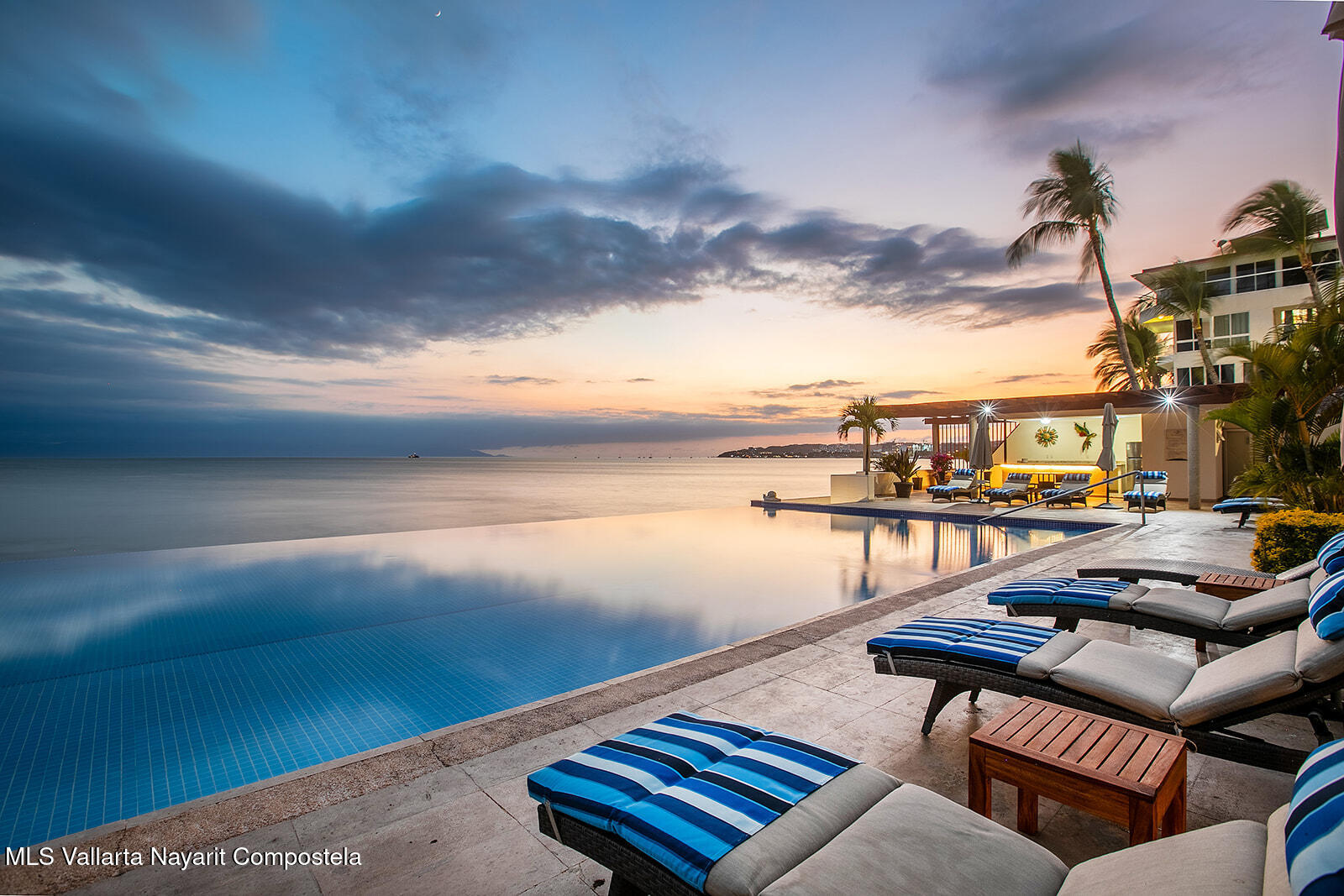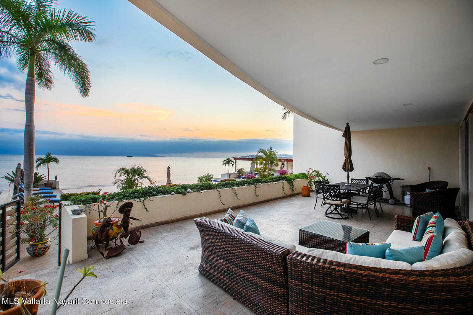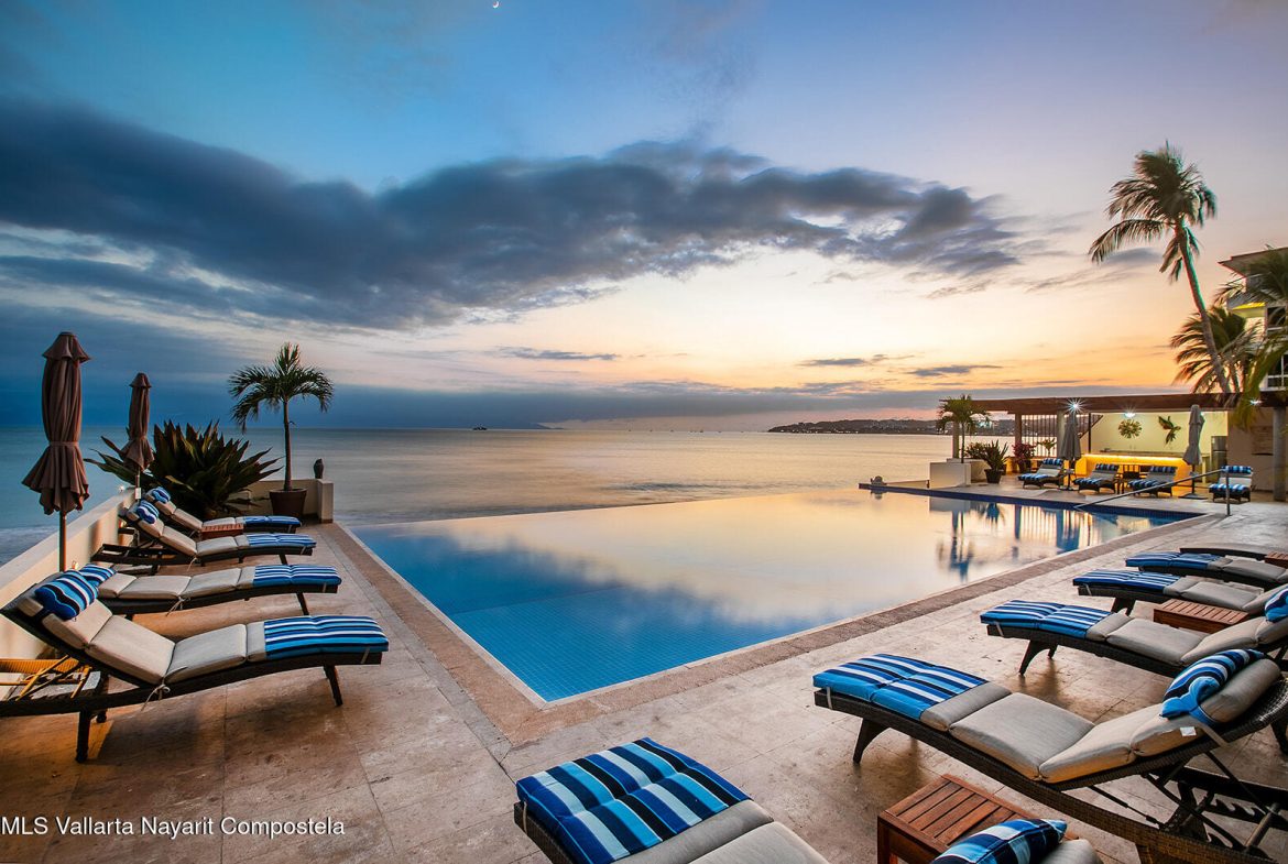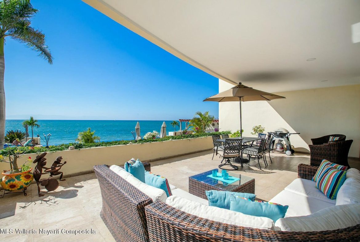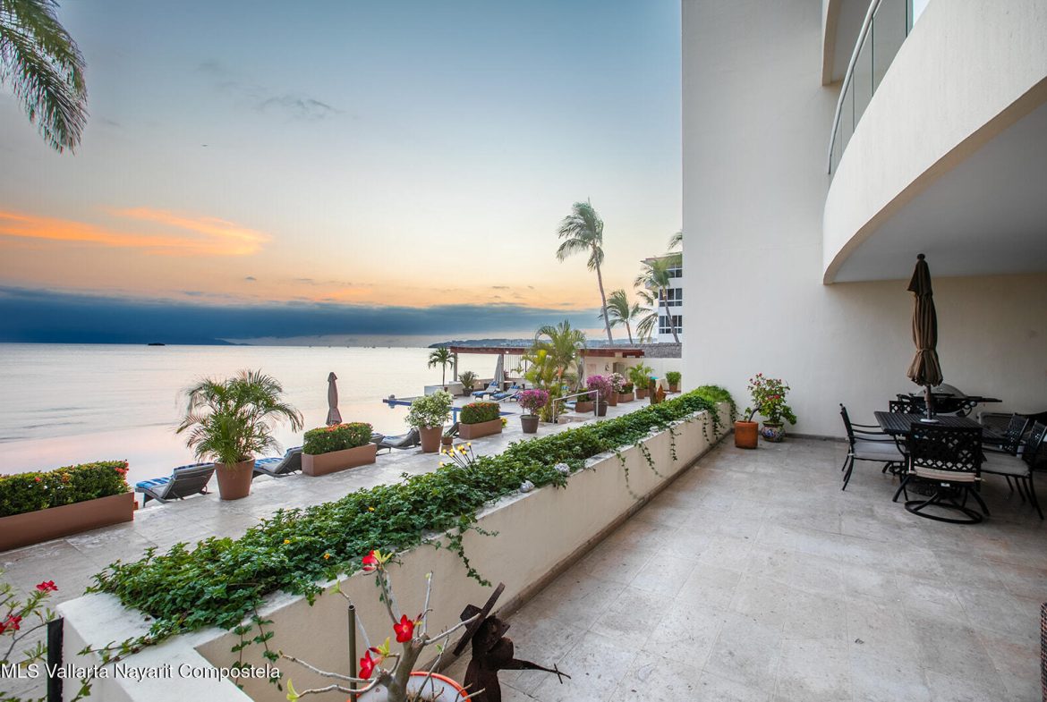 BUCERIAS GRAND PB-APrecious indoor-outdoor living is offered in this sprawling condo with three bedrooms, a studio and four bathrooms just steps from the sandy Bucerias beach in the quiet oceanside residential area north of centro know as Playas de Huanacaxtle. This condo lives like a house, with over 3,600 square feet and has direct access to the beautiful heated pool, lounge and barbeque area. It’s strategically elevated to give it privacy while enjoying endless ocean views from its 41 linear feet of L-shaped windows that wrap around its expansive living, dining and kitchen. It’s terrace frontage spans almost 30 feet. The changing skyline of Vallarta and La Cruz include dramatic sunsets that bathe these living spaces.