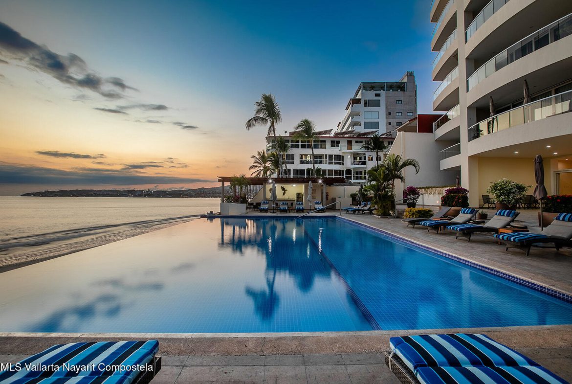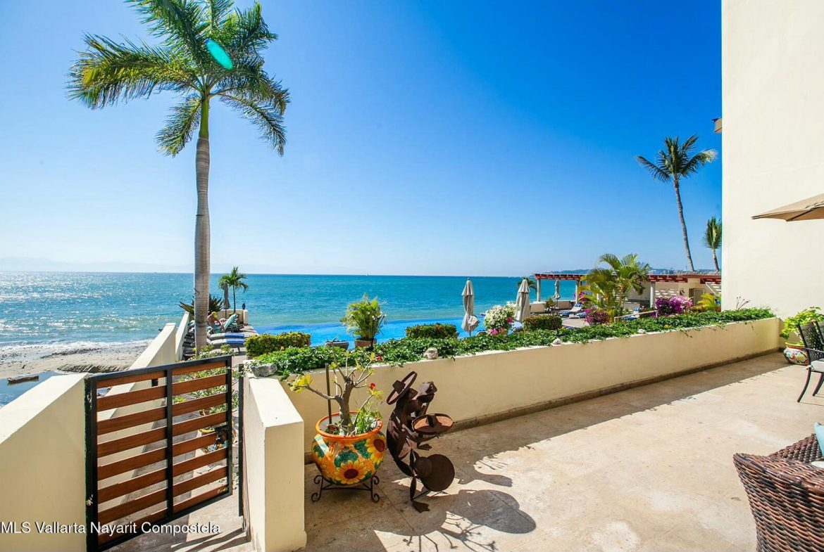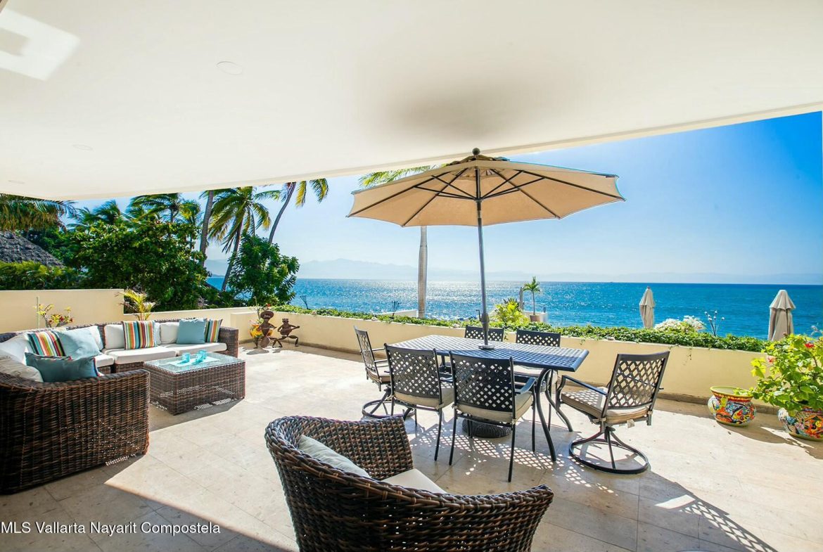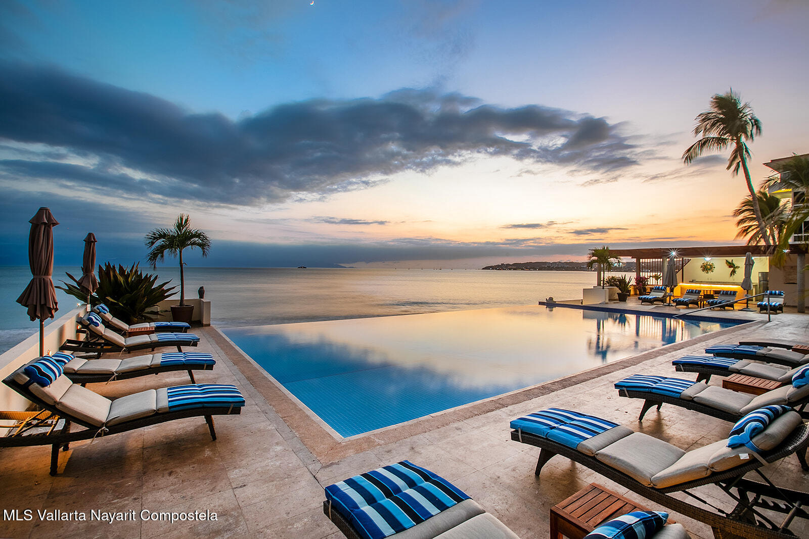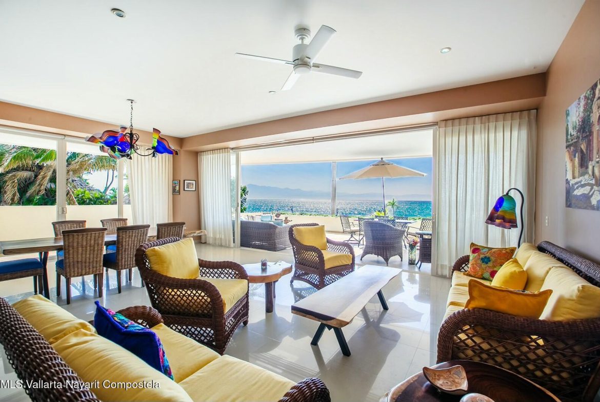 BUCERIAS GRAND PB-APrecious indoor-outdoor living is offered in this sprawling condo with three bedrooms, a studio and four bathrooms just steps from the sandy Bucerias beach in the quiet oceanside residential area north of centro know as Playas de Huanacaxtle. This condo lives like a house, with over 3,600 square feet and has direct access to the beautiful heated pool, lounge and barbeque area. It’s strategically elevated to give it privacy while enjoying endless ocean views from its 41 linear feet of L-shaped windows that wrap around its expansive living, dining and kitchen. It’s terrace frontage spans almost 30 feet. The changing skyline of Vallarta and La Cruz include dramatic sunsets that bathe these living spaces.