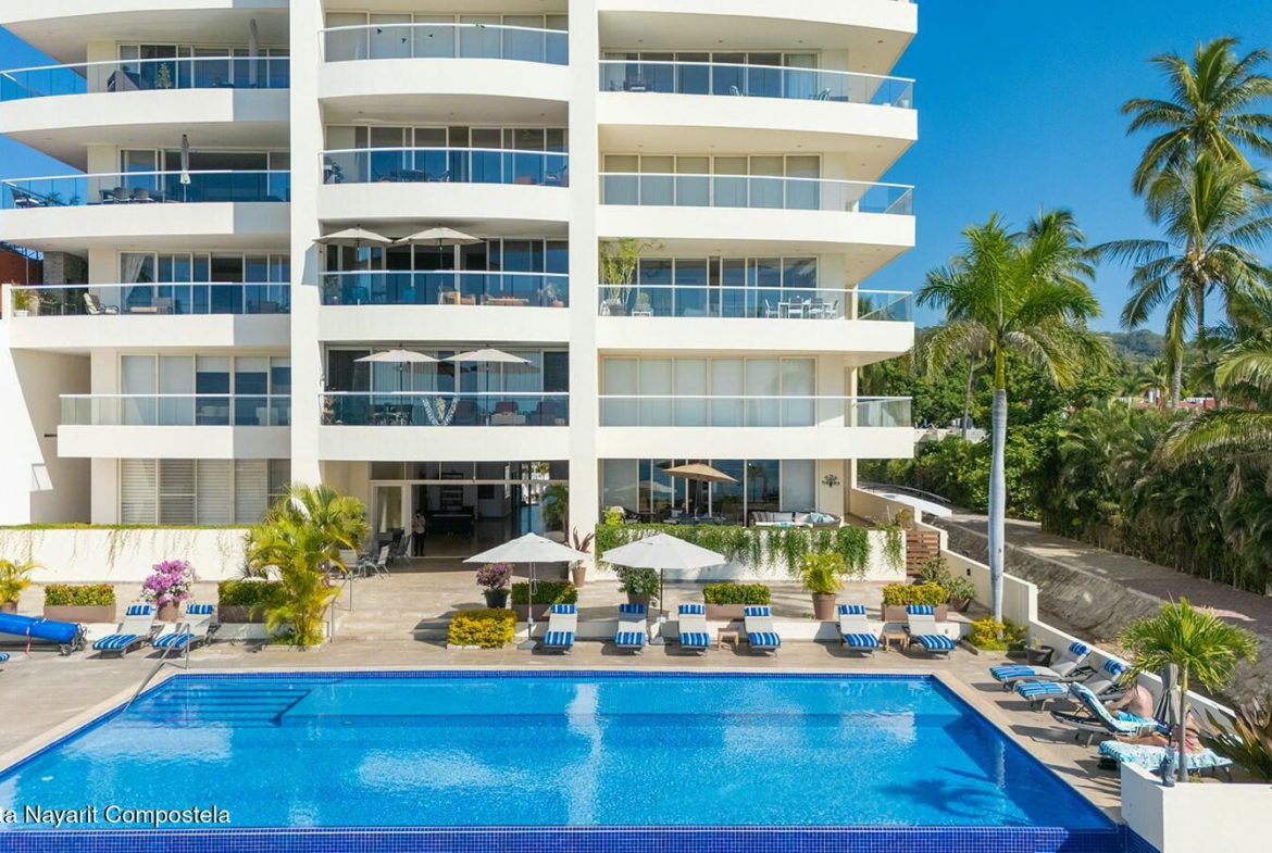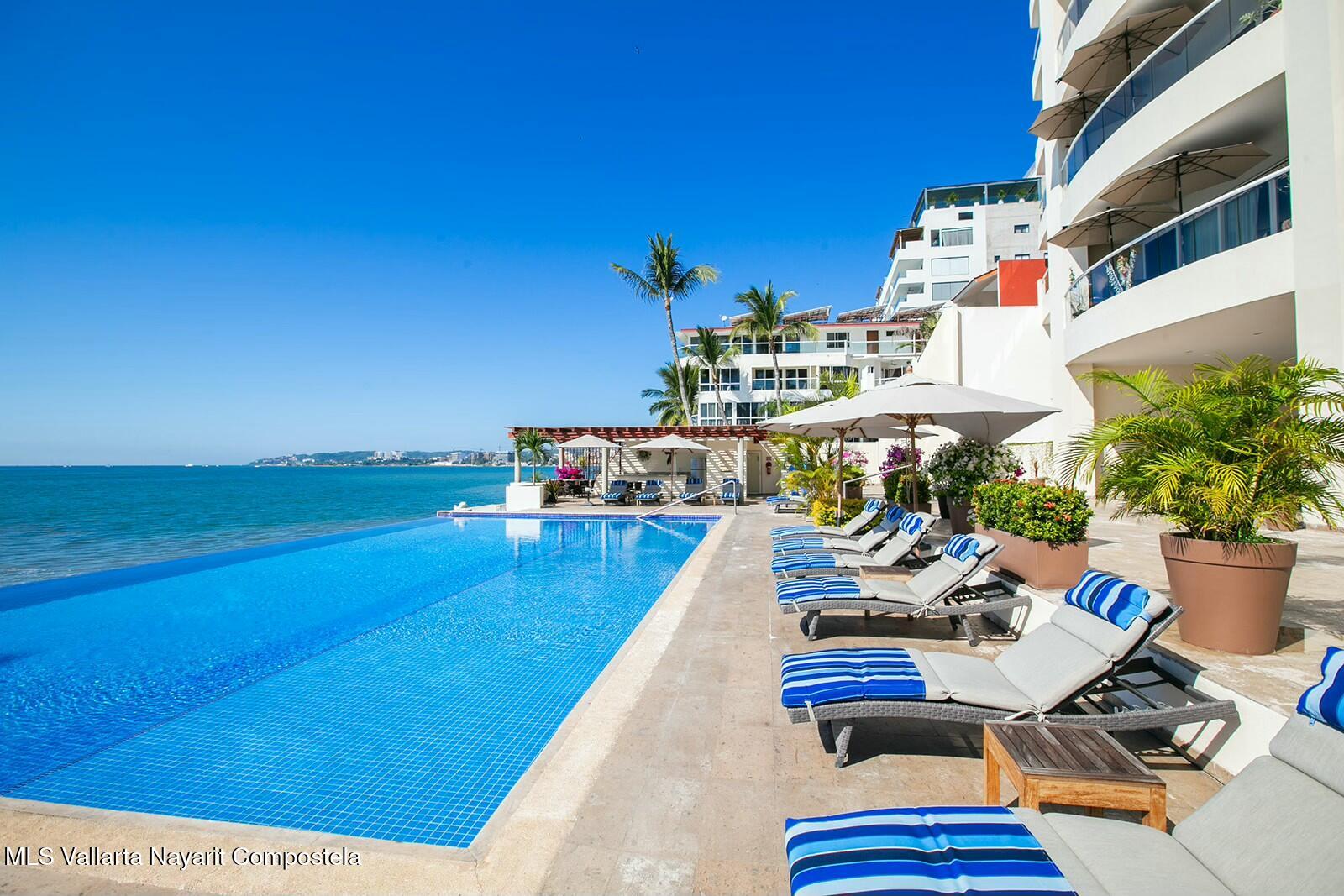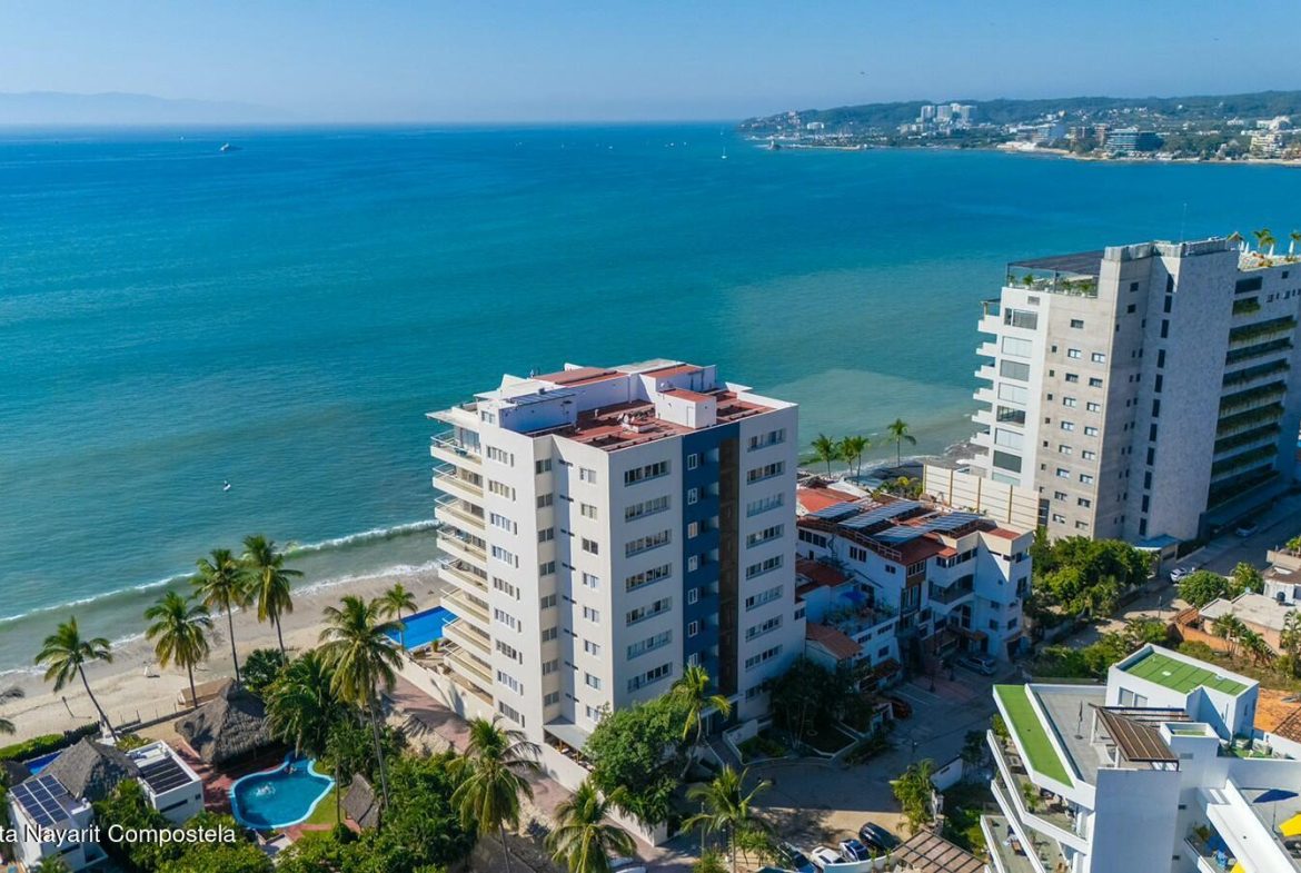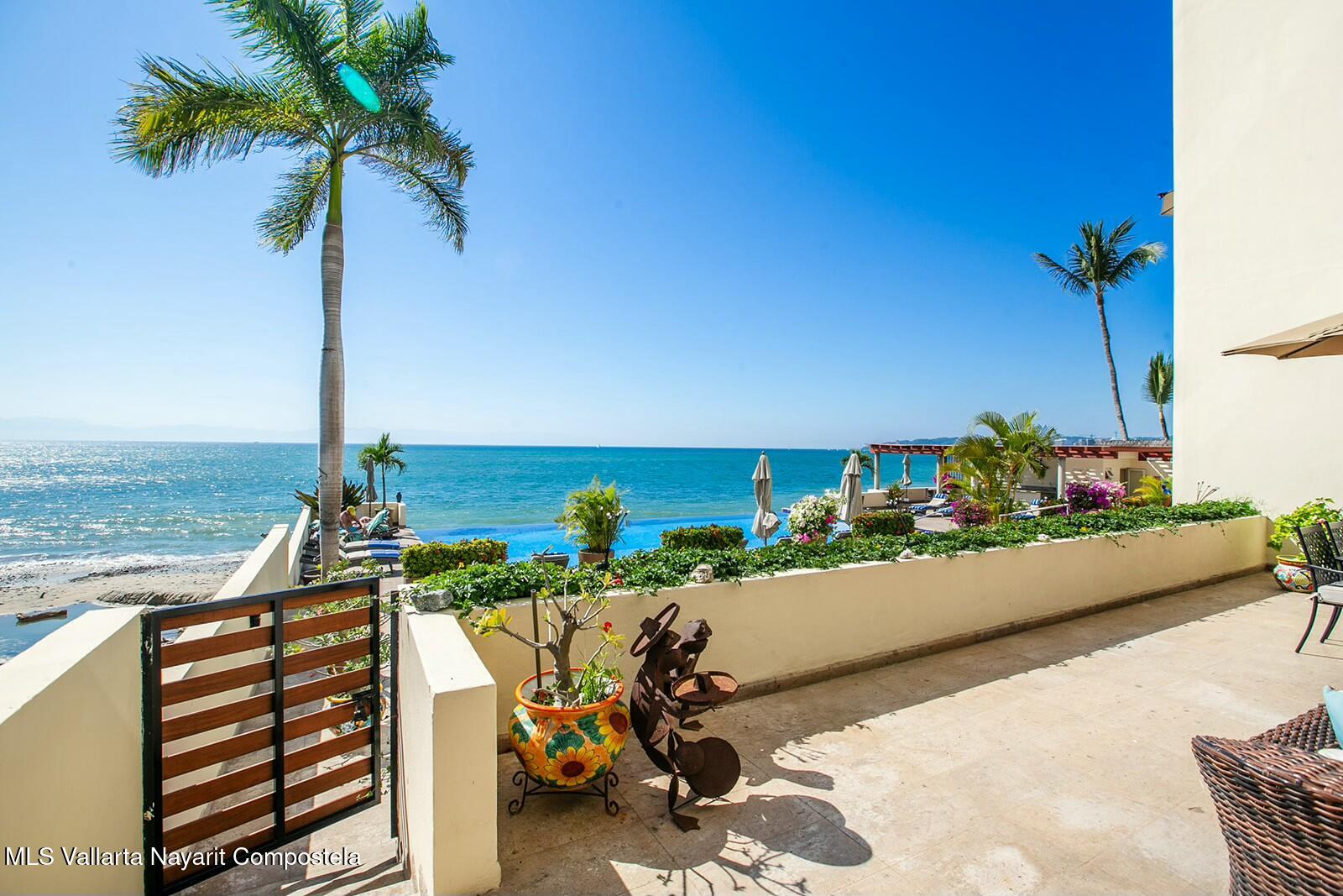 BUCERIAS GRAND PB-APrecious indoor-outdoor living is offered in this sprawling condo with three bedrooms, a studio and four bathrooms just steps from the sandy Bucerias beach in the quiet oceanside residential area north of centro know as Playas de Huanacaxtle. This condo lives like a house, with over 3,600 square feet and has direct access to the beautiful heated pool, lounge and barbeque area. It’s strategically elevated to give it privacy while enjoying endless ocean views from its 41 linear feet of L-shaped windows that wrap around its expansive living, dining and kitchen. It’s terrace frontage spans almost 30 feet. The changing skyline of Vallarta and La Cruz include dramatic sunsets that bathe these living spaces.