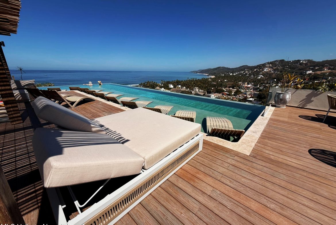 Unit 223 in Tower 2 is a sophisticated ocean-view, 2-bed, 2-bath residence on the second floor. It boasts an Italian-style kitchen with granite countertops and Parota wood cabinetry, an open living area, a king-size master suite and a queen-size second bedroom, modern baths with European-style fixtures, and contemporary finishes like marble flooring, mosaic accents, European PVC double-pane windows. Climate comfort is ensured by inverter minisplit AC and instant water heating. The terrace offers a serene ocean view, and the building’s upscale amenities–such as rooftop infinity pool and bar, hammock lounges, fitness and yoga deck, family pool, surfboard storage, co-working space, pet garden, and valet parking–complement the unit.