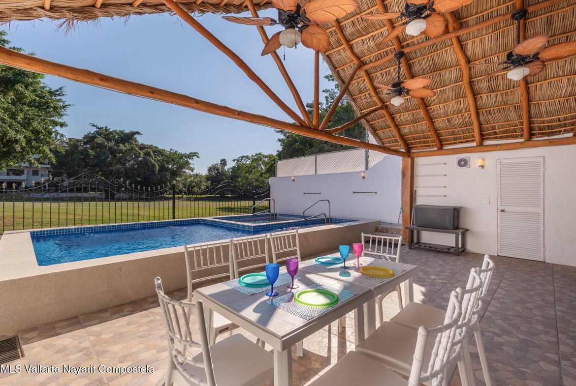Hermosa casa frente al campo de golf con alberca climatizada y area para entretenimiento. Casa Alma se encuentra en Marina Vallarta. Esta residencia privada frente al campo de golf ofrece 5rec/5ba completos, 2 medios ba, cuarto de servicio y 23 paneles solares. La alberca privada climatizada tiene vista al campo de golf de Marina Vallarta, y la casa cuenta con mas de 400 m2 de construccion. Tiene cochera techada para 2 autos y un amplio espacio junto a la alberca, ideal para reuniones con familia y amigos. La casa esta a poca distancia caminando de los mejores restaurantes, cafes, bares, el malecon de la Marina y, por supuesto, la playa. Se encuentra a solo 5 minutos caminando del aeropuerto y a 15 minutos en coche del Malecon del centro. —