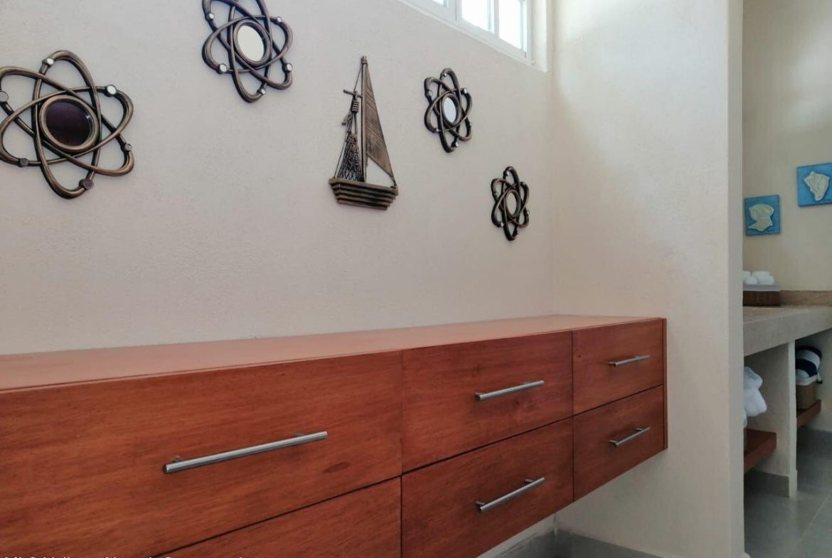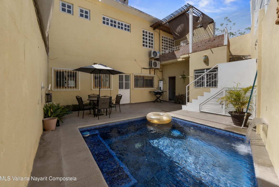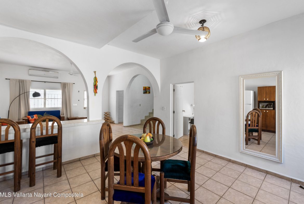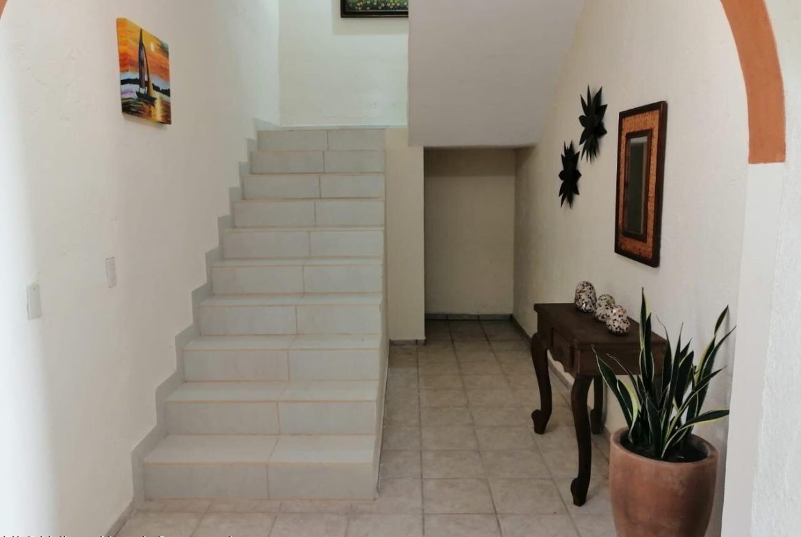Casa estilo mexicano, ubicada en el corazon de la Cruz de Huanacaxtle a una cuadra de la entrada a la Marina y al famoso mercado de artesanias de los sabados, la casa cuenta con patio frontal, amplia cochera techada, sala, cocina-comedor, cuarto de lavado, patio trasero con alberca privada y amplia recamara con bano en la planta baja; en la planta alta recamara con bano y vestidor y una terraza con vista a la alberca, ventiladores de techo y aire acondicionado.