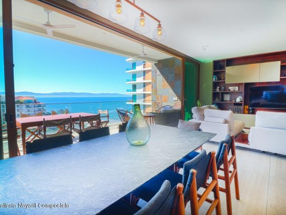Elegant oceanfront condominium located in Casa del Mar at Playa Los Picos, Bucerias. This beautiful residence features 2 spacious bedrooms, 2 full bathrooms, and a modern kitchen equipped with high-end appliances and granite countertops. The kitchen, dining, and living areas, all flow out towards a private terrace with front ocean views. Offered fully furnished and move-in ready, this property also includes underground parking. With premium amenities, including an oceanfront infinity pool, gym, and BBQ terrace, providing the perfect balance of luxury and relaxation in one of Bucerias’ most desirable beachfront community. Ubicado en el exclusivo complejo Casa del Mar, en Playa Los Picos, Bucerias. El departamento cuenta con 2 amplias recamaras con closets y 2 banos.