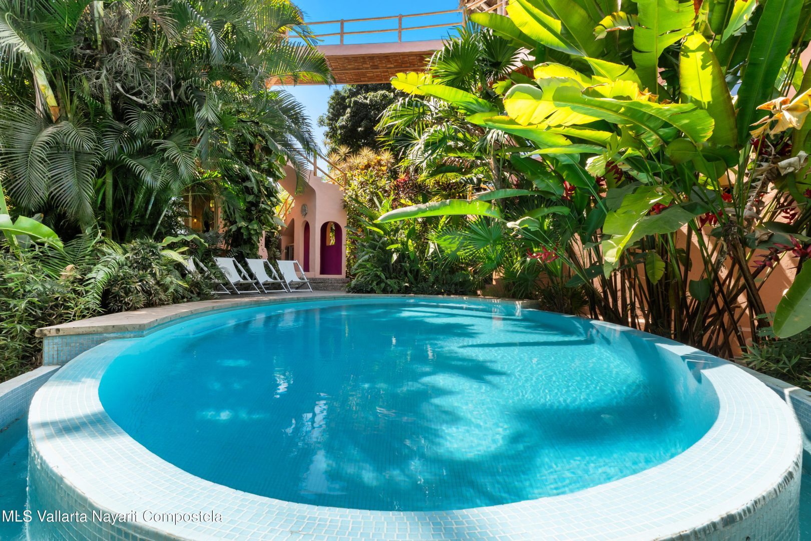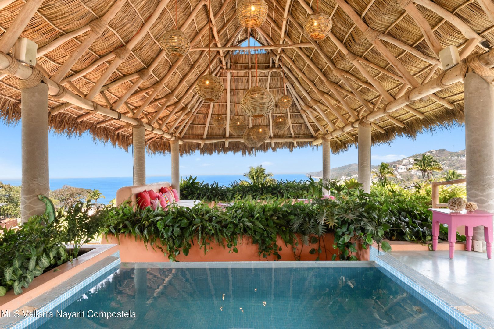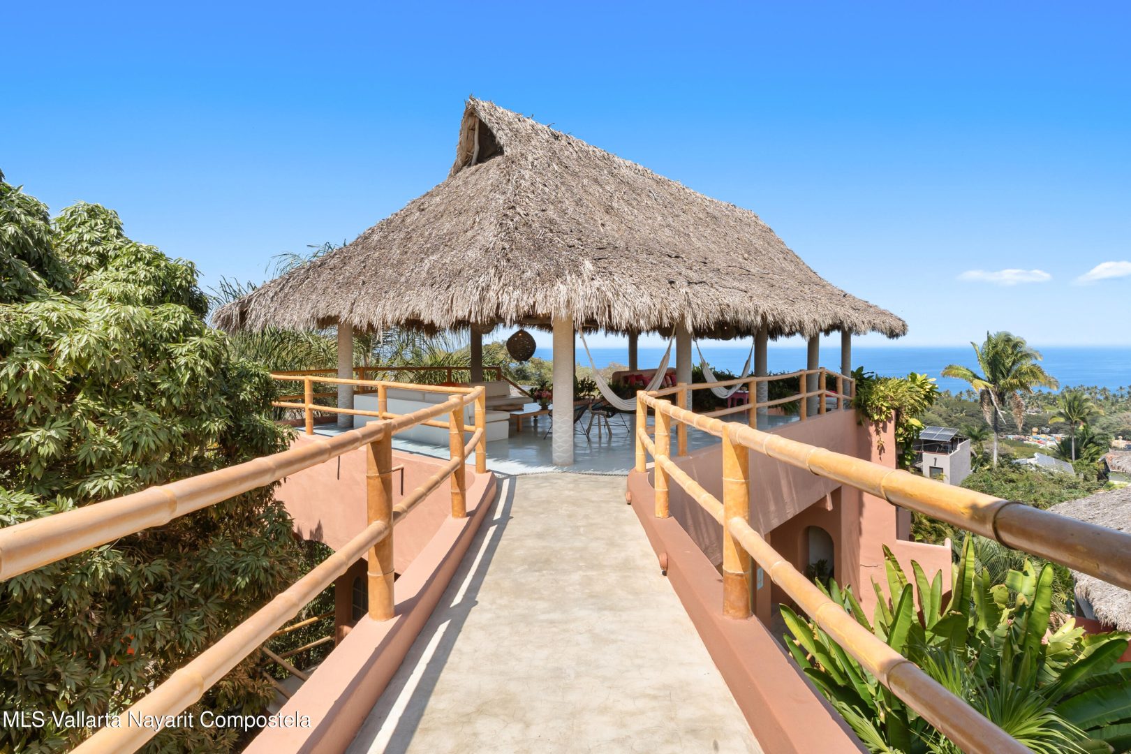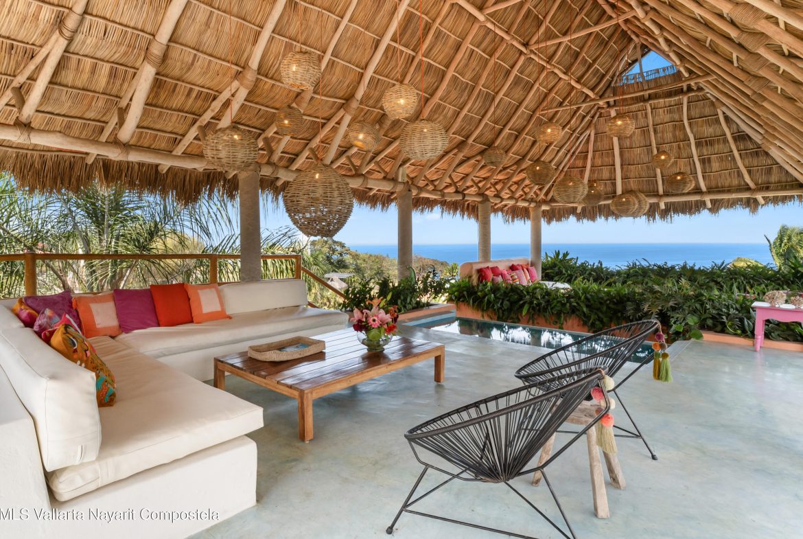 This unique villa with 360 degree views and its own lush garden, features four beautifully decorated bedroom suites, a swimming pool, a tree-top hot-tub with ocean views, and a Mexican-style open air living area with a rooftop living room and kitchen/dining room dramatically linked by a bridge. This property has views not only of the ocean and coastline but also of the lush foothills of the Sierra Madre and the energetic town of Sayulita. Each of the colorful accommodations has its own bathroom with shower, king size bed, fan, a-c and indoor and outdoor sitting areas. All rooms share views of the walled garden, pool, town, and surrounding hills.