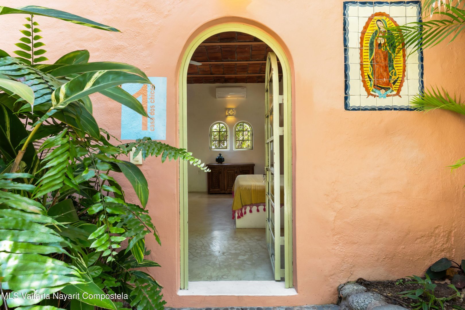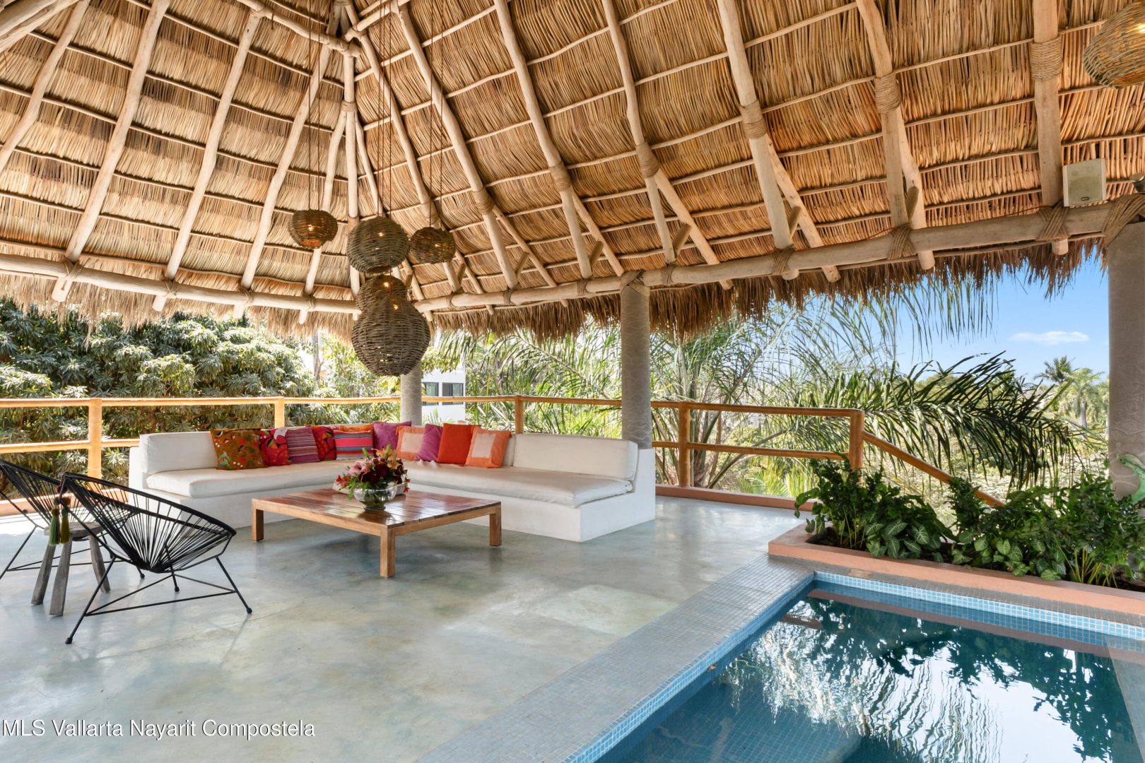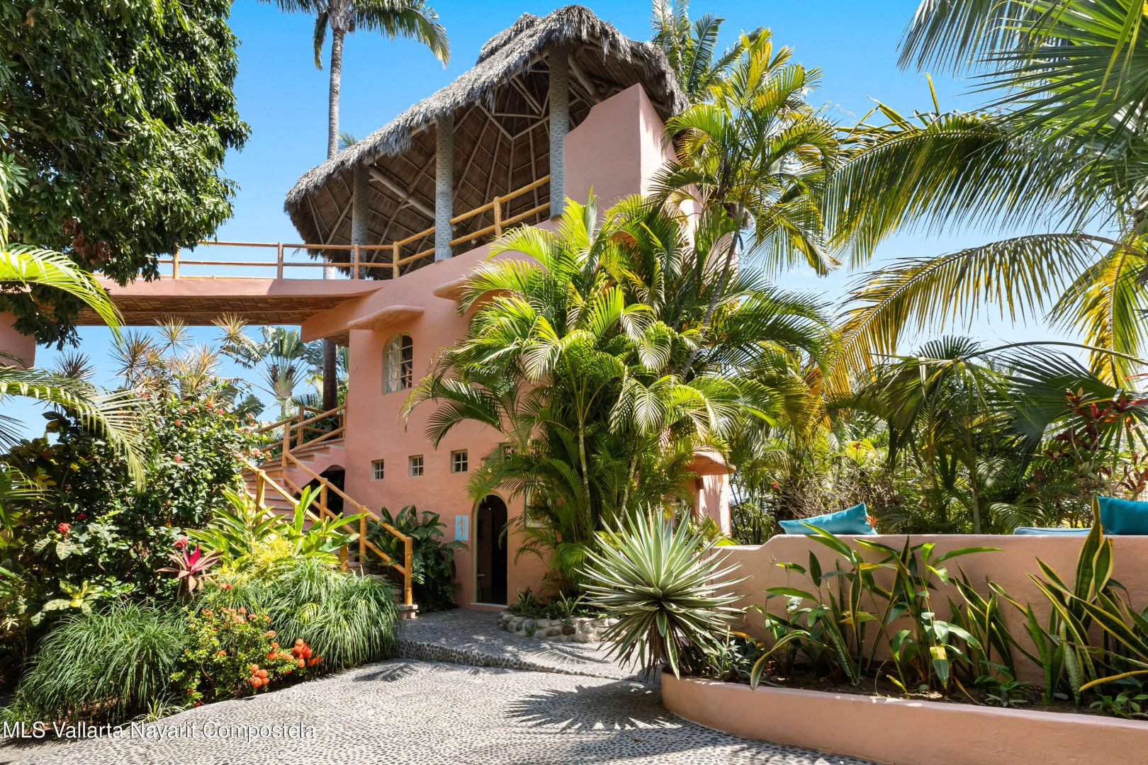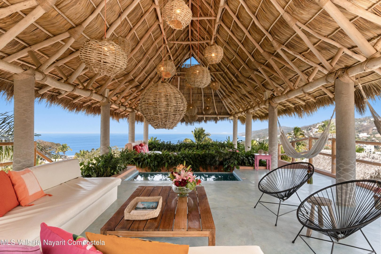 This unique villa with 360 degree views and its own lush garden, features four beautifully decorated bedroom suites, a swimming pool, a tree-top hot-tub with ocean views, and a Mexican-style open air living area with a rooftop living room and kitchen/dining room dramatically linked by a bridge. This property has views not only of the ocean and coastline but also of the lush foothills of the Sierra Madre and the energetic town of Sayulita. Each of the colorful accommodations has its own bathroom with shower, king size bed, fan, a-c and indoor and outdoor sitting areas. All rooms share views of the walled garden, pool, town, and surrounding hills.