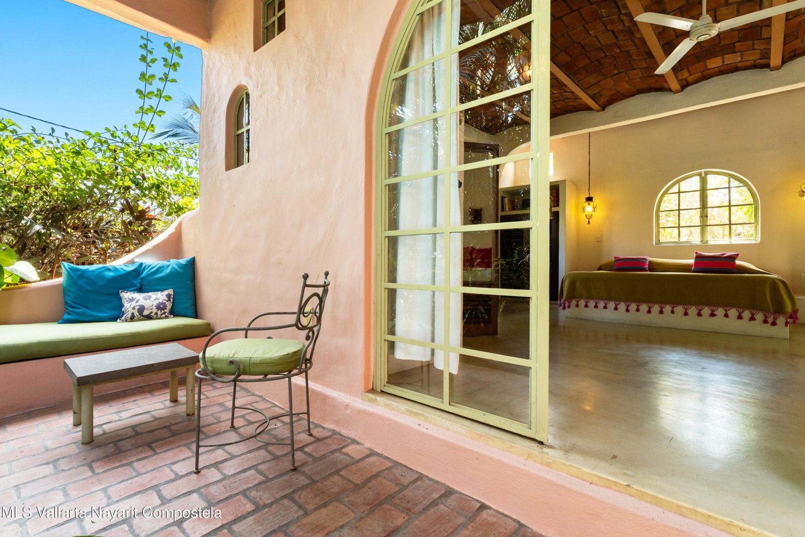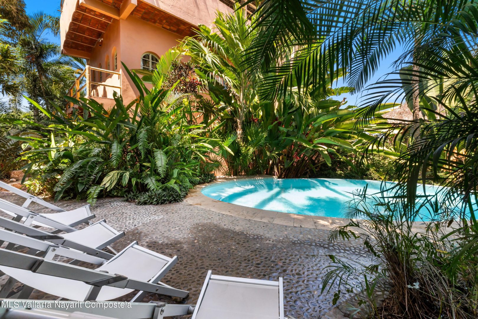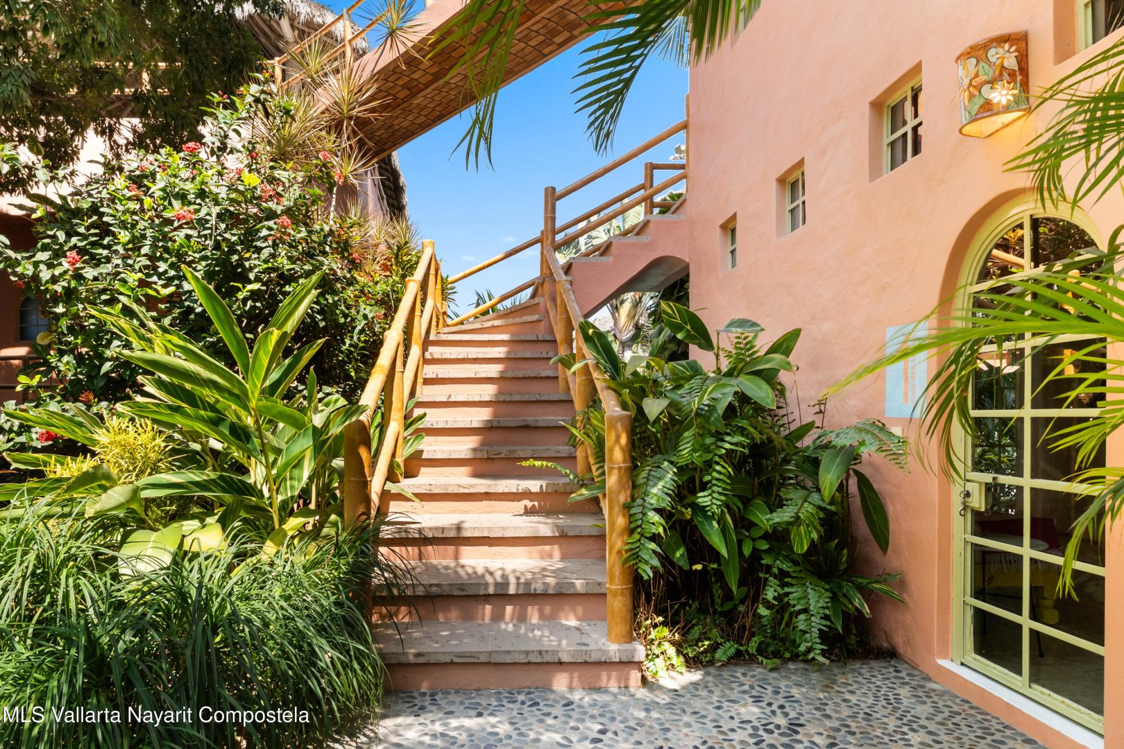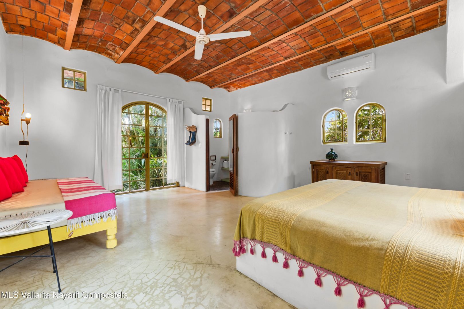 This unique villa with 360 degree views and its own lush garden, features four beautifully decorated bedroom suites, a swimming pool, a tree-top hot-tub with ocean views, and a Mexican-style open air living area with a rooftop living room and kitchen/dining room dramatically linked by a bridge. This property has views not only of the ocean and coastline but also of the lush foothills of the Sierra Madre and the energetic town of Sayulita. Each of the colorful accommodations has its own bathroom with shower, king size bed, fan, a-c and indoor and outdoor sitting areas. All rooms share views of the walled garden, pool, town, and surrounding hills.