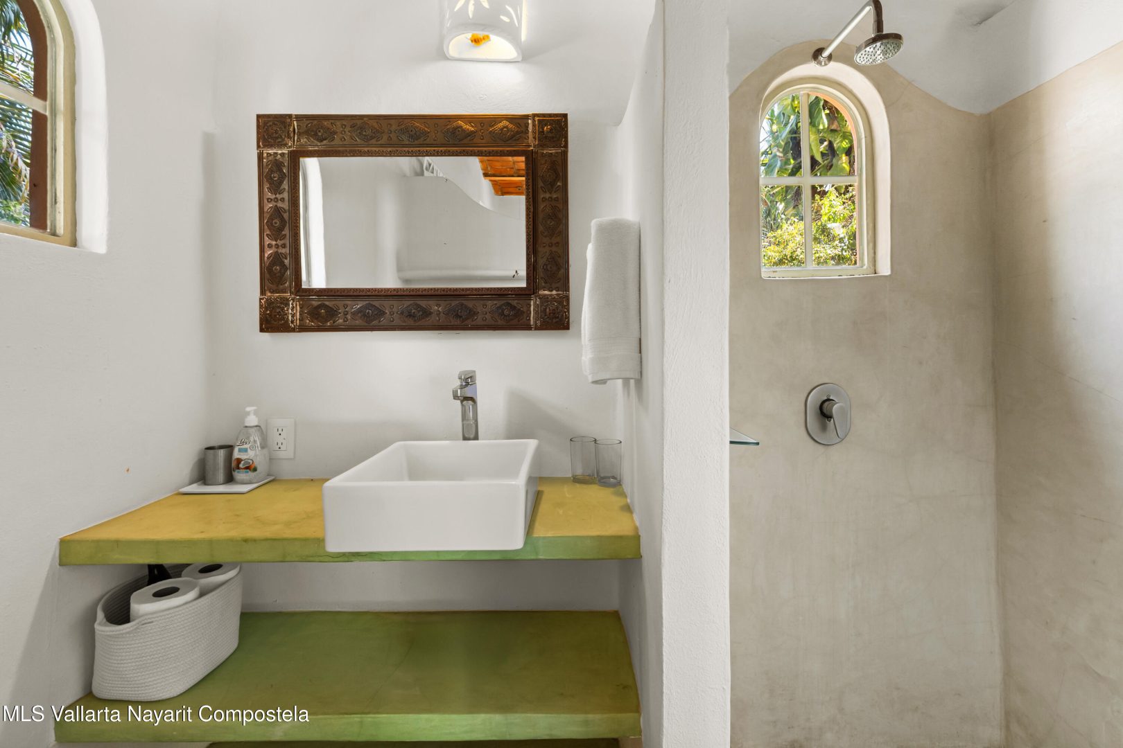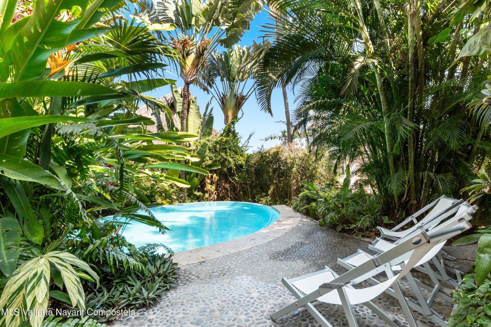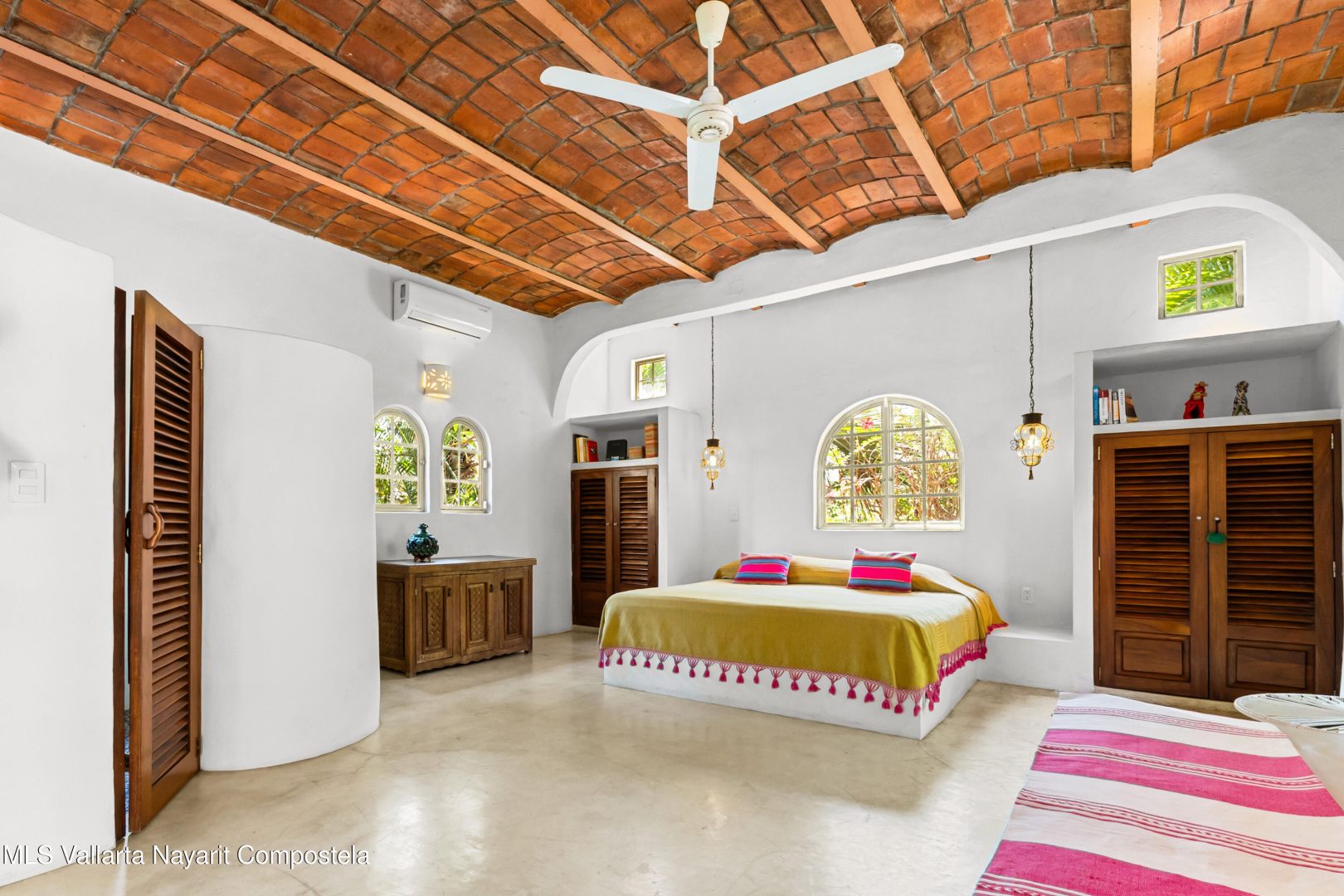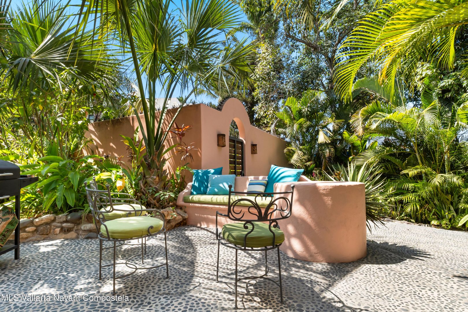 This unique villa with 360 degree views and its own lush garden, features four beautifully decorated bedroom suites, a swimming pool, a tree-top hot-tub with ocean views, and a Mexican-style open air living area with a rooftop living room and kitchen/dining room dramatically linked by a bridge. This property has views not only of the ocean and coastline but also of the lush foothills of the Sierra Madre and the energetic town of Sayulita. Each of the colorful accommodations has its own bathroom with shower, king size bed, fan, a-c and indoor and outdoor sitting areas. All rooms share views of the walled garden, pool, town, and surrounding hills.