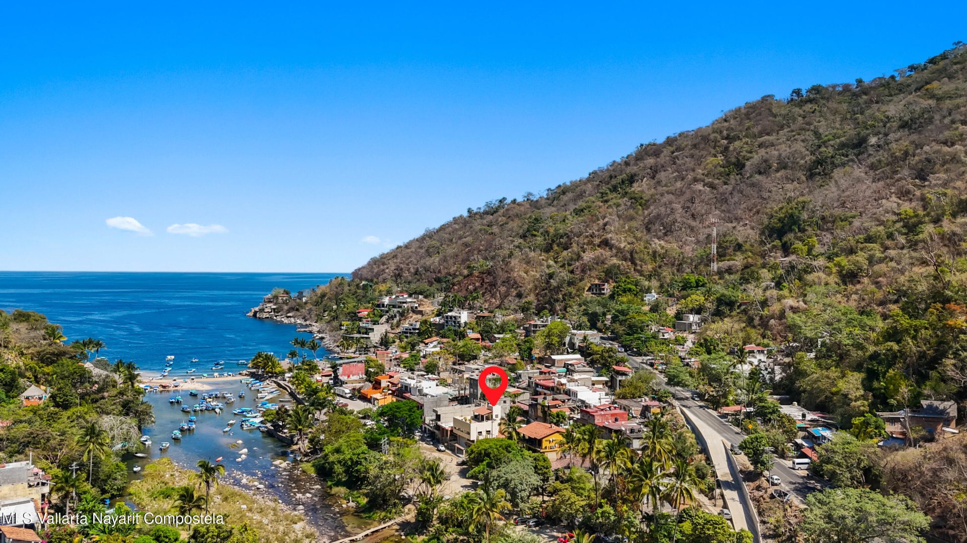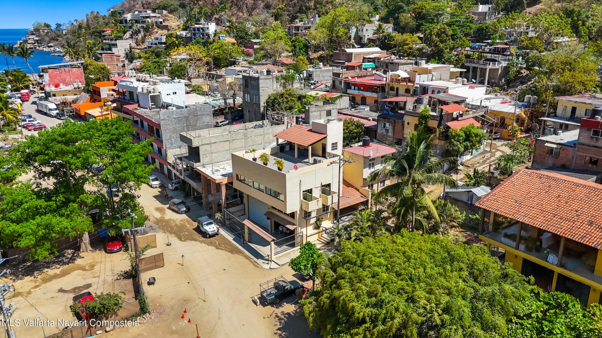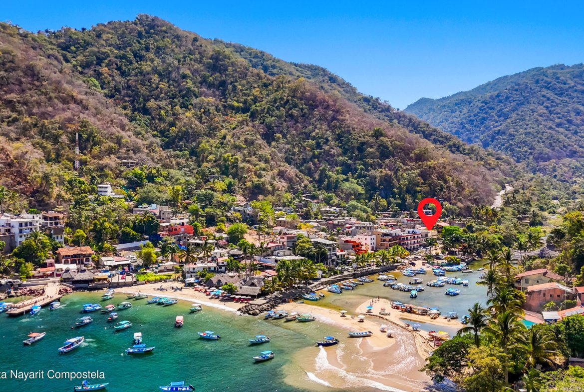 Charming coastal home in Boca de Tomatlan, just steps from the river and minutes to the beach and boat launch for easy access to Banderas Bay. The ground level features a spacious garage for a large boat and multiple vehicles, plus a full bath and secure storage.An intermediate level, currently a large office with kitchenette, is plumbed and can be easily converted into a studio or guest suite.The main level offers an open-concept layout with 2 bedrooms, 2 bathrooms, and bright living, dining, and kitchen areas. The terrace includes a covered patio with outdoor kitchen, sink, and BBQ–perfect for entertaining or relaxing.Ideal as a full-time home, vacation retreat, or income property.