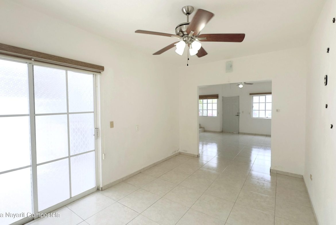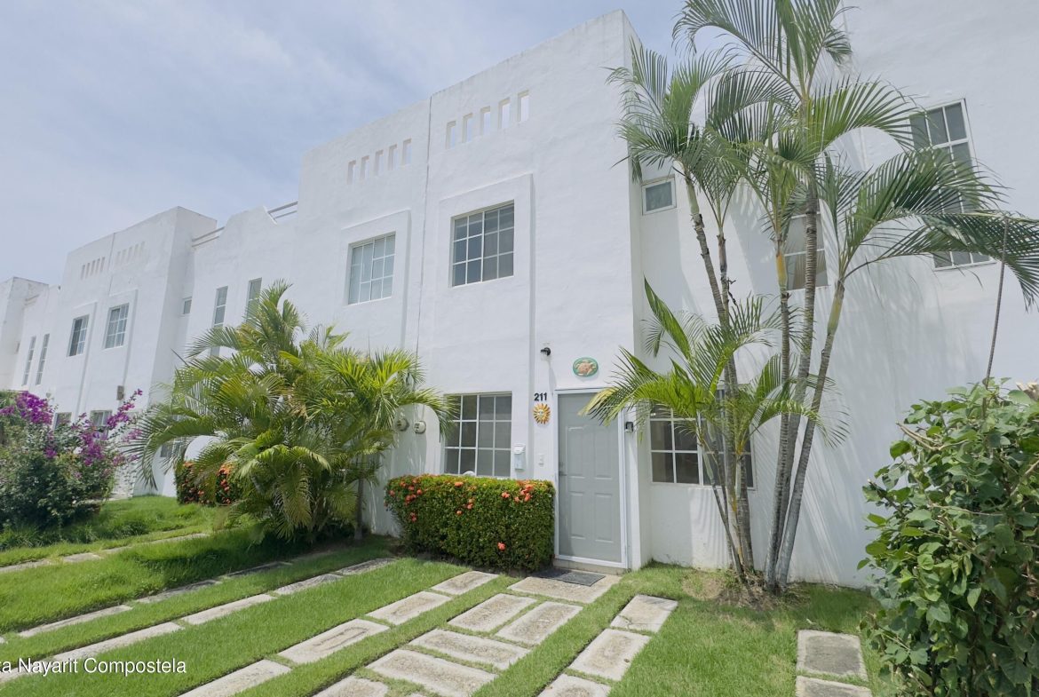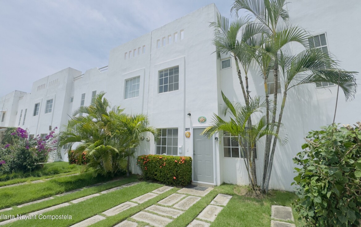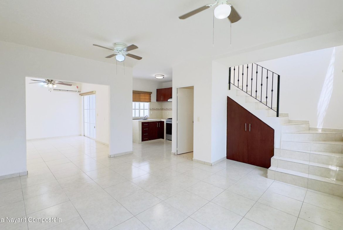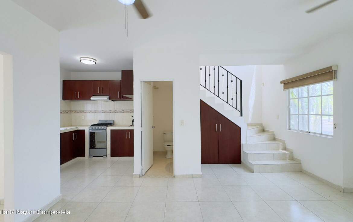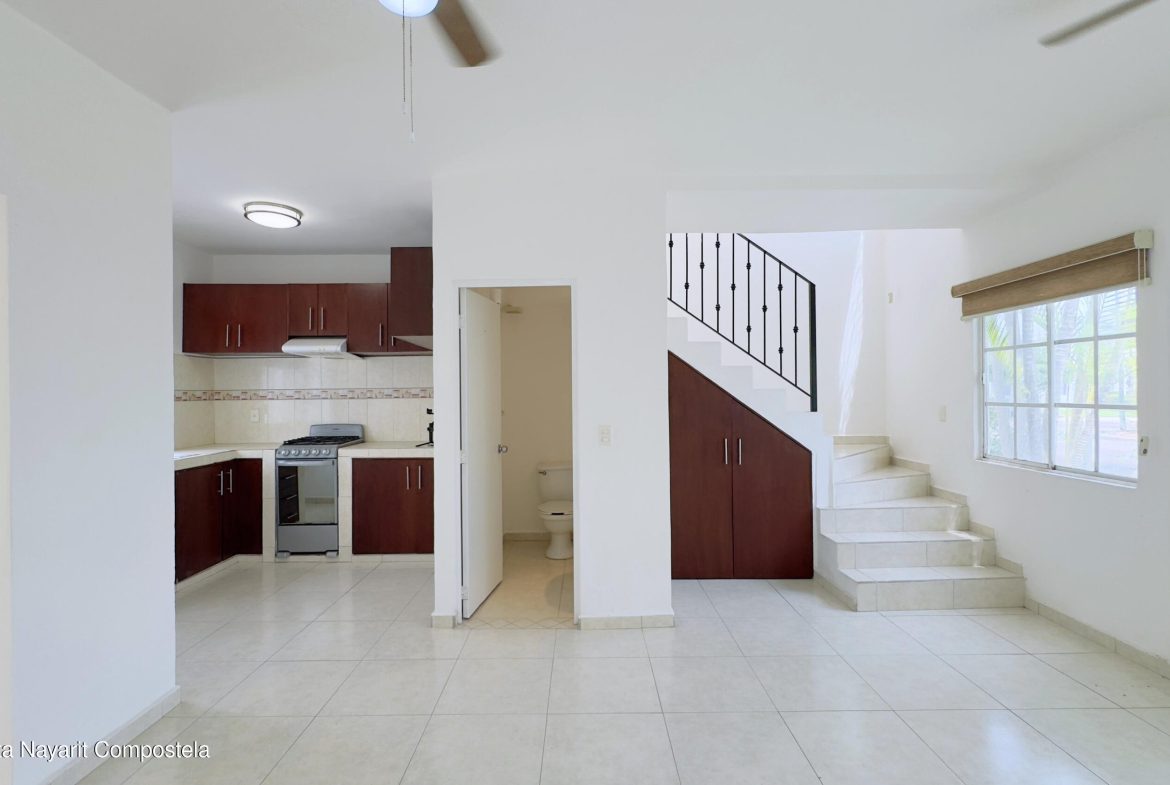 Casa en Las Ceibas, Bahia de Banderas, esta propiedad de dos plantas cuenta en planta baja con sala, comedor, cocina integral, estudio o sala de TV (opcion a tercera recamara), medio bano, patio de servicio y estacionamiento para dos autos. En planta alta se encuentran la recamara principal con bano y walking closet, una recamara secundaria y un bano completo adicional. El coto ofrece seguridad 24/7, areas verdes, juegos infantiles y canchas de usos multiples. Se ubica cerca de centros comerciales, escuelas, hospitales y playas. Precio en pesos: $2,995,000 MXN.