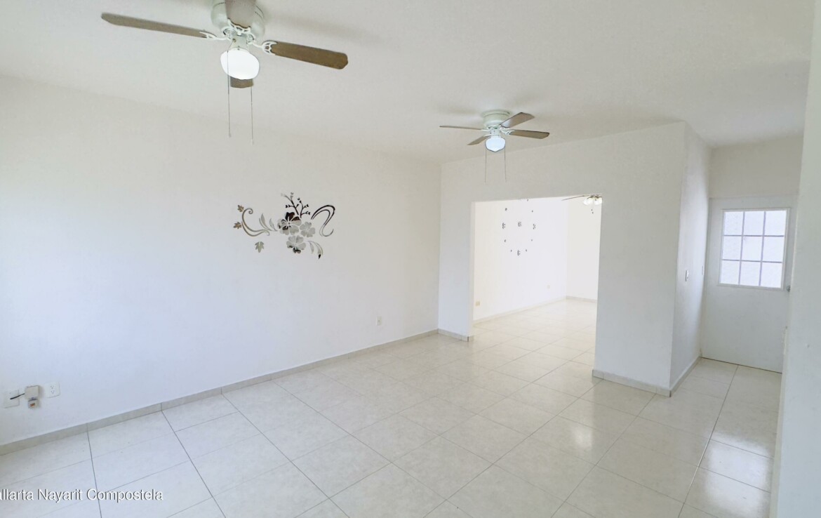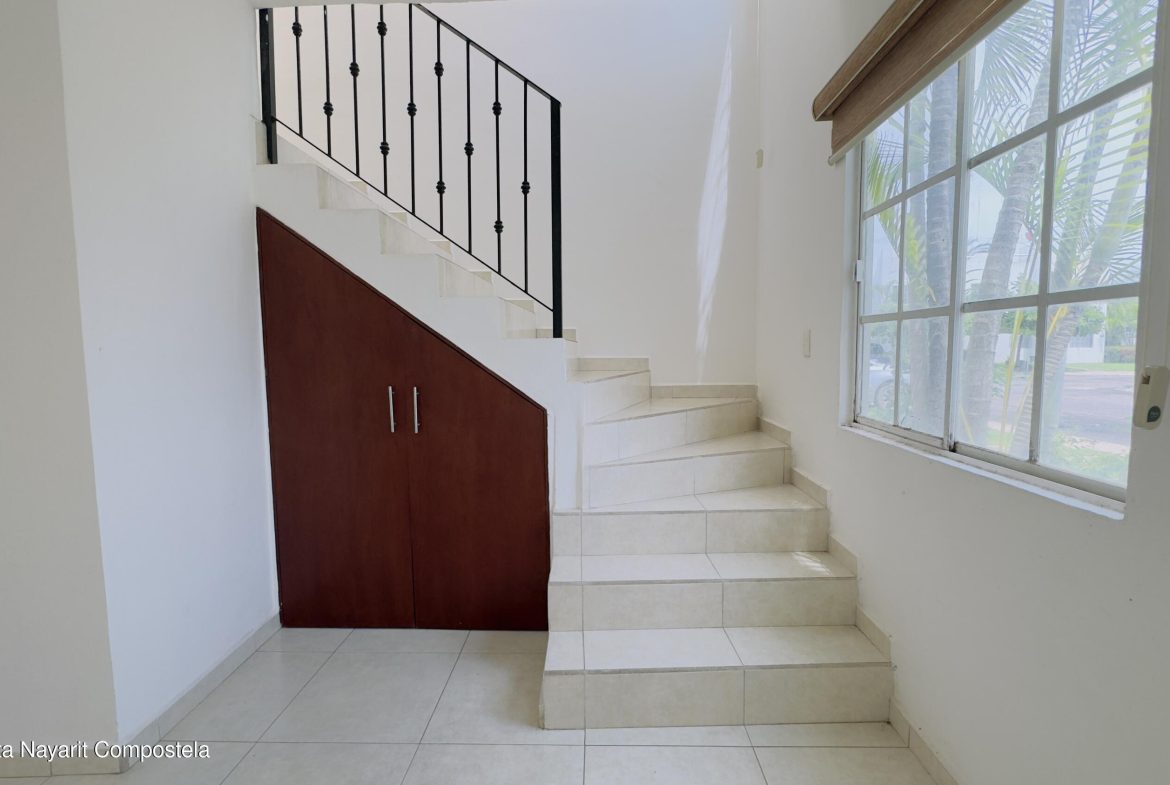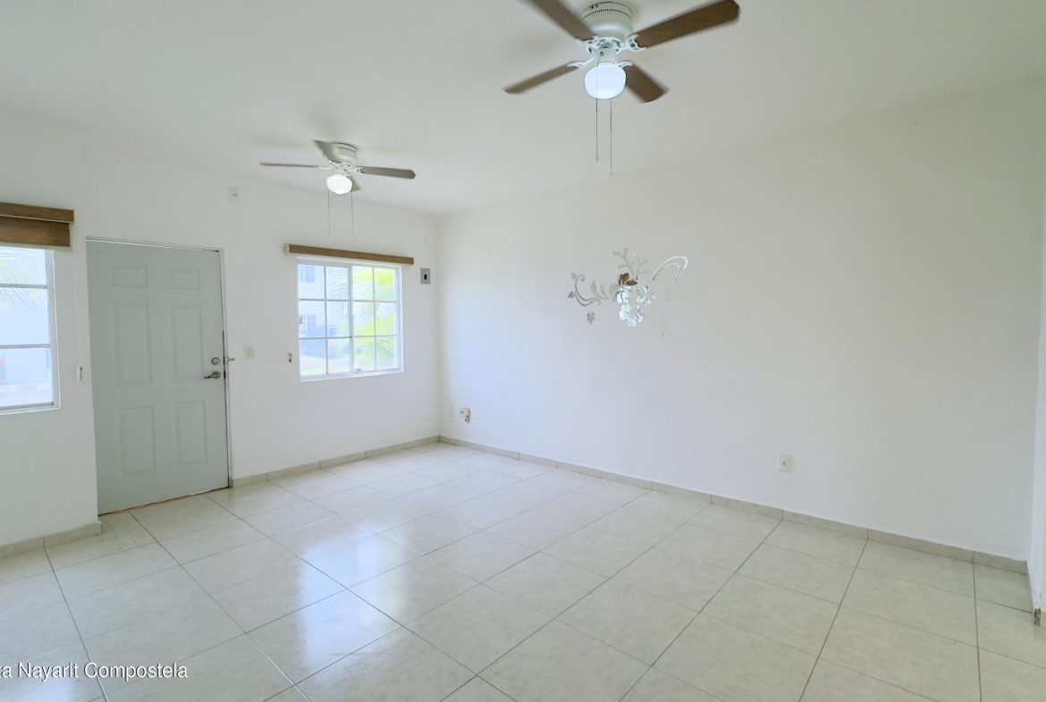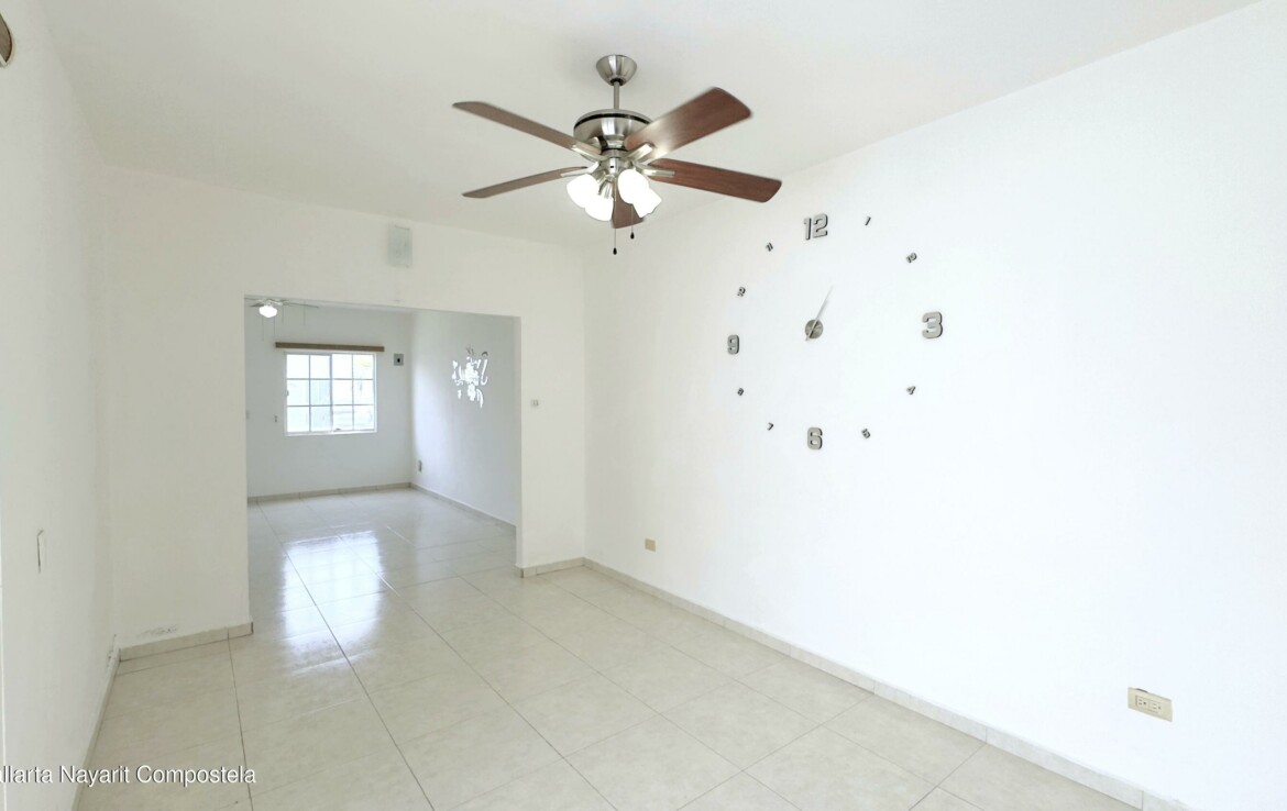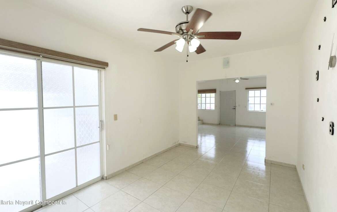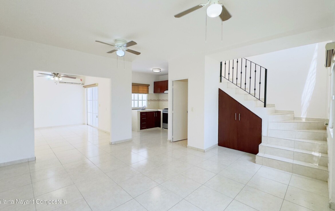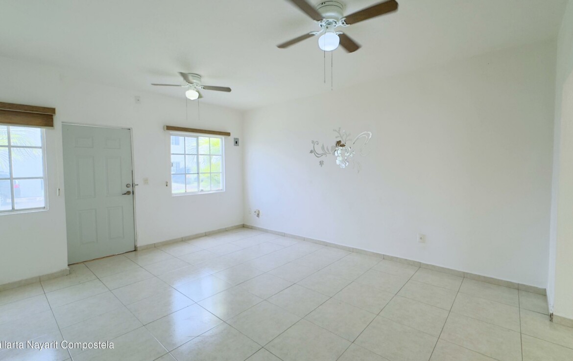 Casa en Las Ceibas, Bahia de Banderas, esta propiedad de dos plantas cuenta en planta baja con sala, comedor, cocina integral, estudio o sala de TV (opcion a tercera recamara), medio bano, patio de servicio y estacionamiento para dos autos. En planta alta se encuentran la recamara principal con bano y walking closet, una recamara secundaria y un bano completo adicional. El coto ofrece seguridad 24/7, areas verdes, juegos infantiles y canchas de usos multiples. Se ubica cerca de centros comerciales, escuelas, hospitales y playas. Precio en pesos: $2,995,000 MXN.