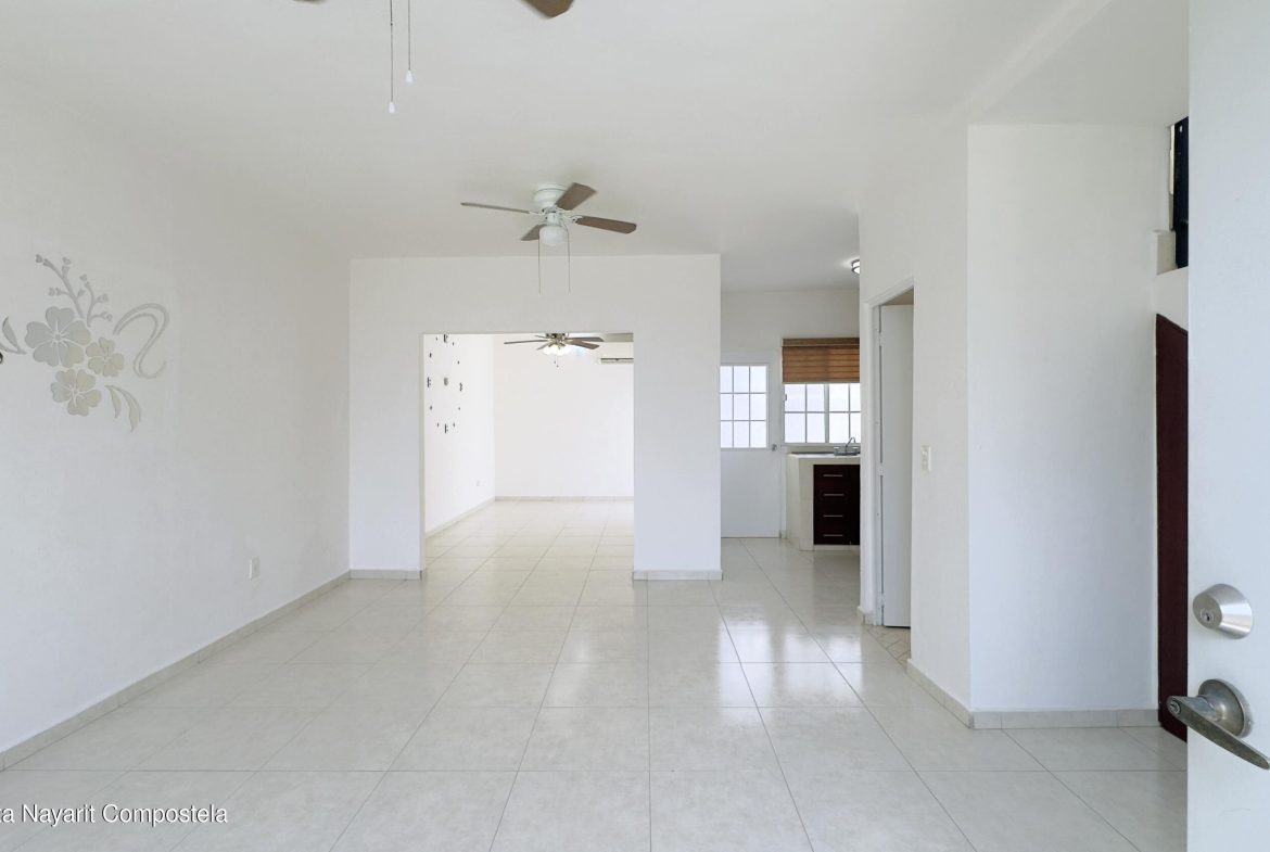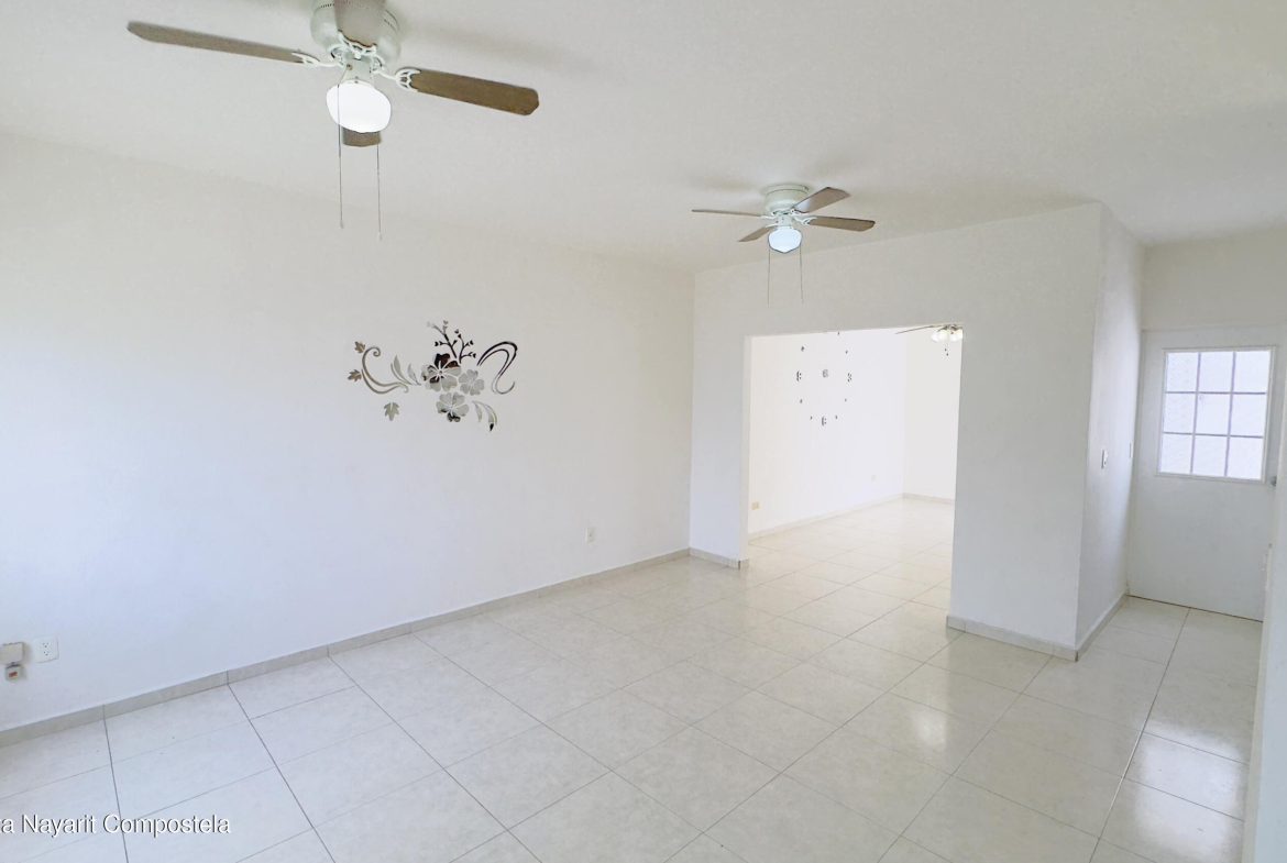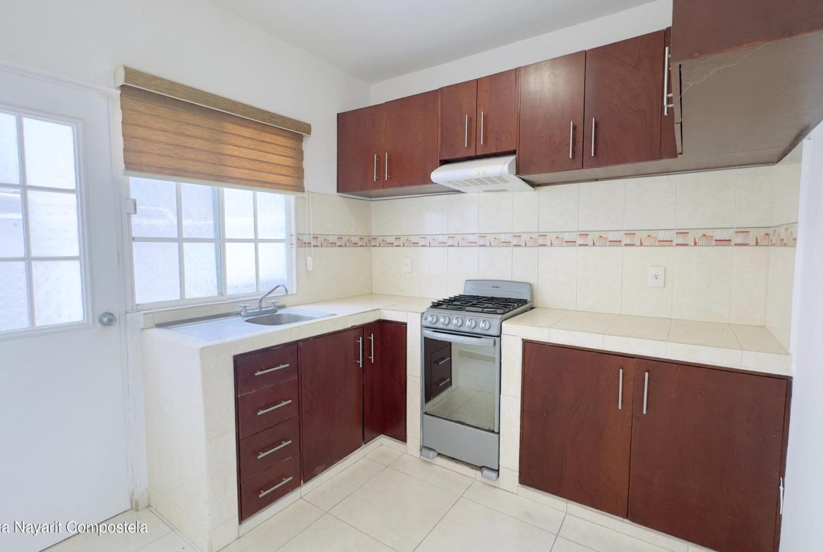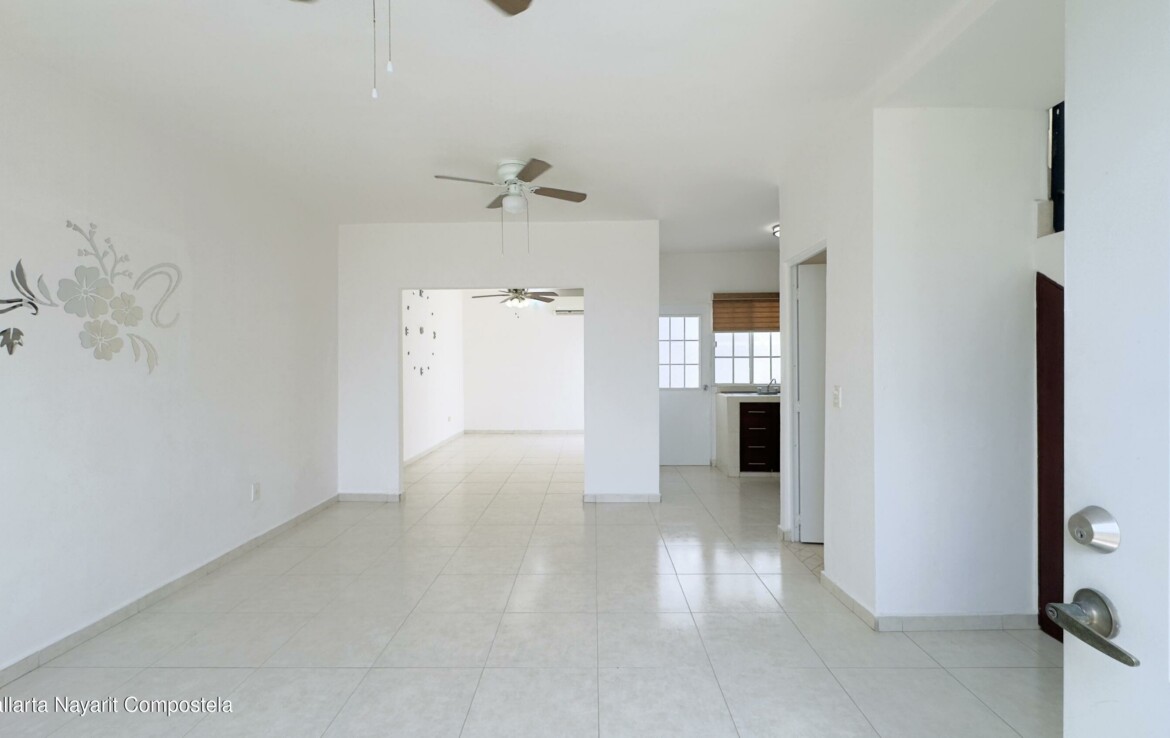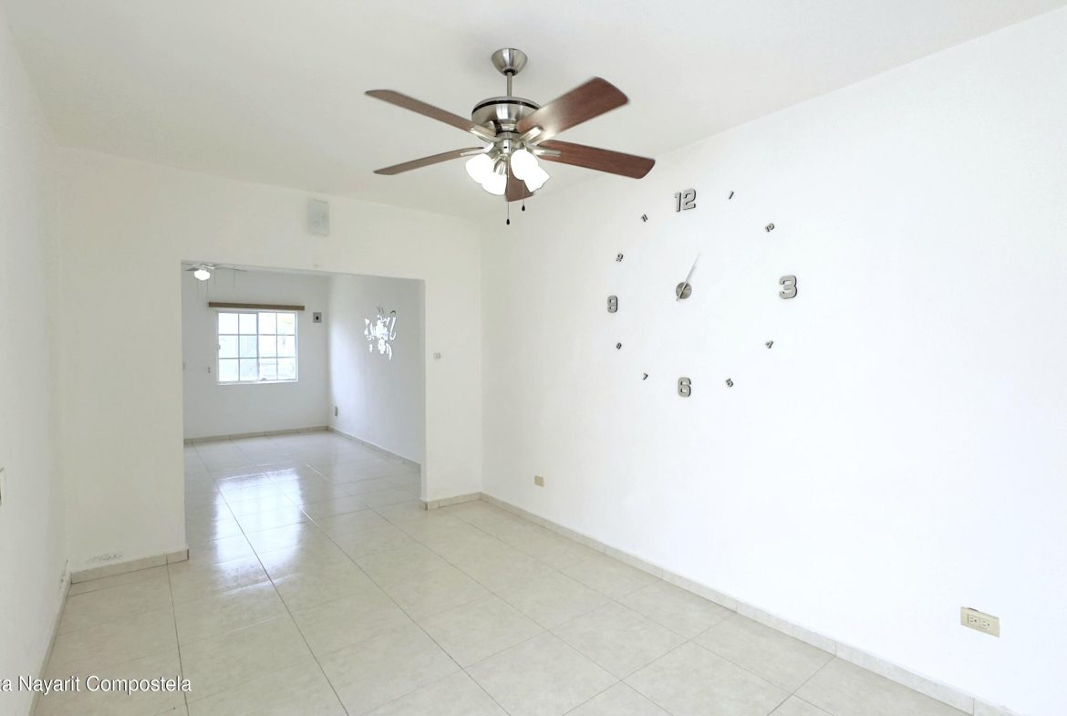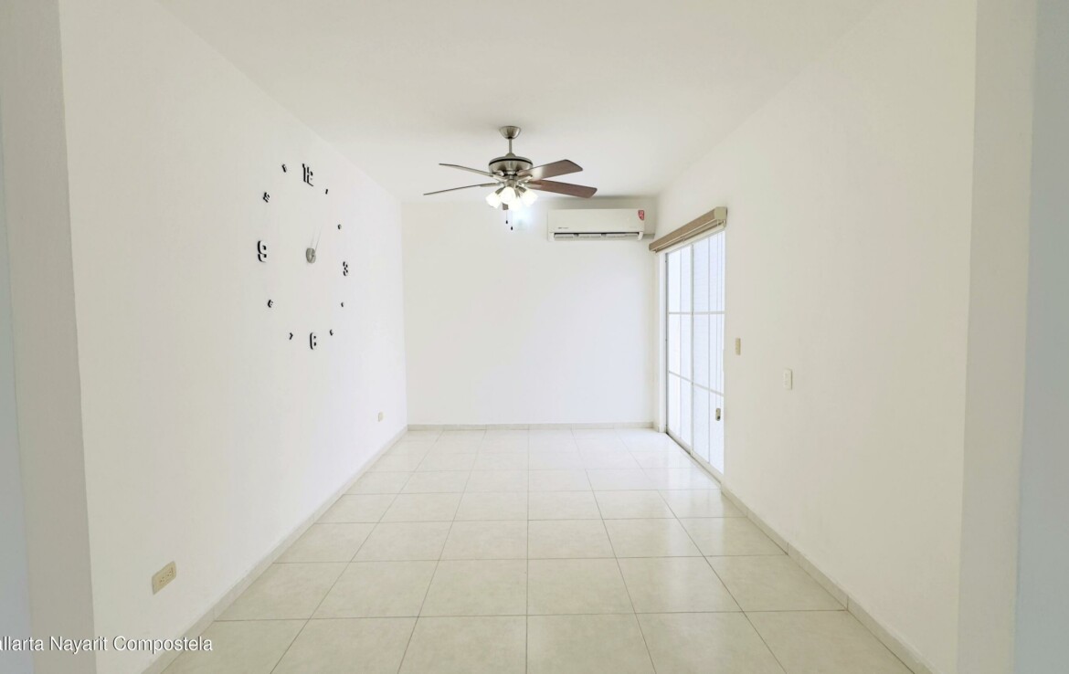 Casa en Las Ceibas, Bahia de Banderas, esta propiedad de dos plantas cuenta en planta baja con sala, comedor, cocina integral, estudio o sala de TV (opcion a tercera recamara), medio bano, patio de servicio y estacionamiento para dos autos. En planta alta se encuentran la recamara principal con bano y walking closet, una recamara secundaria y un bano completo adicional. El coto ofrece seguridad 24/7, areas verdes, juegos infantiles y canchas de usos multiples. Se ubica cerca de centros comerciales, escuelas, hospitales y playas. Precio en pesos: $2,995,000 MXN.