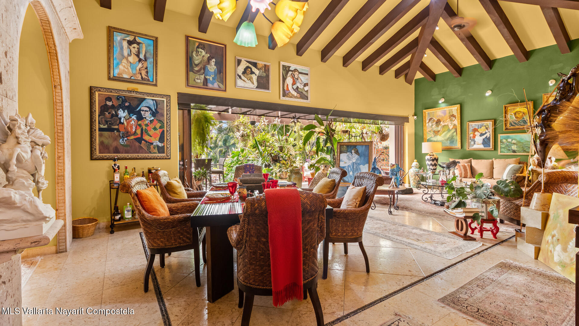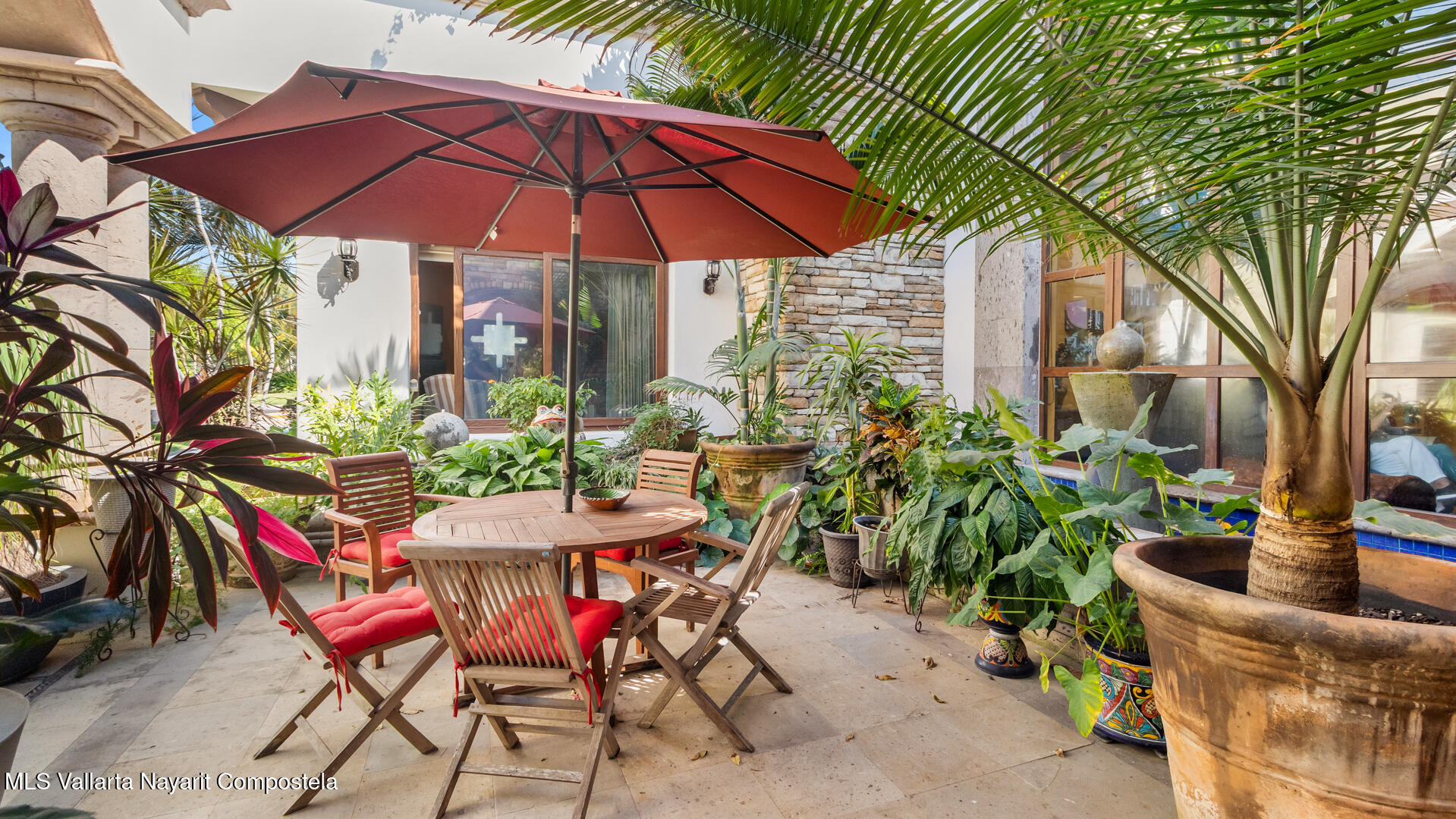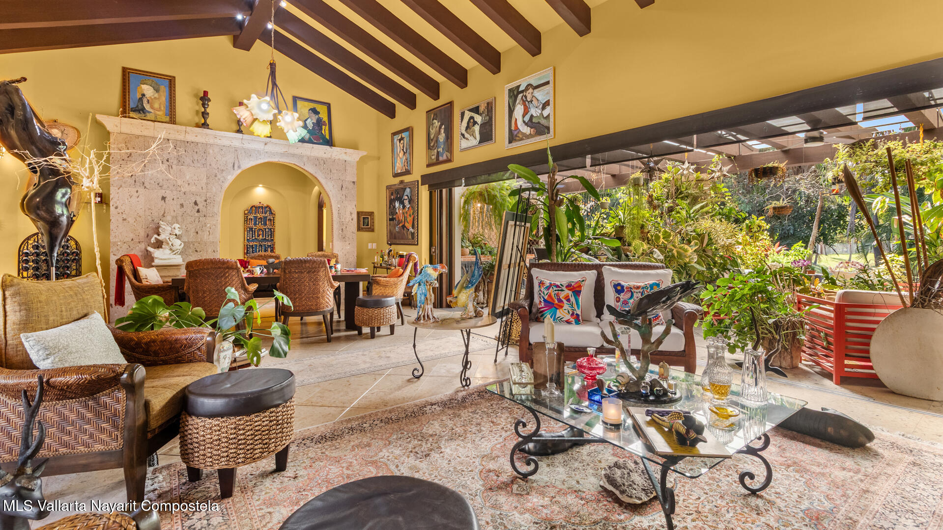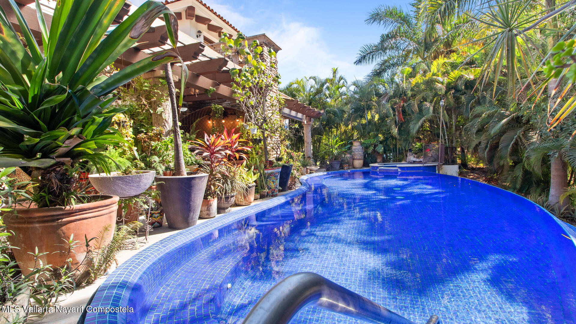 Welcome to this exquisite residence that perfectly blends luxury, comfort, and vibrant character. This beautifully designed home features 4 spacious bedrooms + a office, along with 3 full bathrooms and 2 half baths, offering ample space for both everyday living and entertaining.Step inside to discover soaring ceilings, abundant natural light, and a seamless indoor-outdoor flow. The home is filled with artistic charm, highlighted by colorful accents and warm architectural details throughout.The heart of the home opens to a breathtaking outdoor oasis–featuring a curved pool surrounded by lush tropical landscaping, creating a serene and private retreat ideal for relaxing or hosting guests.