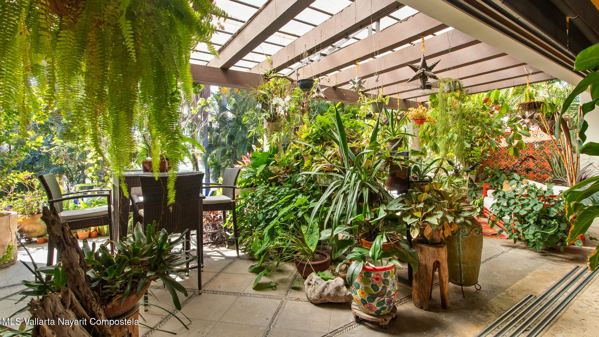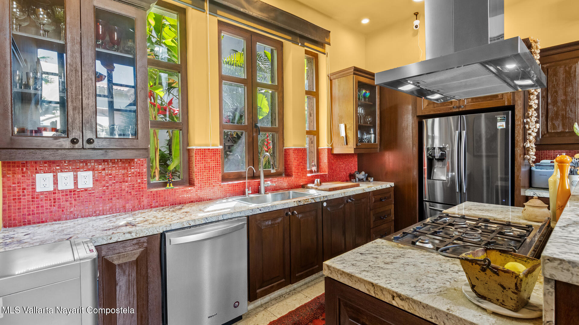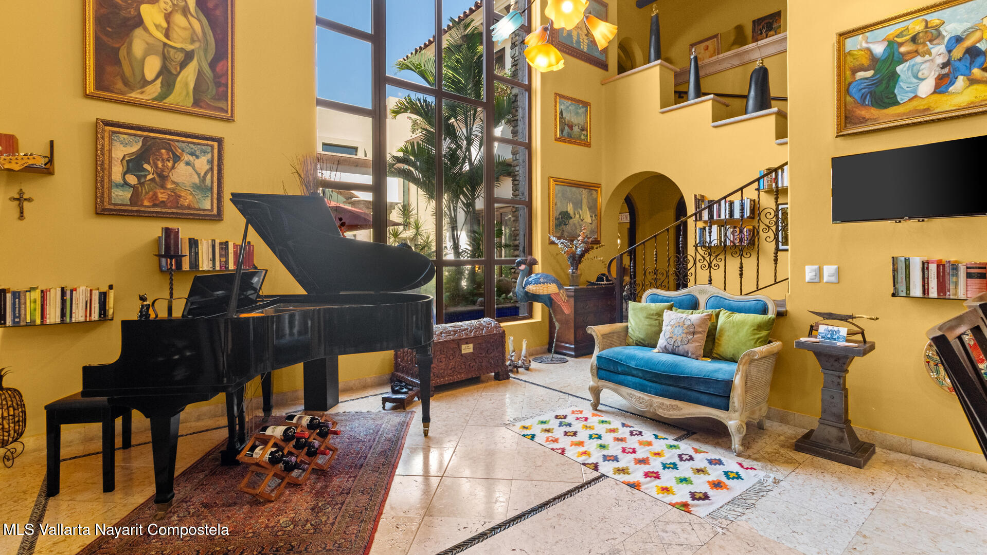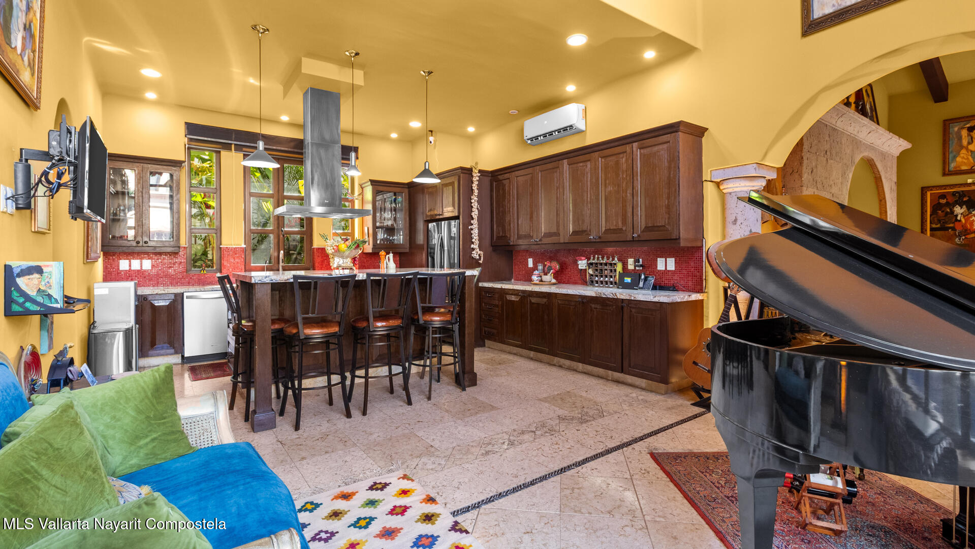 Welcome to this exquisite residence that perfectly blends luxury, comfort, and vibrant character. This beautifully designed home features 4 spacious bedrooms + a office, along with 3 full bathrooms and 2 half baths, offering ample space for both everyday living and entertaining.Step inside to discover soaring ceilings, abundant natural light, and a seamless indoor-outdoor flow. The home is filled with artistic charm, highlighted by colorful accents and warm architectural details throughout.The heart of the home opens to a breathtaking outdoor oasis–featuring a curved pool surrounded by lush tropical landscaping, creating a serene and private retreat ideal for relaxing or hosting guests.