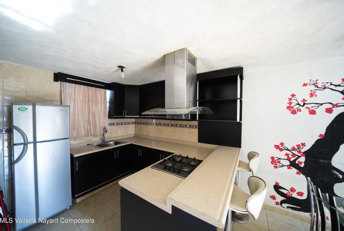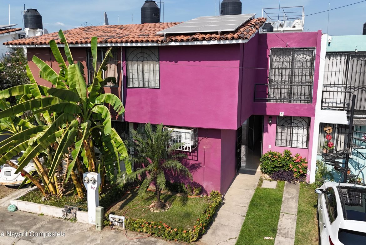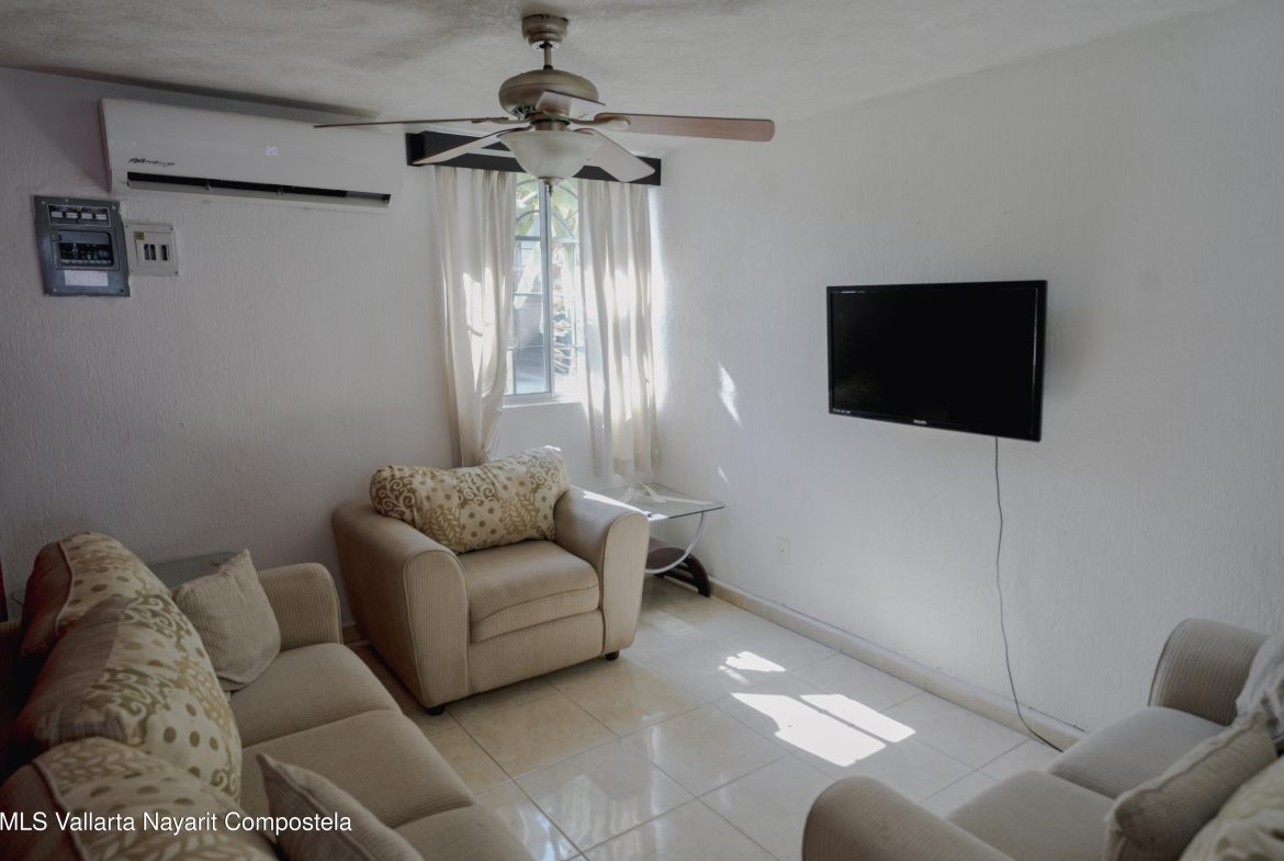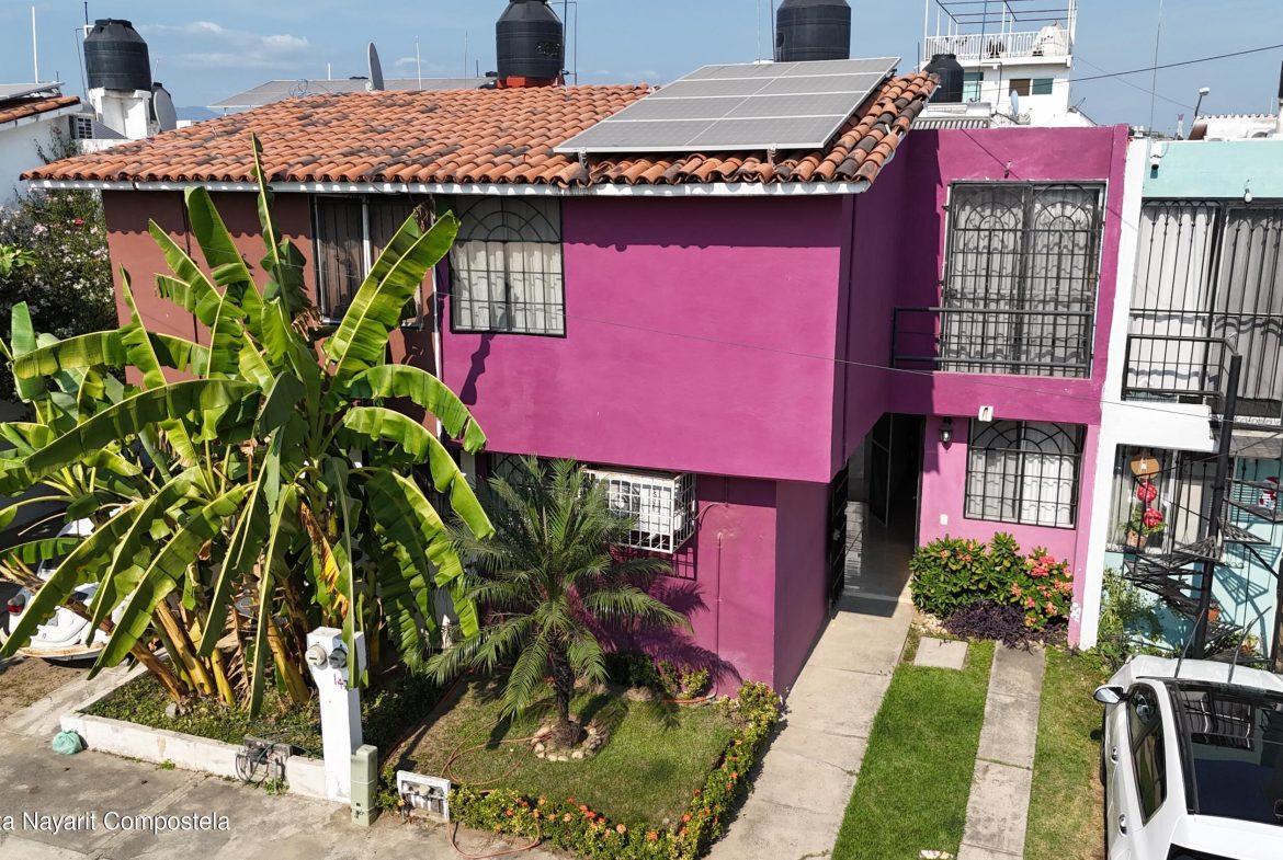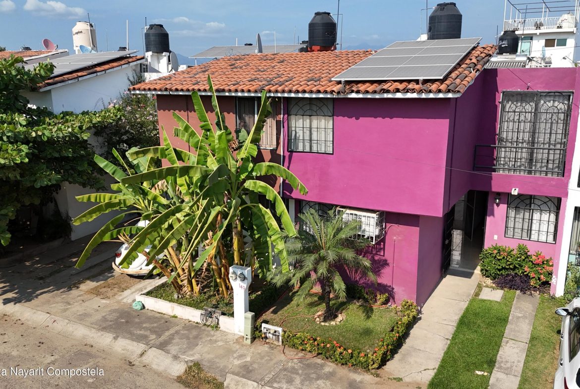 This house is located just 20 meters from the main avenue, Tlaxcala. It is a 5-minute drive to the Lago Real shopping center and 20 minutes to the nearest beach in Nuevo Vallarta. It is situated in one of the most accessible neighborhoods in Bahia de Banderas, featuring alternate routes with three different entry and exit points. The house has two levels, featuring 3 bedrooms and 1.5 bathrooms. The ground floor includes a living-dining area and a spacious backyard. The living room is very spacious, offering enough room to build a fourth bedroom in the future if desired. The kitchen is fully equipped, and there is one parking space. It is worth noting that the house is sold fully furnished. It also comes equipped with a water heater, 3 air conditioning units, ceiling fans, solar panels