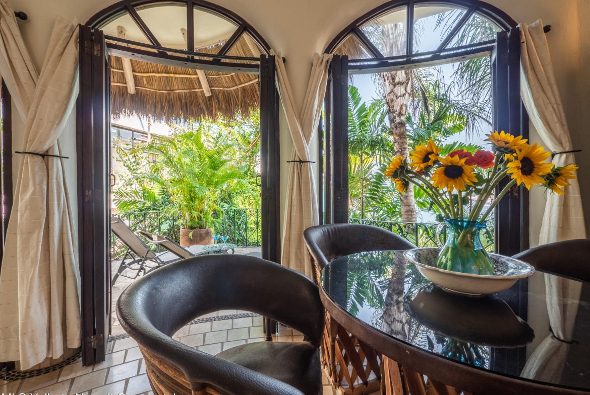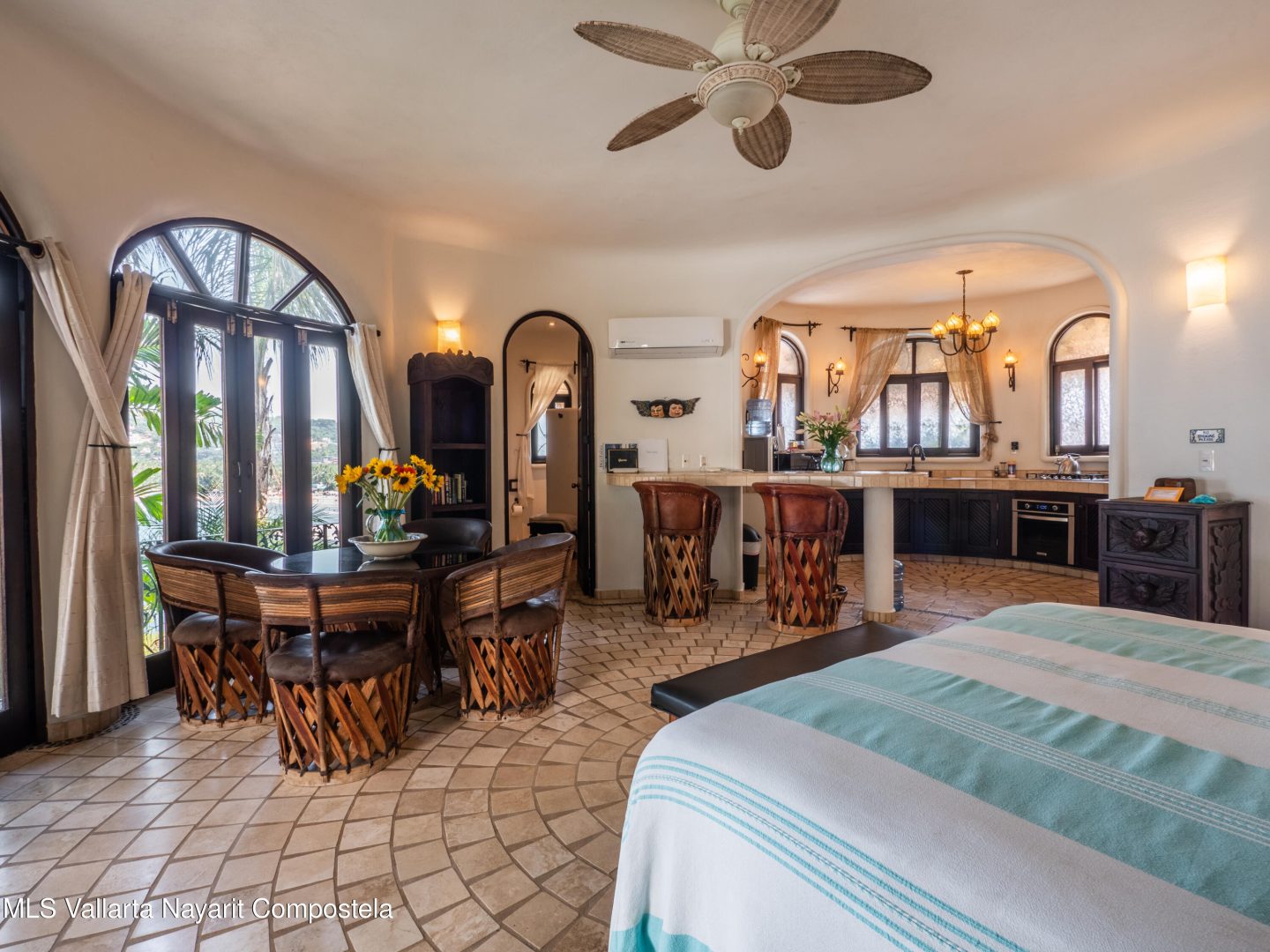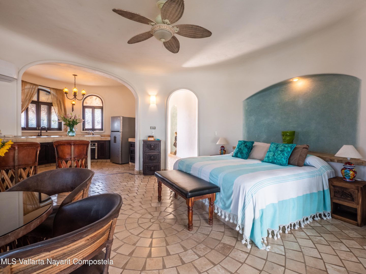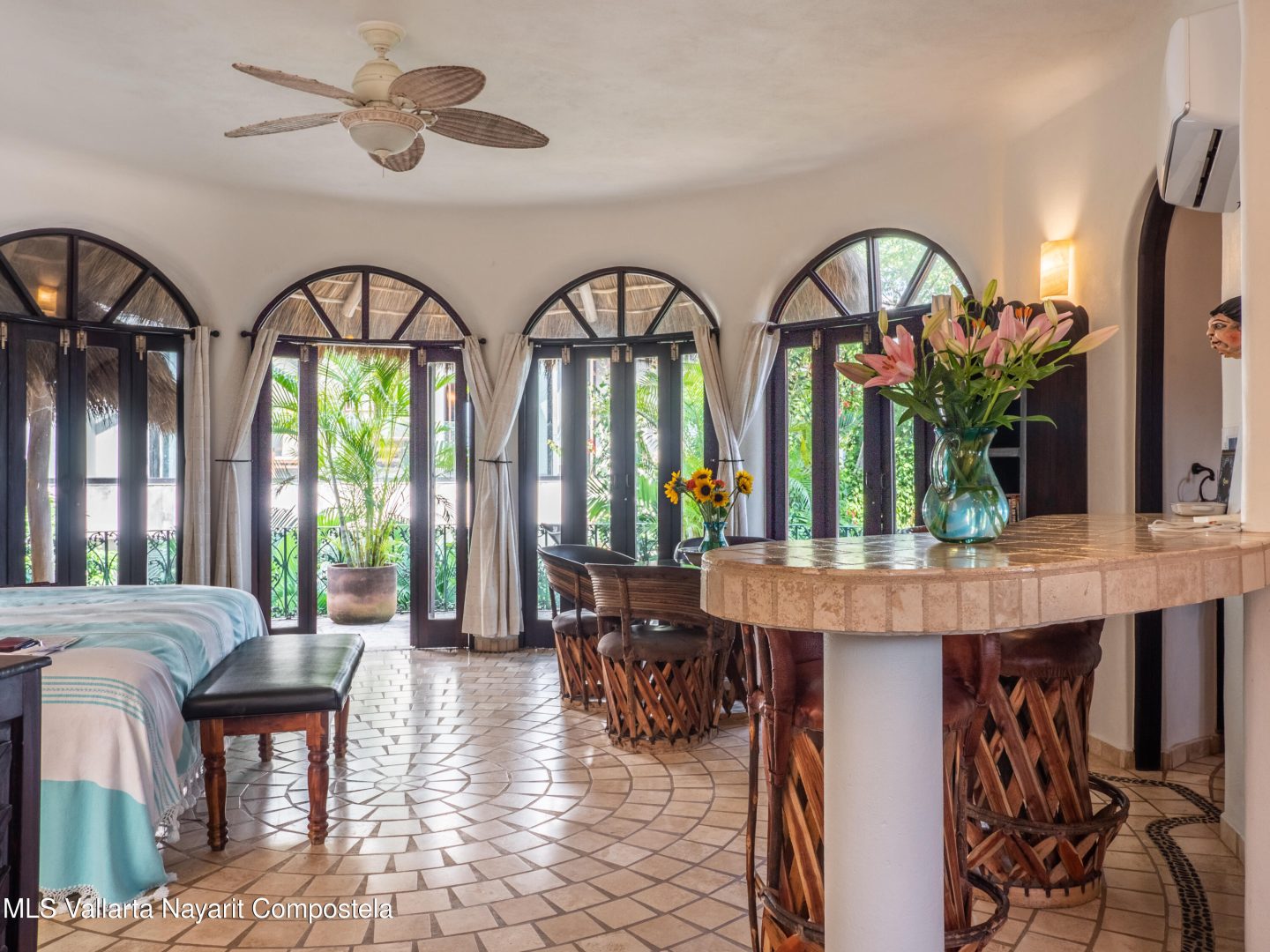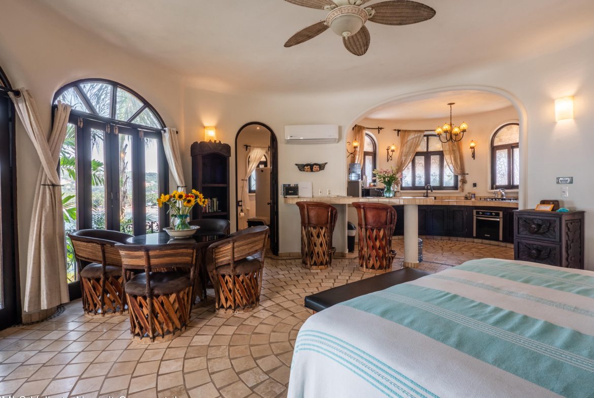 Casa Lorca/Hafiz is a spacious ground-floor unit with 2 bedrooms and 2 bathrooms, offering flexibility to be used as a single large residence or divided into two separate rentals. Each unit has a private entrance, one with a full kitchen and the other with a kitchenette. The property features a large private terrace and was designed by Mexican architect Miguel Valverde, with unique details such as arched windows, curved walls, and handcrafted furniture. Residents enjoy access to a saltwater infinity pool, lush gardens, and exclusive golf cart parking. Located at the southern tip of Sayulita Bay, it’s close to the beach, local shops, and vibrant restaurants.