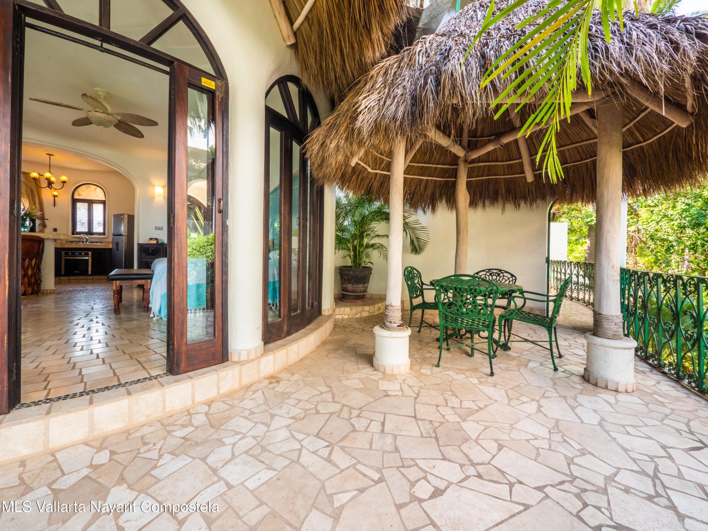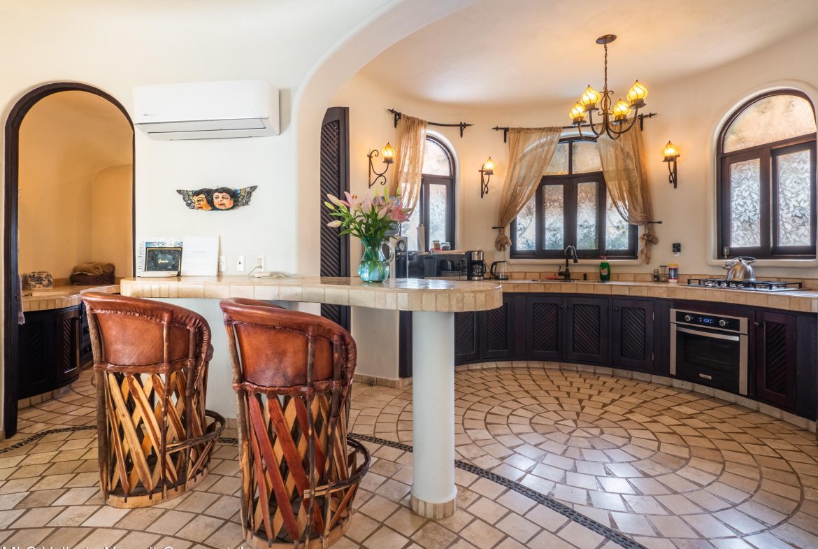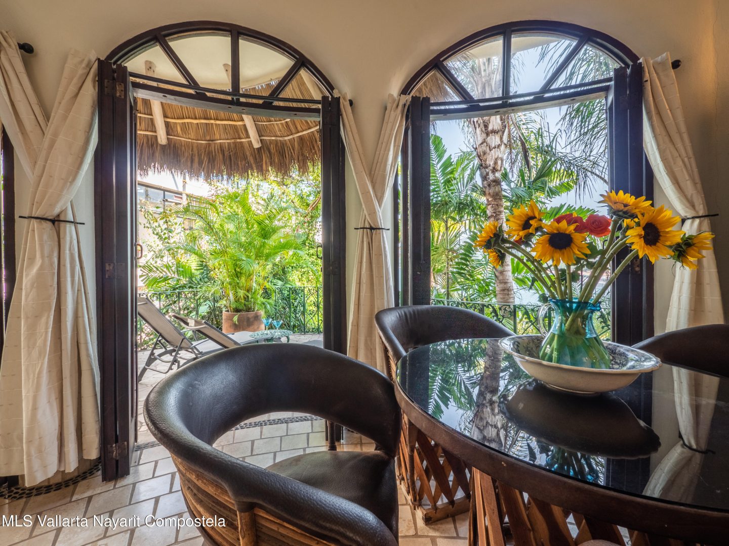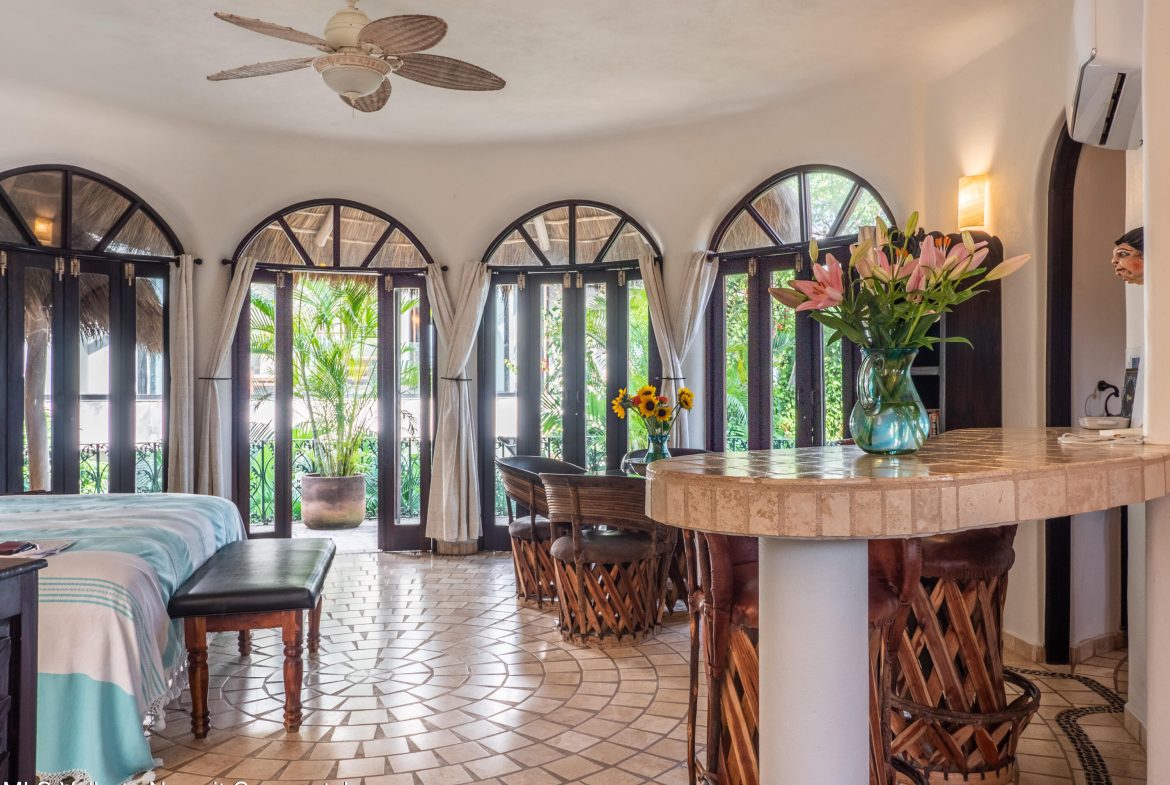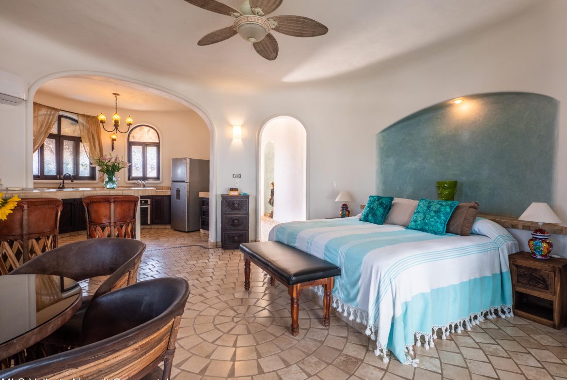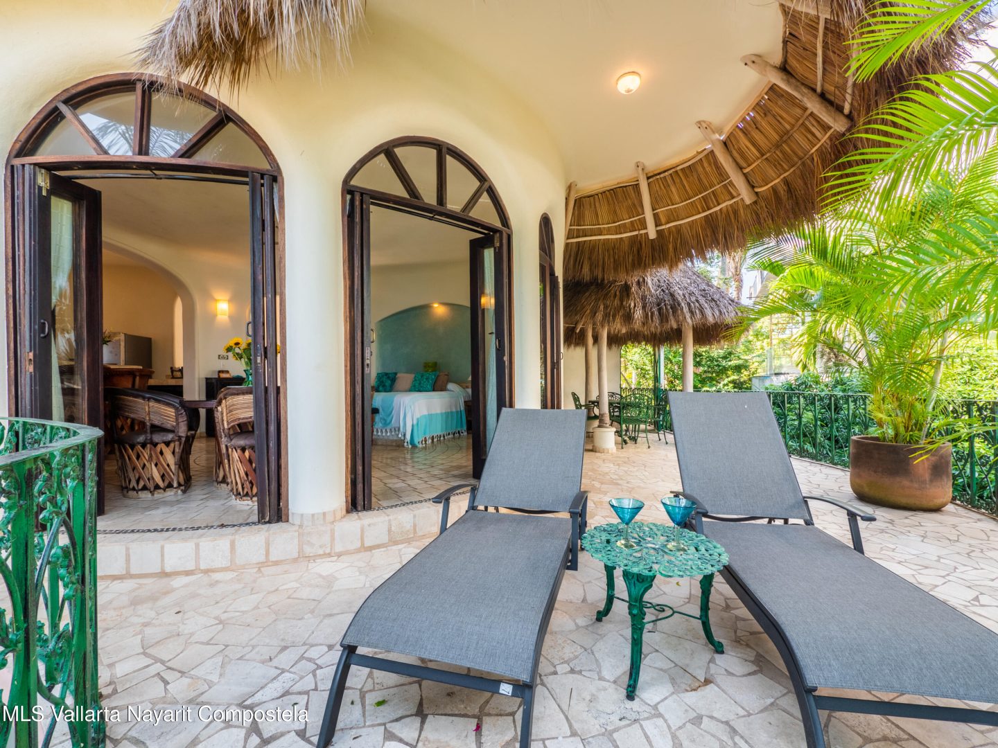 Casa Lorca/Hafiz is a spacious ground-floor unit with 2 bedrooms and 2 bathrooms, offering flexibility to be used as a single large residence or divided into two separate rentals. Each unit has a private entrance, one with a full kitchen and the other with a kitchenette. The property features a large private terrace and was designed by Mexican architect Miguel Valverde, with unique details such as arched windows, curved walls, and handcrafted furniture. Residents enjoy access to a saltwater infinity pool, lush gardens, and exclusive golf cart parking. Located at the southern tip of Sayulita Bay, it’s close to the beach, local shops, and vibrant restaurants.