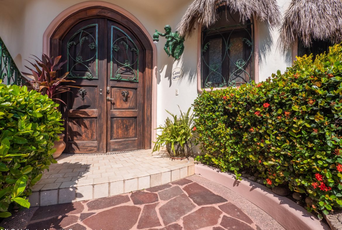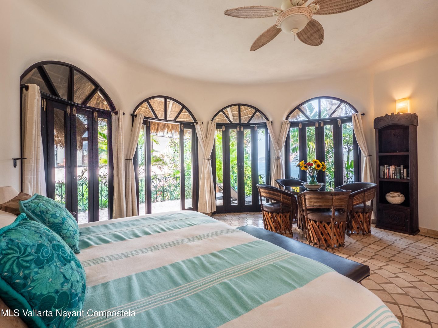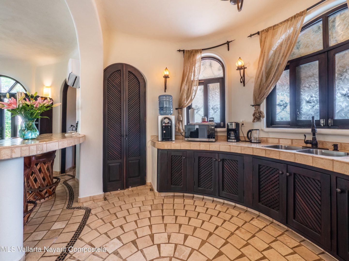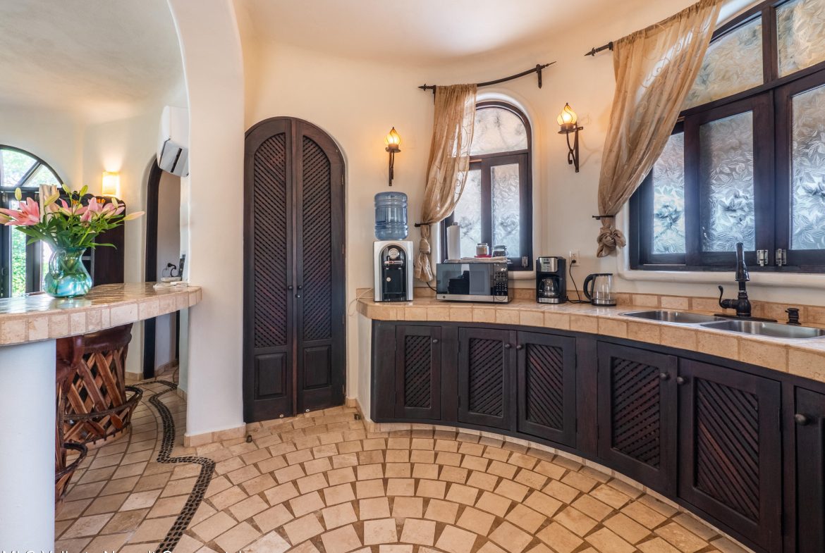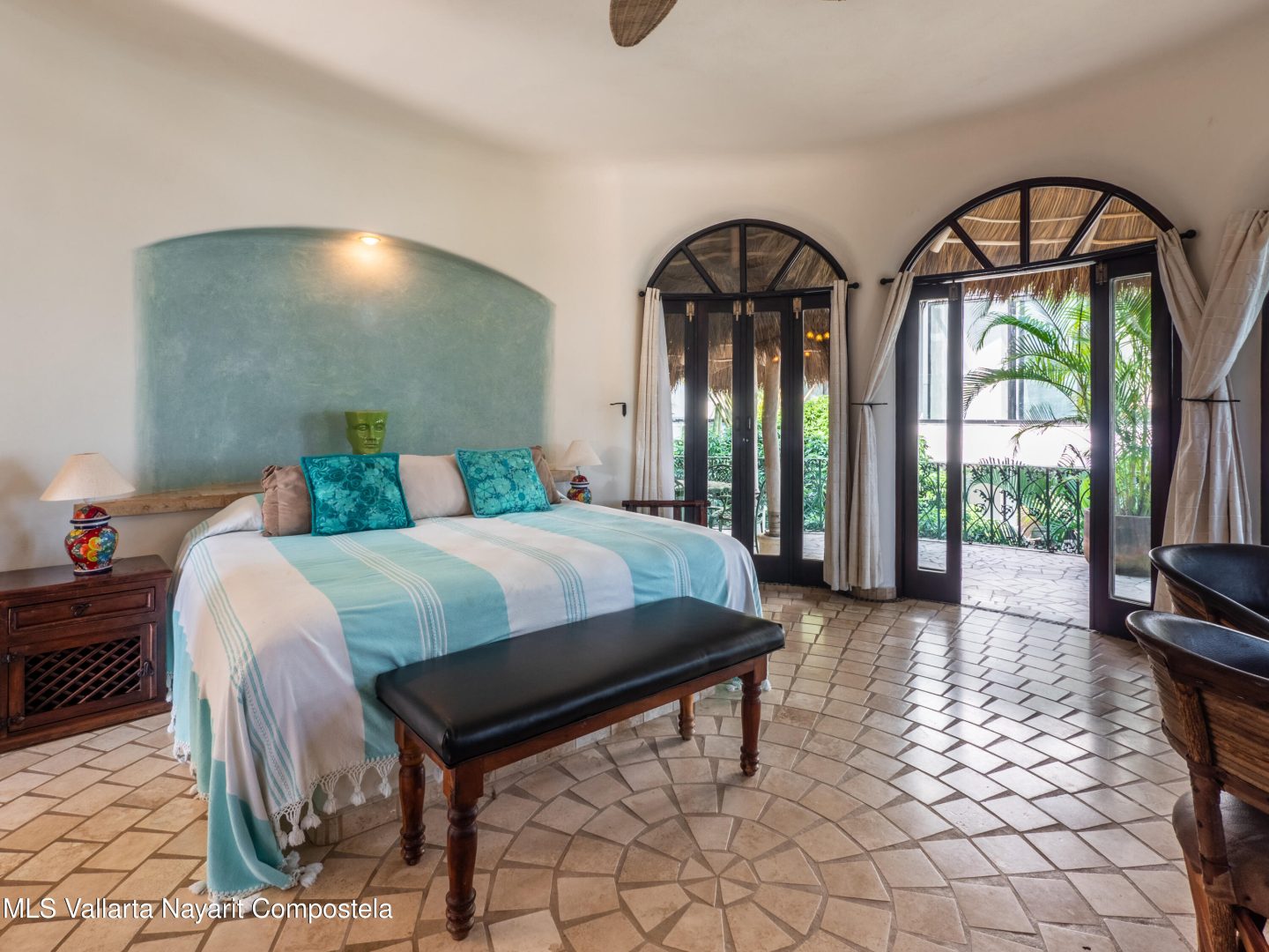 Casa Lorca/Hafiz is a spacious ground-floor unit with 2 bedrooms and 2 bathrooms, offering flexibility to be used as a single large residence or divided into two separate rentals. Each unit has a private entrance, one with a full kitchen and the other with a kitchenette. The property features a large private terrace and was designed by Mexican architect Miguel Valverde, with unique details such as arched windows, curved walls, and handcrafted furniture. Residents enjoy access to a saltwater infinity pool, lush gardens, and exclusive golf cart parking. Located at the southern tip of Sayulita Bay, it’s close to the beach, local shops, and vibrant restaurants.