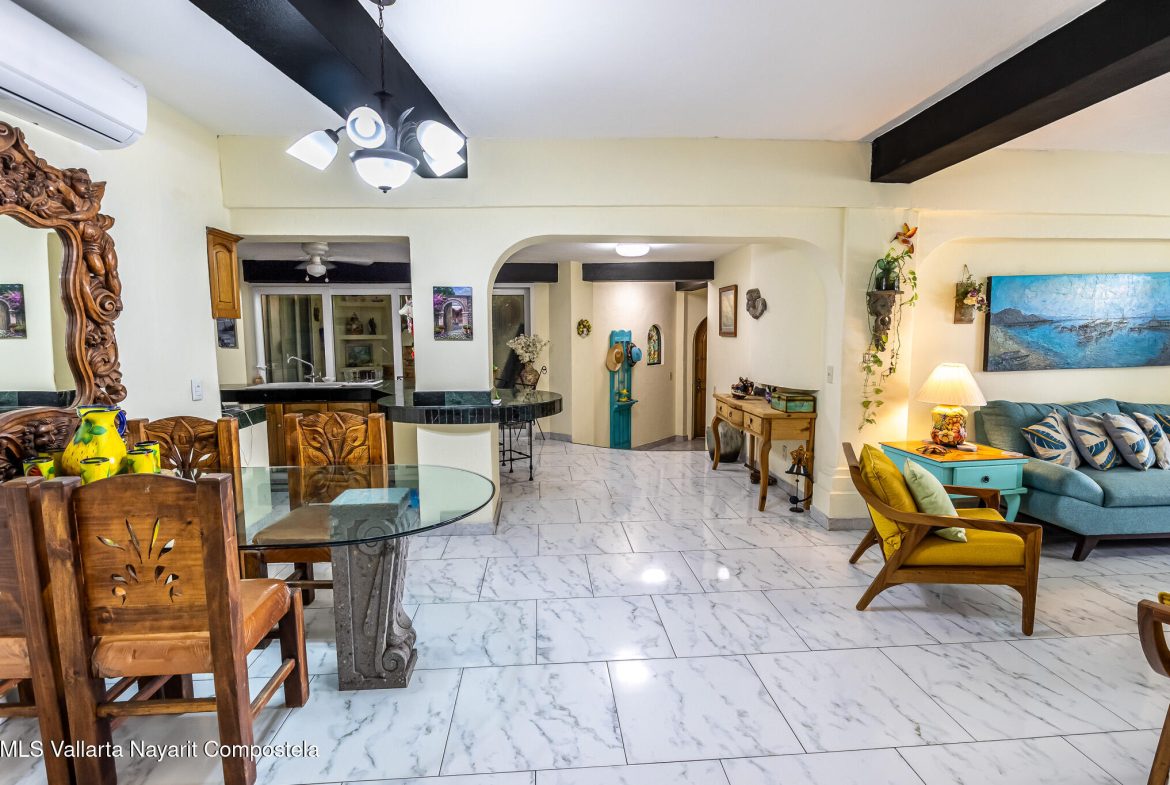 Discover this charming and spacious condominium located in Amapas, Puerto Vallarta, one of the area’s most desirable neighborhoods for its privacy, tranquility, and proximity to the beach. With 151.16 m of living space, this home offers a generous single-level layout that feels open, comfortable, and inviting.The condo features 2 bedrooms and 2 bathrooms, along with an open kitchen and a bright living area that flows directly onto one of its standout highlights: a covered terrace with an ocean view–perfect for relaxing, hosting guests, or enjoying Puerto Vallarta’s famous sunsets.Situated on the 6th floor of a 7-story building, the property enjoys excellent natural light, great airflow, and a warm, welcoming atmosphere ideal for full-time living or vacation rentals.