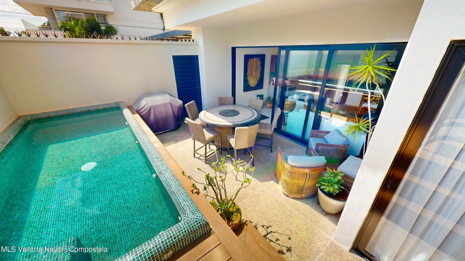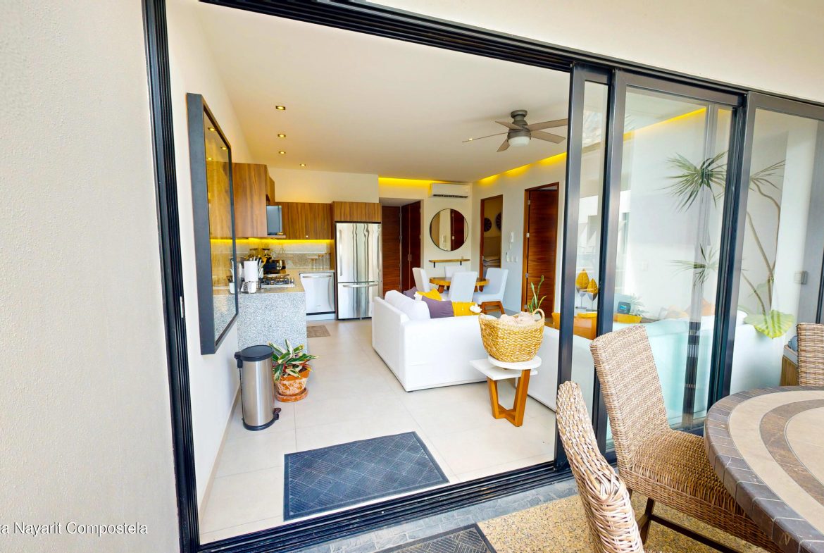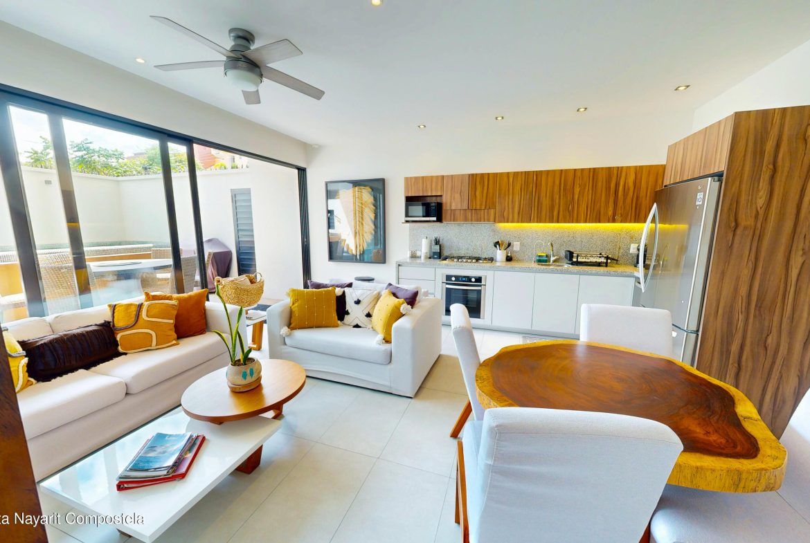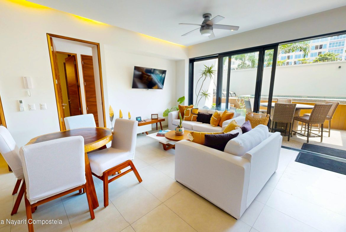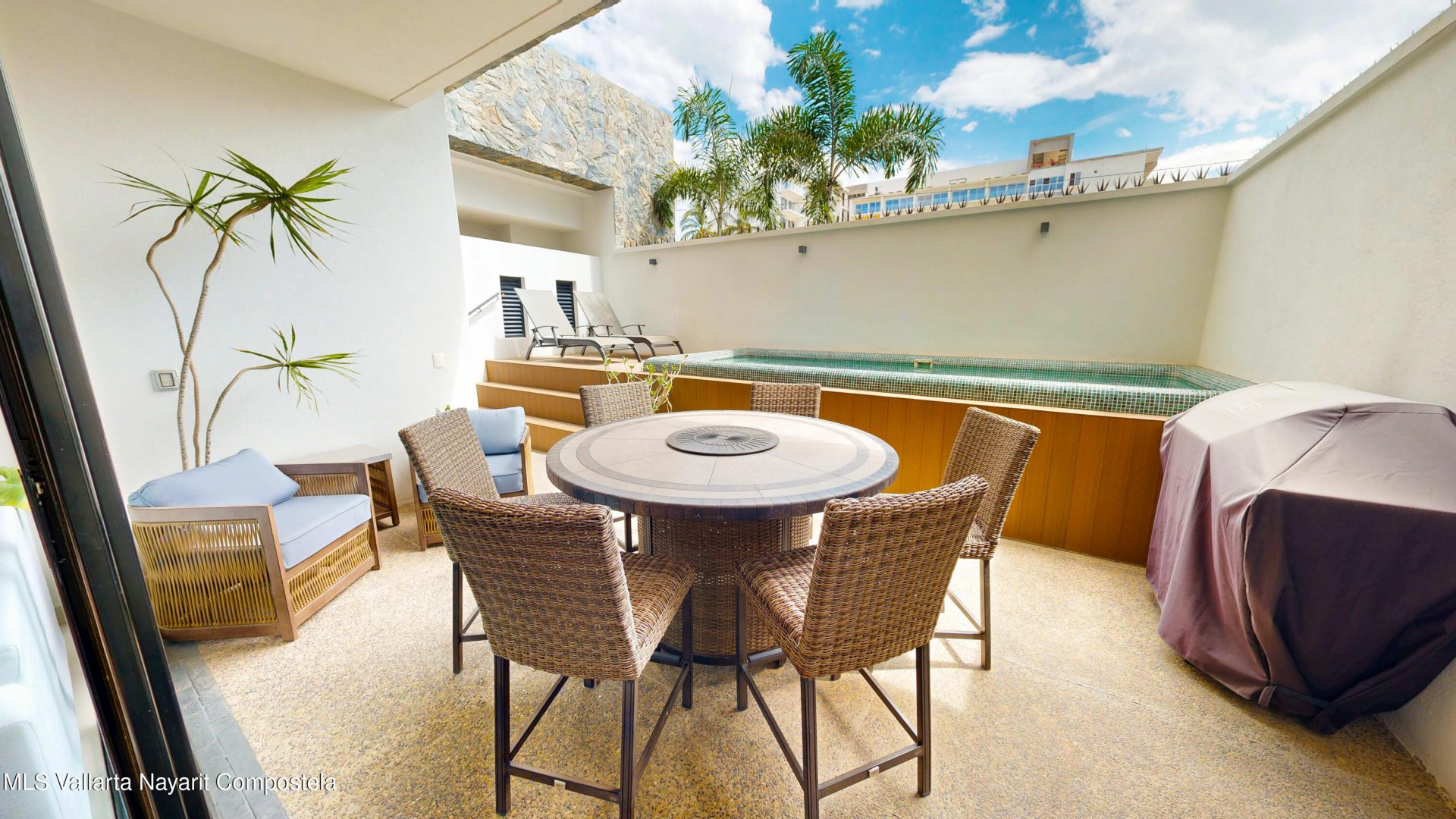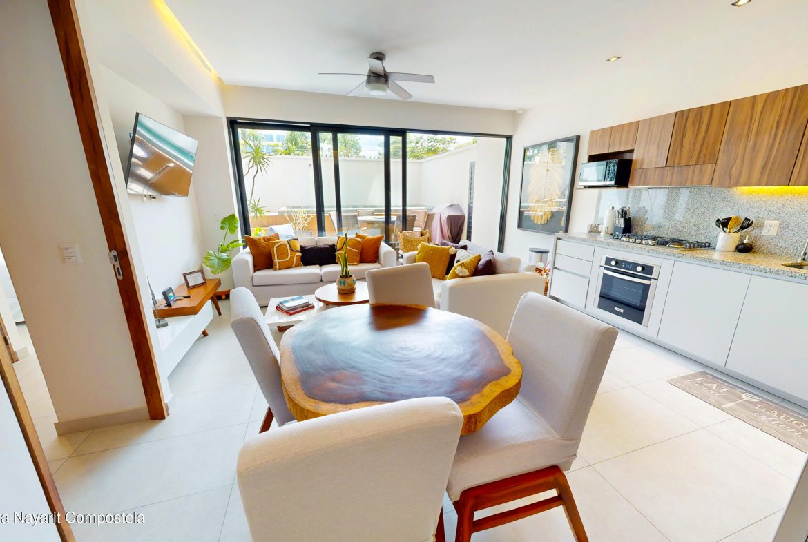 ***ENGLISH BELOW***La Unidad 102 en MINA Residences es un departamento de 2 recamaras y 2 banos ubicado en la Zona Dorada de Bucerias. La unidad cuenta con 127.55 m de espacio habitable bien disenado, ofreciendo privacidad, comodidad y abundante luz natural.La sala y el comedor de concepto abierto se conectan de manera fluida con una cocina totalmente equipada. La recamara principal incluye bano privado, y ambas recamaras son de generosas dimensiones.Esta unidad cuenta con un amplio patio con piscina privada y asador, ofreciendo un espacio exterior exclusivo. Los residentes tambien tienen acceso a la piscina infinita en la azotea y a las areas comunes del edificio, en un entorno seguro y de baja densidad.