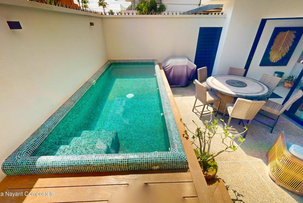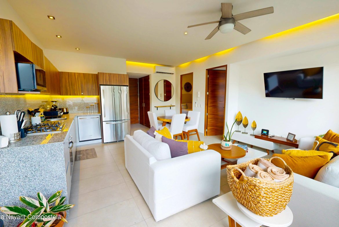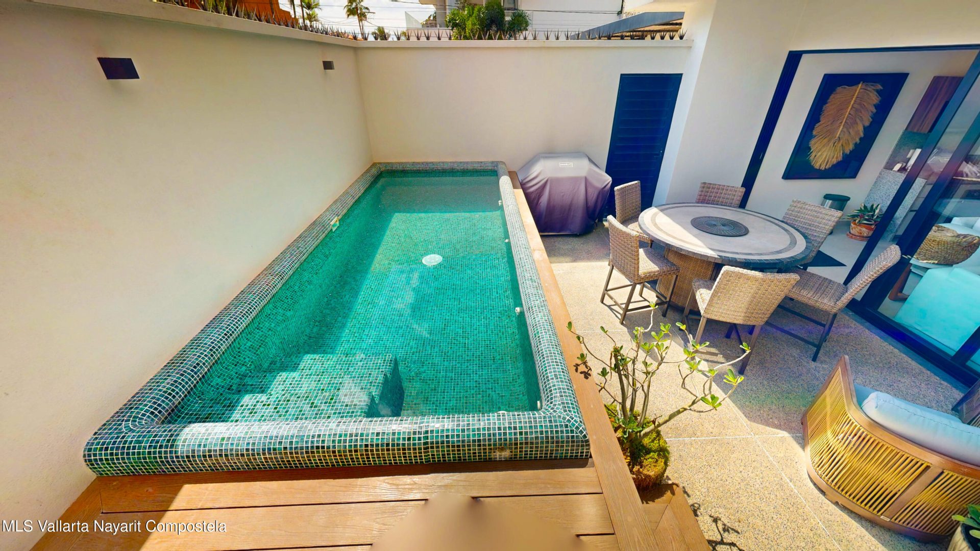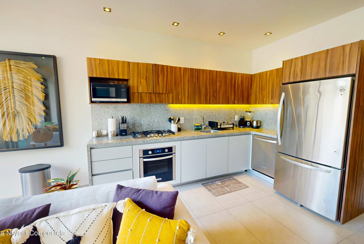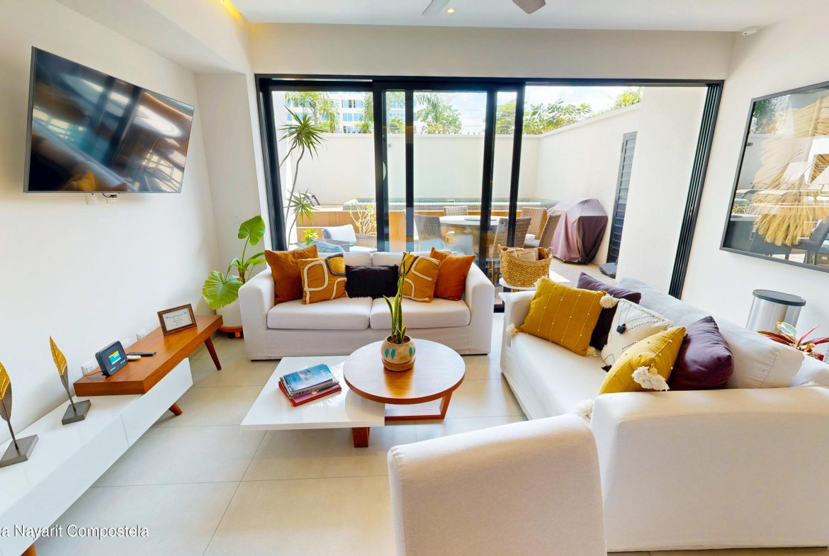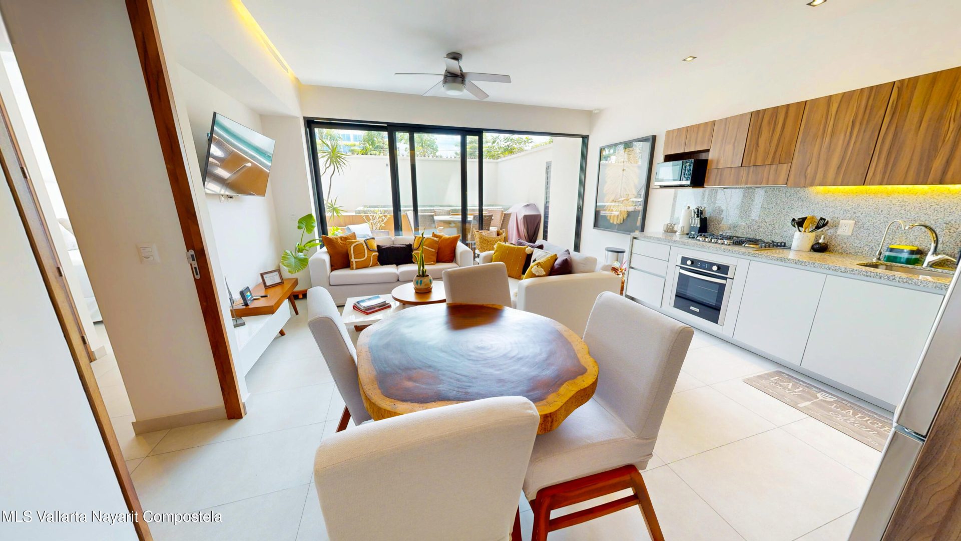 ***ENGLISH BELOW***La Unidad 102 en MINA Residences es un departamento de 2 recamaras y 2 banos ubicado en la Zona Dorada de Bucerias. La unidad cuenta con 127.55 m de espacio habitable bien disenado, ofreciendo privacidad, comodidad y abundante luz natural.La sala y el comedor de concepto abierto se conectan de manera fluida con una cocina totalmente equipada. La recamara principal incluye bano privado, y ambas recamaras son de generosas dimensiones.Esta unidad cuenta con un amplio patio con piscina privada y asador, ofreciendo un espacio exterior exclusivo. Los residentes tambien tienen acceso a la piscina infinita en la azotea y a las areas comunes del edificio, en un entorno seguro y de baja densidad.
