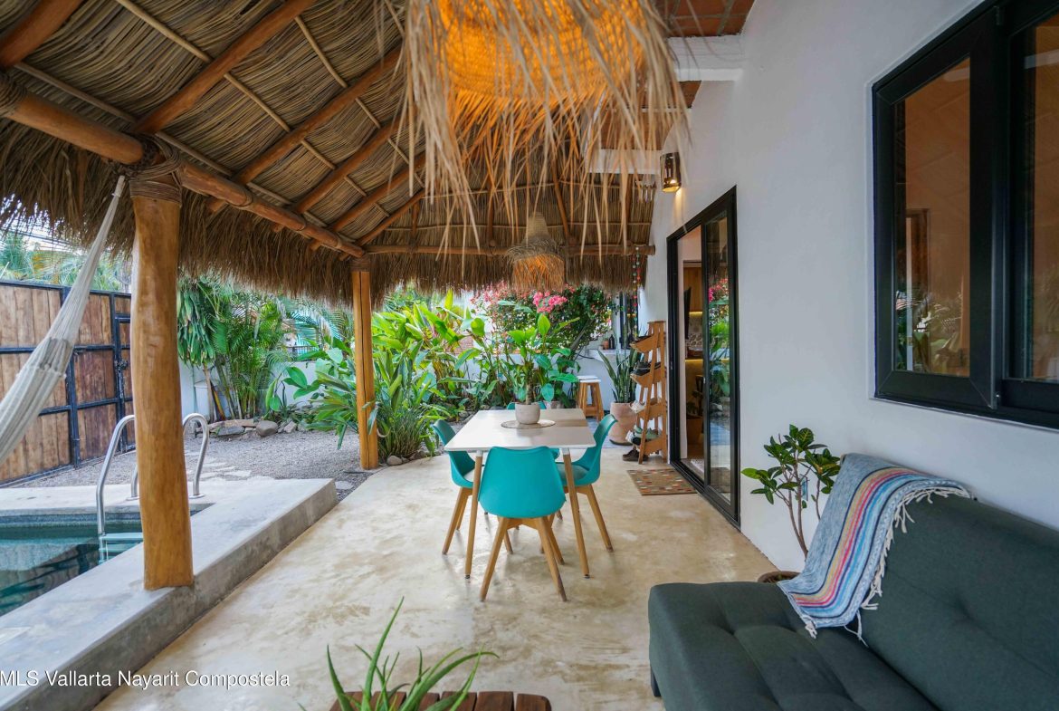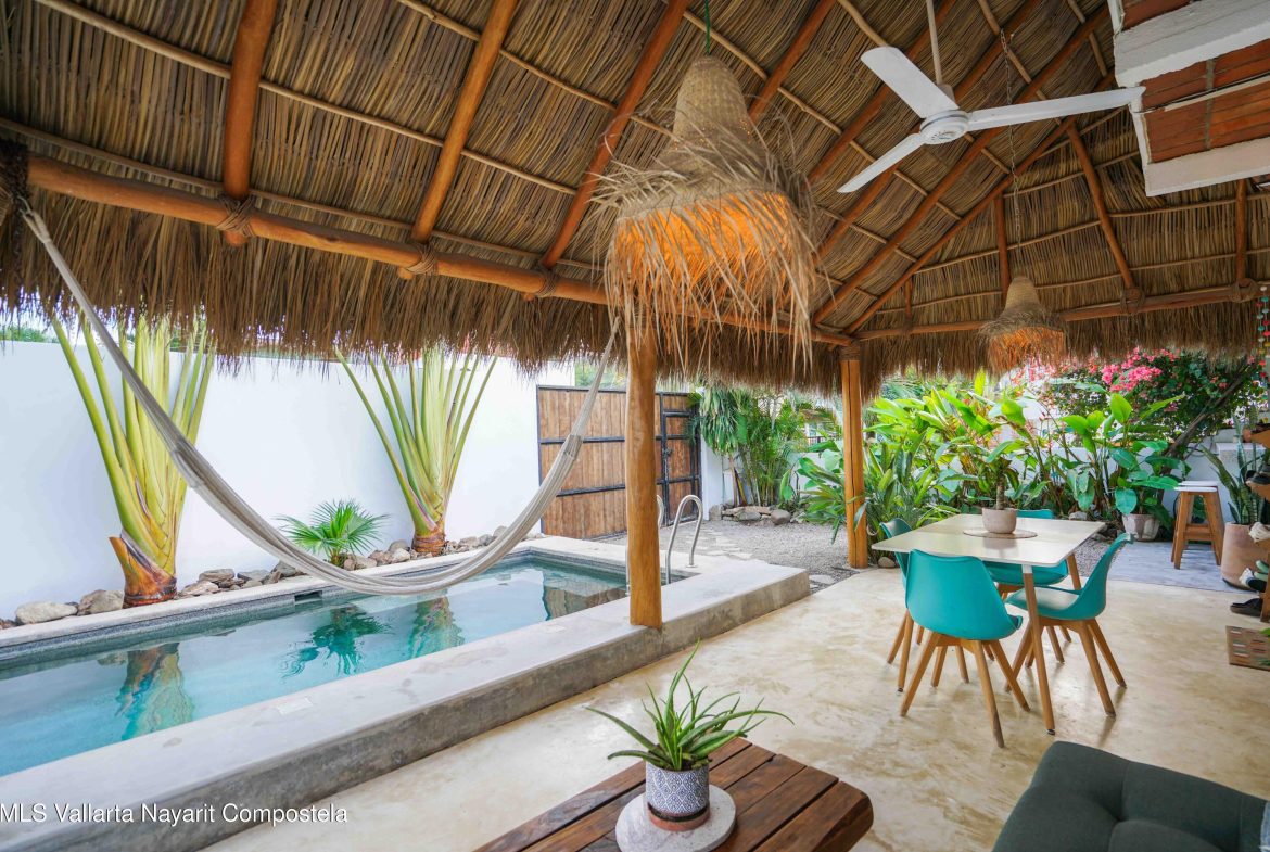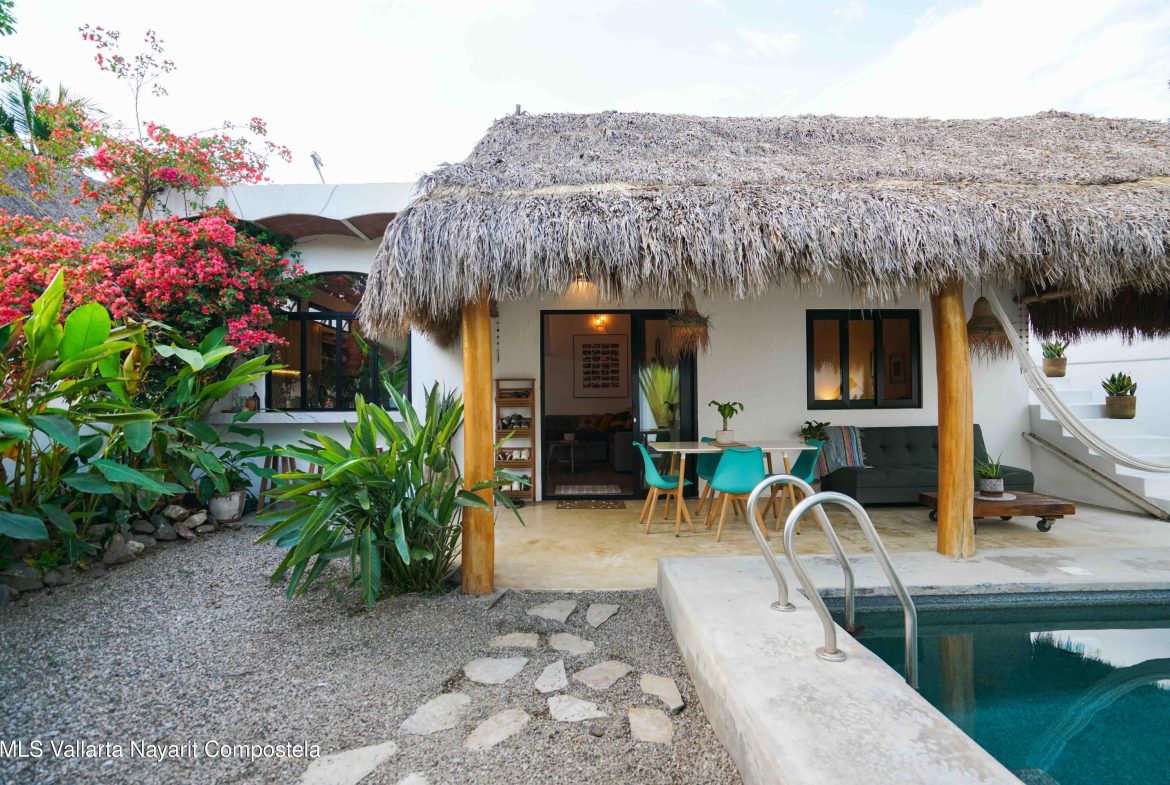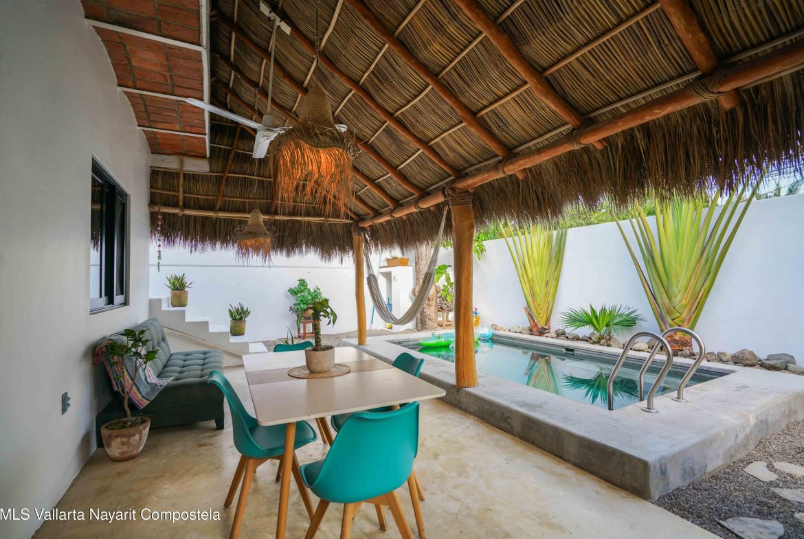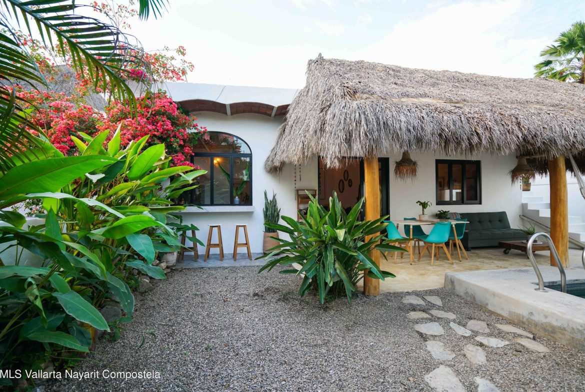 This property is located in the main area of San Pancho, already a popular and up-and-coming area, a perfect mix of lush green nature, the Sierra Madre mountains and the sea, offering many fun water sports. This 2 bedroom, 2 bathroom home with a private pool and private backyard boasts simple, natural elements with a beautiful, functional space.The folding kitchen window opens to the outside bar, and the home is sold fully furnished and turnkey, ready to rent or move into immediately. It also includes a dedicated workspace and reliable cable internet. Currently built on one floor, the option to add a second level is easily available, making it ideal for a family or investment rental. It’s a 2-minute drive to the beach and close to restaurants, bars and shops, nestled in a quiet area