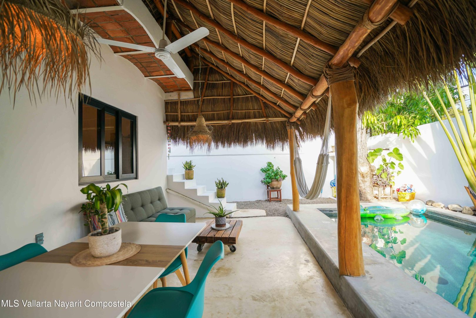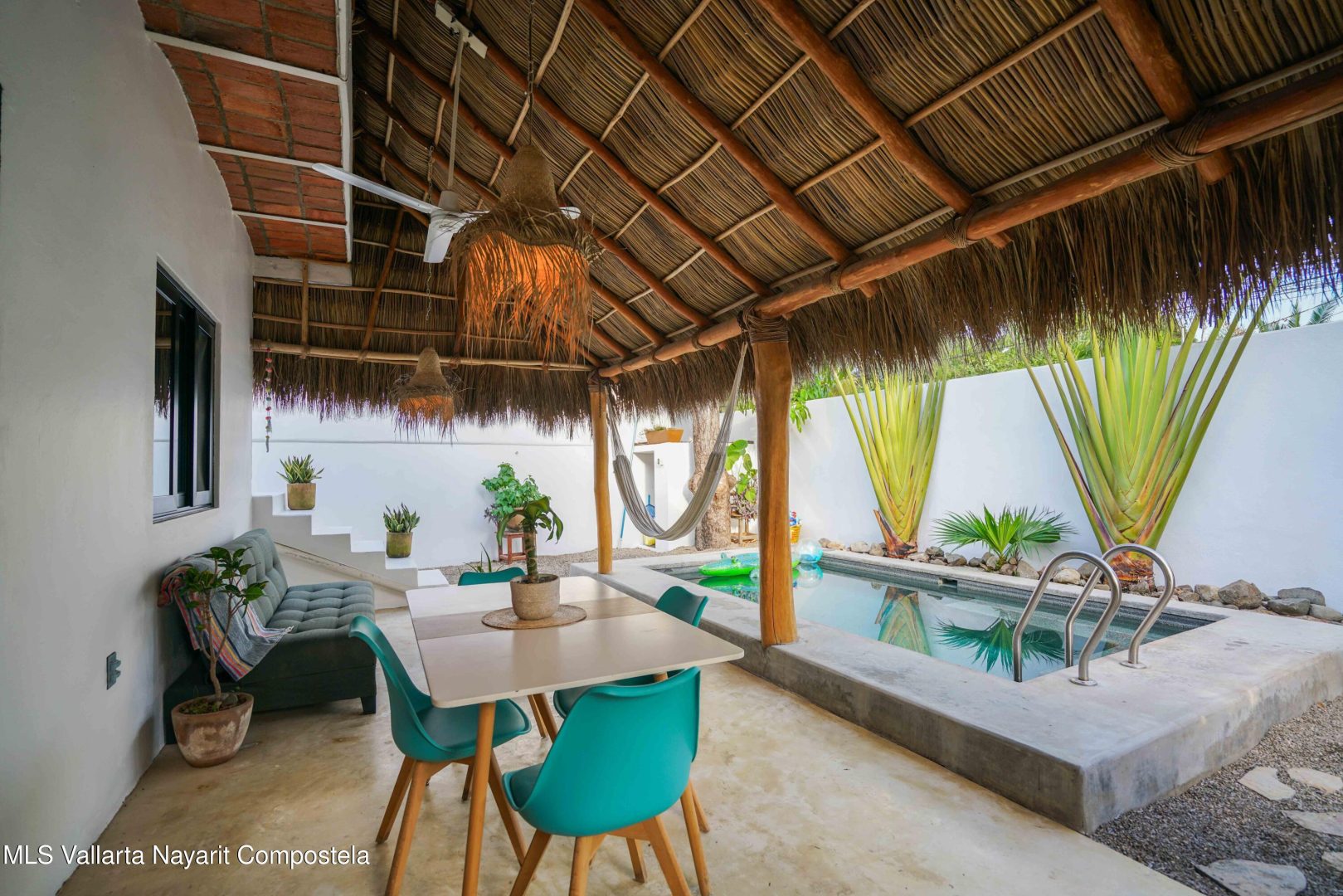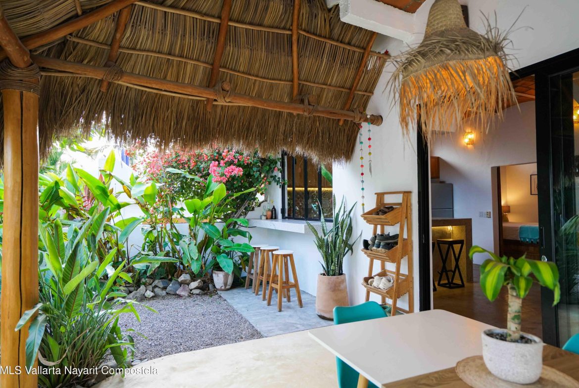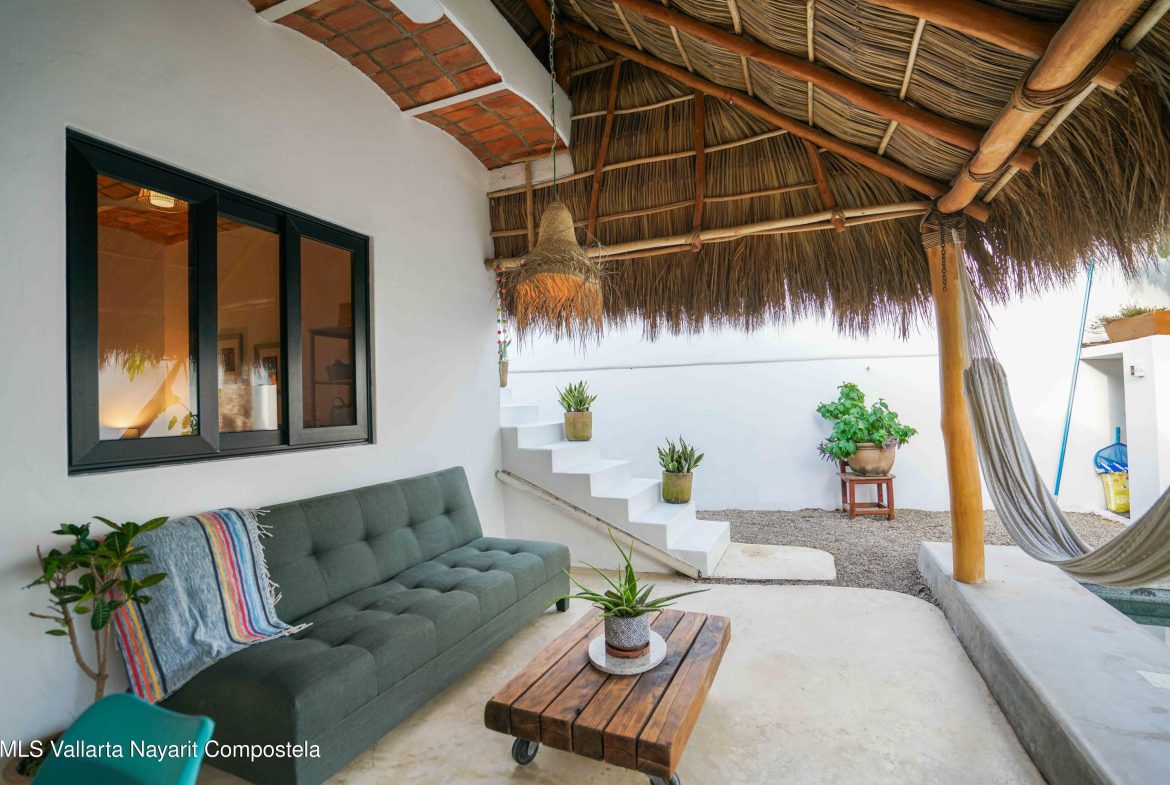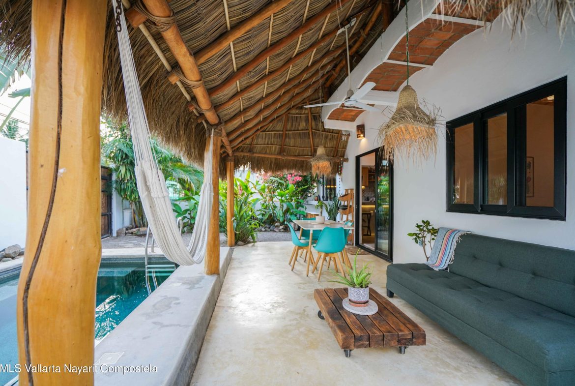 This property is located in the main area of San Pancho, already a popular and up-and-coming area, a perfect mix of lush green nature, the Sierra Madre mountains and the sea, offering many fun water sports. This 2 bedroom, 2 bathroom home with a private pool and private backyard boasts simple, natural elements with a beautiful, functional space.The folding kitchen window opens to the outside bar, and the home is sold fully furnished and turnkey, ready to rent or move into immediately. It also includes a dedicated workspace and reliable cable internet. Currently built on one floor, the option to add a second level is easily available, making it ideal for a family or investment rental. It’s a 2-minute drive to the beach and close to restaurants, bars and shops, nestled in a quiet area