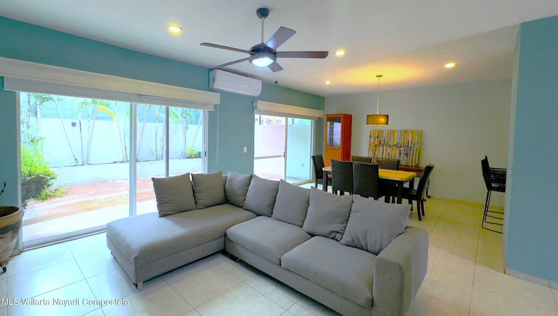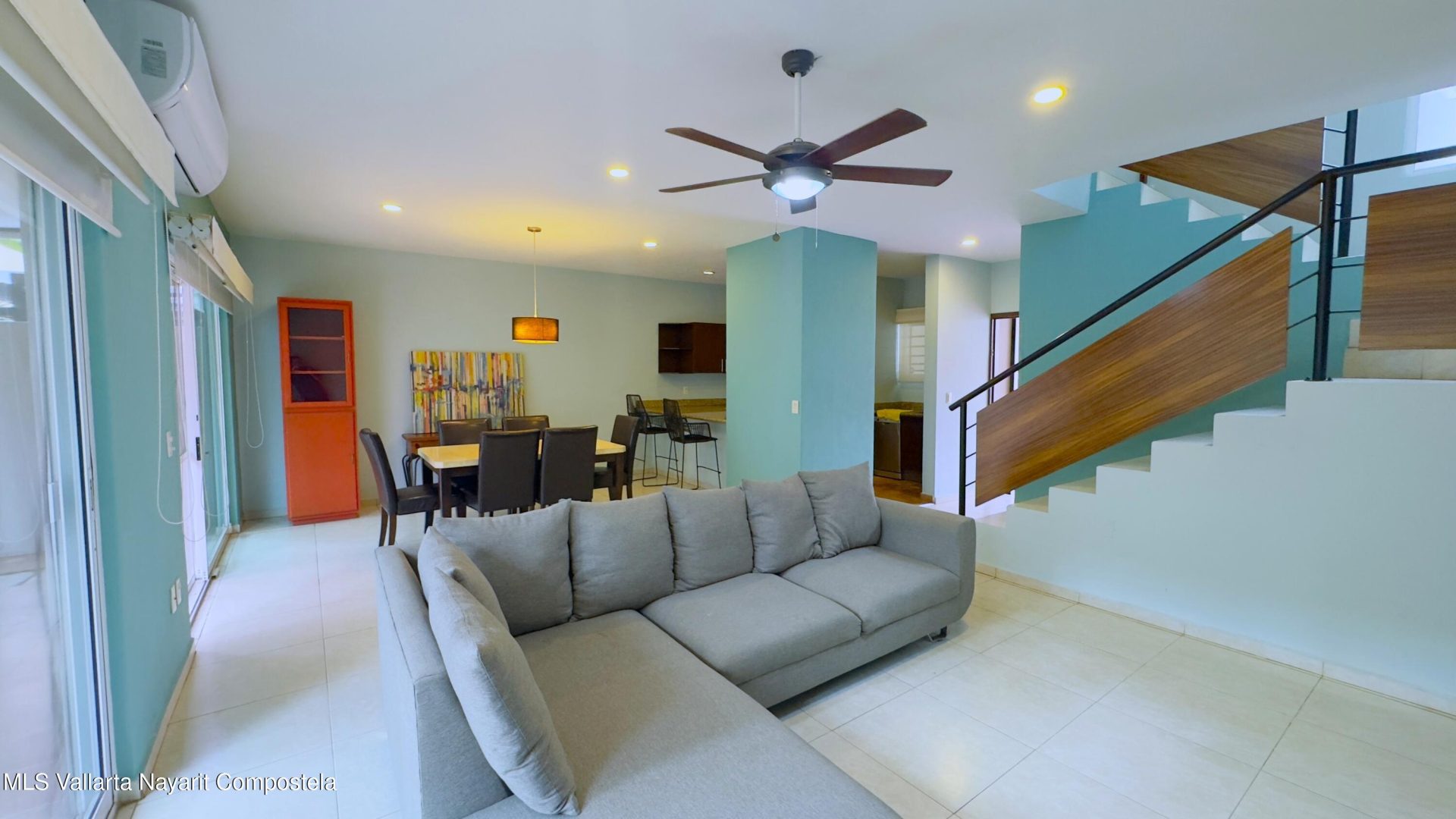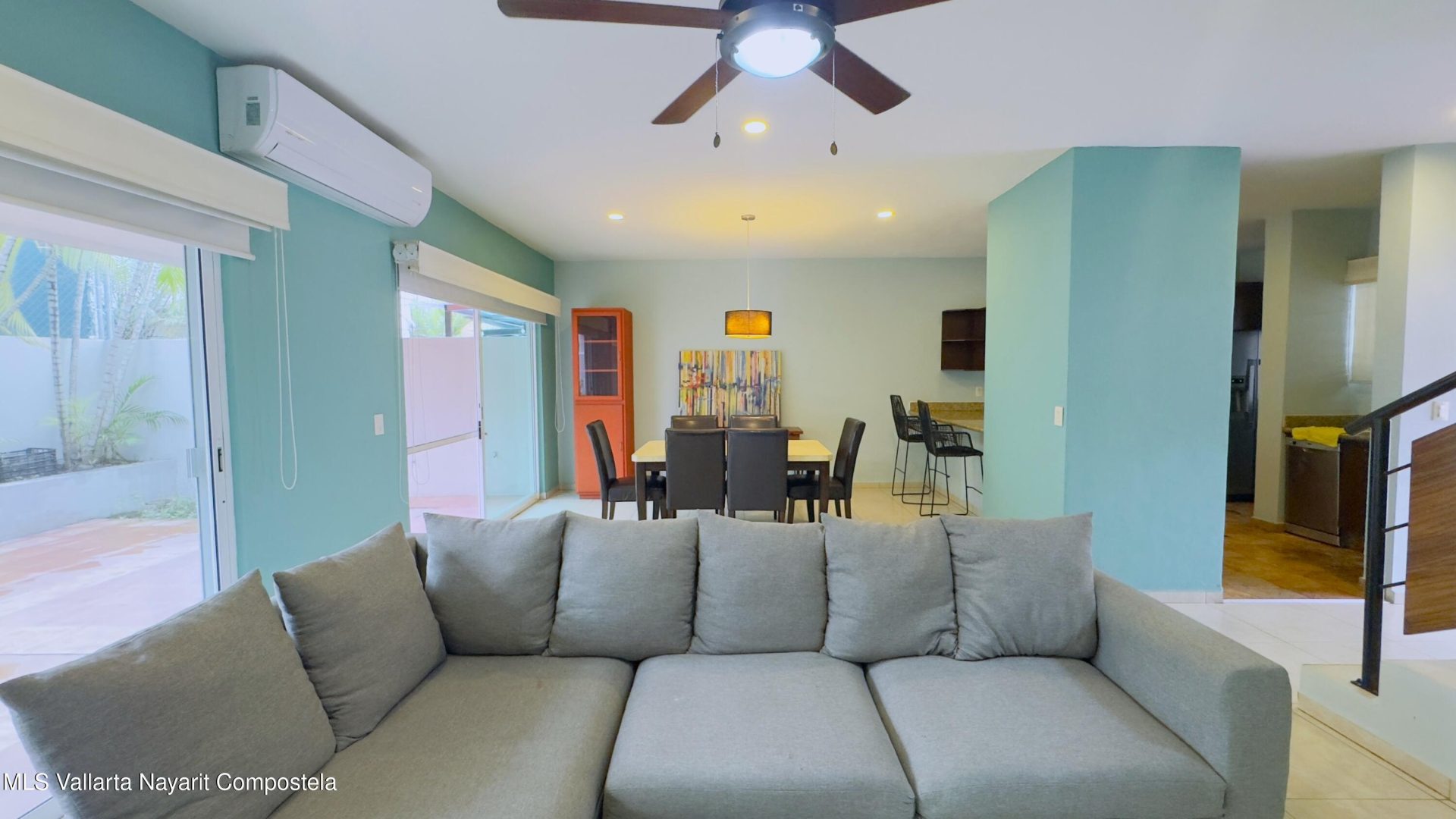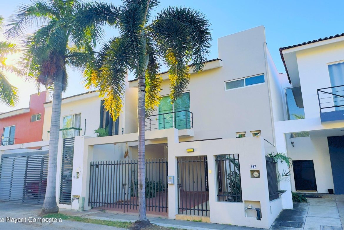 Casa de 2 niveles en Fluvial Vallarta. Cuenta con 3 recamaras en planta alta y 2.5 banos, la principal con balcon, walking closet y bano completo. En planta baja ofrece sala y comedor amplios con ventanales que conectan al patio trasero o terraza, jardineras y techo parcial, ideal para area social. Cocina integral con barra desayunadora, amplio almacenamiento y cuarto de lavado. Aire acondicionado y ventiladores de techo para mayor confort. Planta alta con dos recamaras secundarias con closet, aire acondicionado y ventilador de techo, que comparten bano completo. Cochera para 2 autos, parcialmente techada, con reja y piso ceramico. Cuenta con cisterna y tanque de gas estacionario.Se vende sin muebles, negociables. Precio en pesos: $8,400,000 MXN.