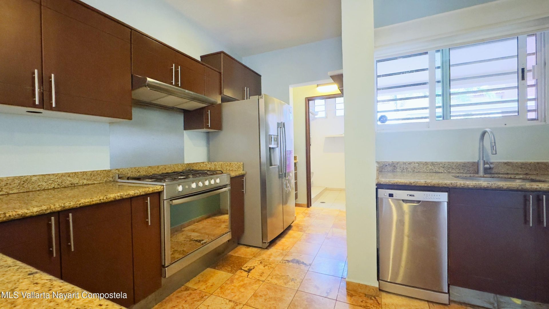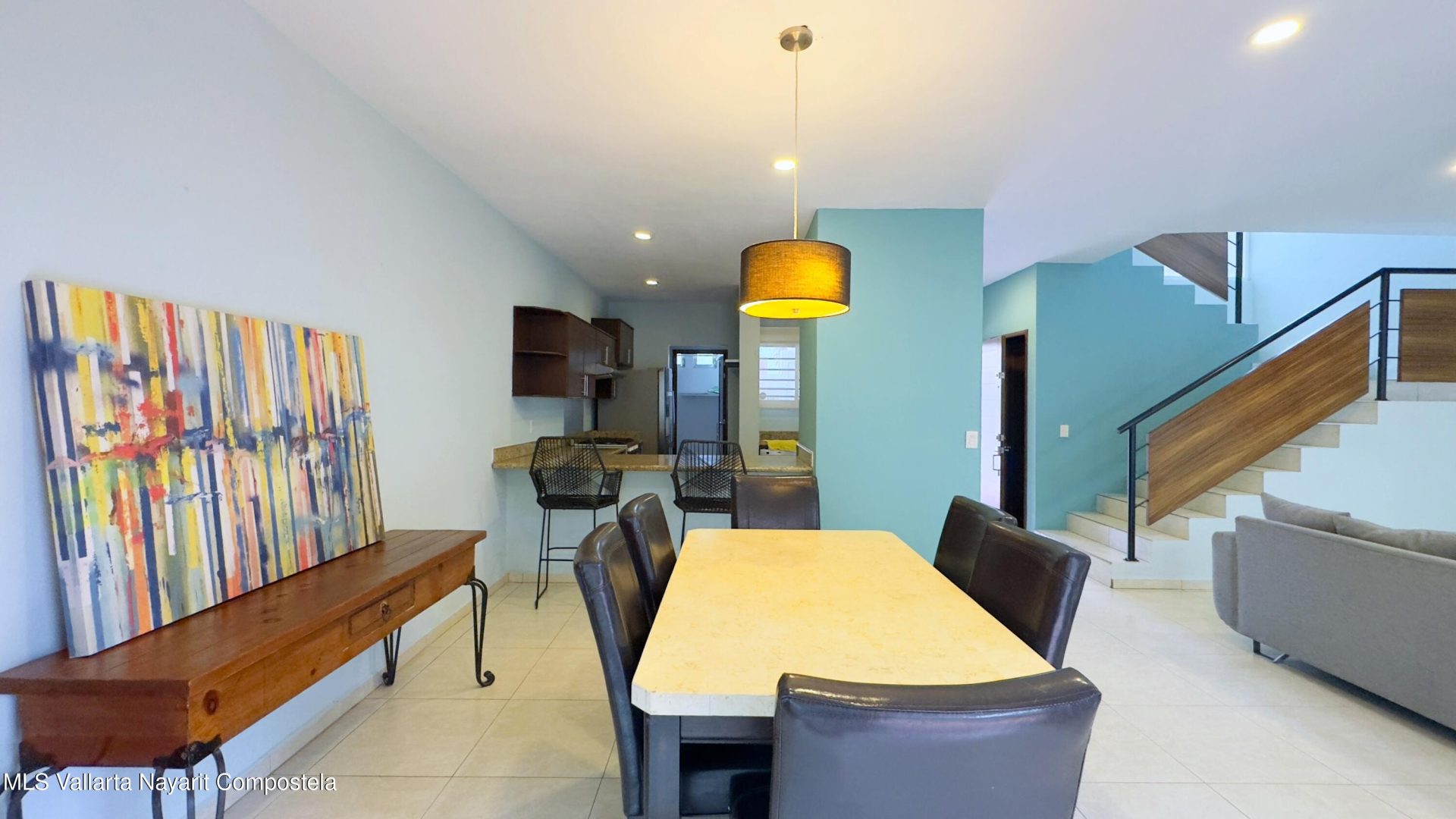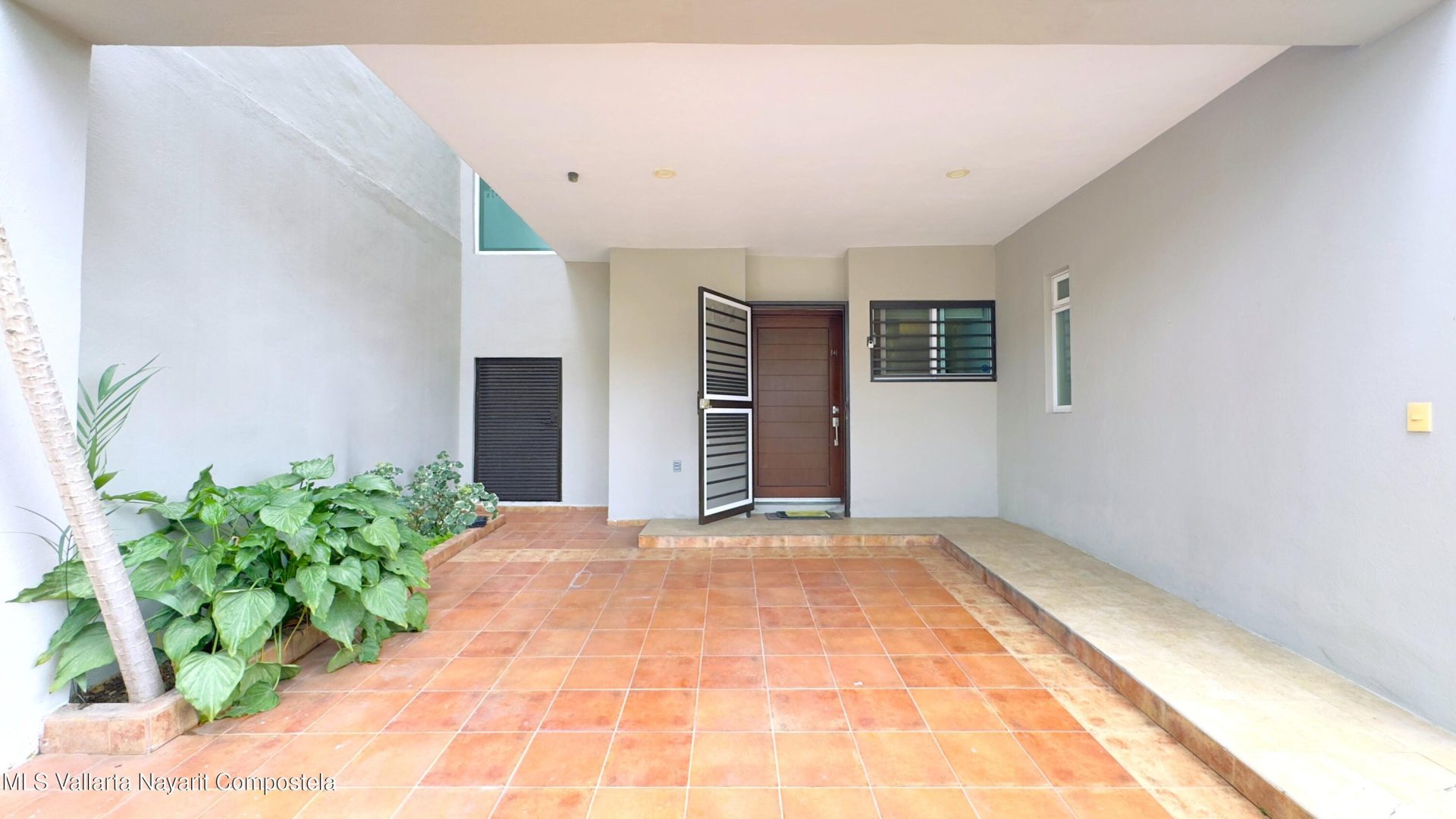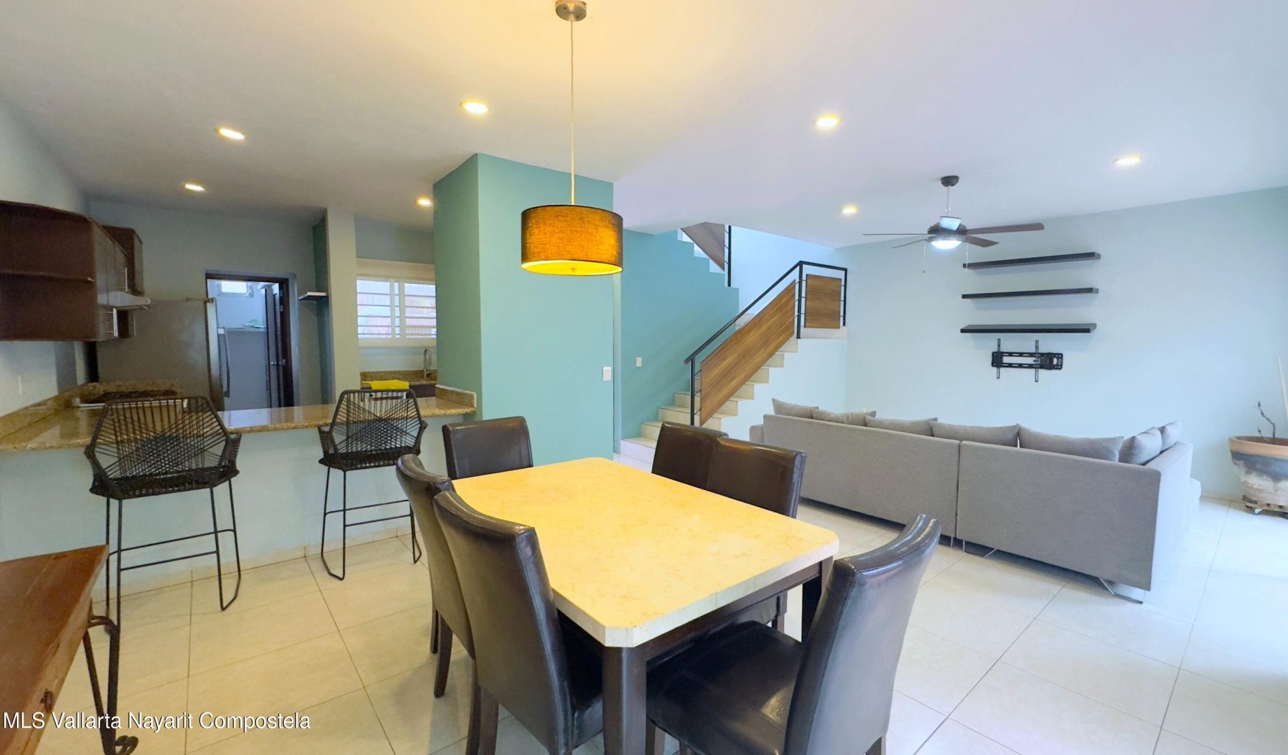 Casa de 2 niveles en Fluvial Vallarta. Cuenta con 3 recamaras en planta alta y 2.5 banos, la principal con balcon, walking closet y bano completo. En planta baja ofrece sala y comedor amplios con ventanales que conectan al patio trasero o terraza, jardineras y techo parcial, ideal para area social. Cocina integral con barra desayunadora, amplio almacenamiento y cuarto de lavado. Aire acondicionado y ventiladores de techo para mayor confort. Planta alta con dos recamaras secundarias con closet, aire acondicionado y ventilador de techo, que comparten bano completo. Cochera para 2 autos, parcialmente techada, con reja y piso ceramico. Cuenta con cisterna y tanque de gas estacionario.Se vende sin muebles, negociables. Precio en pesos: $8,400,000 MXN.