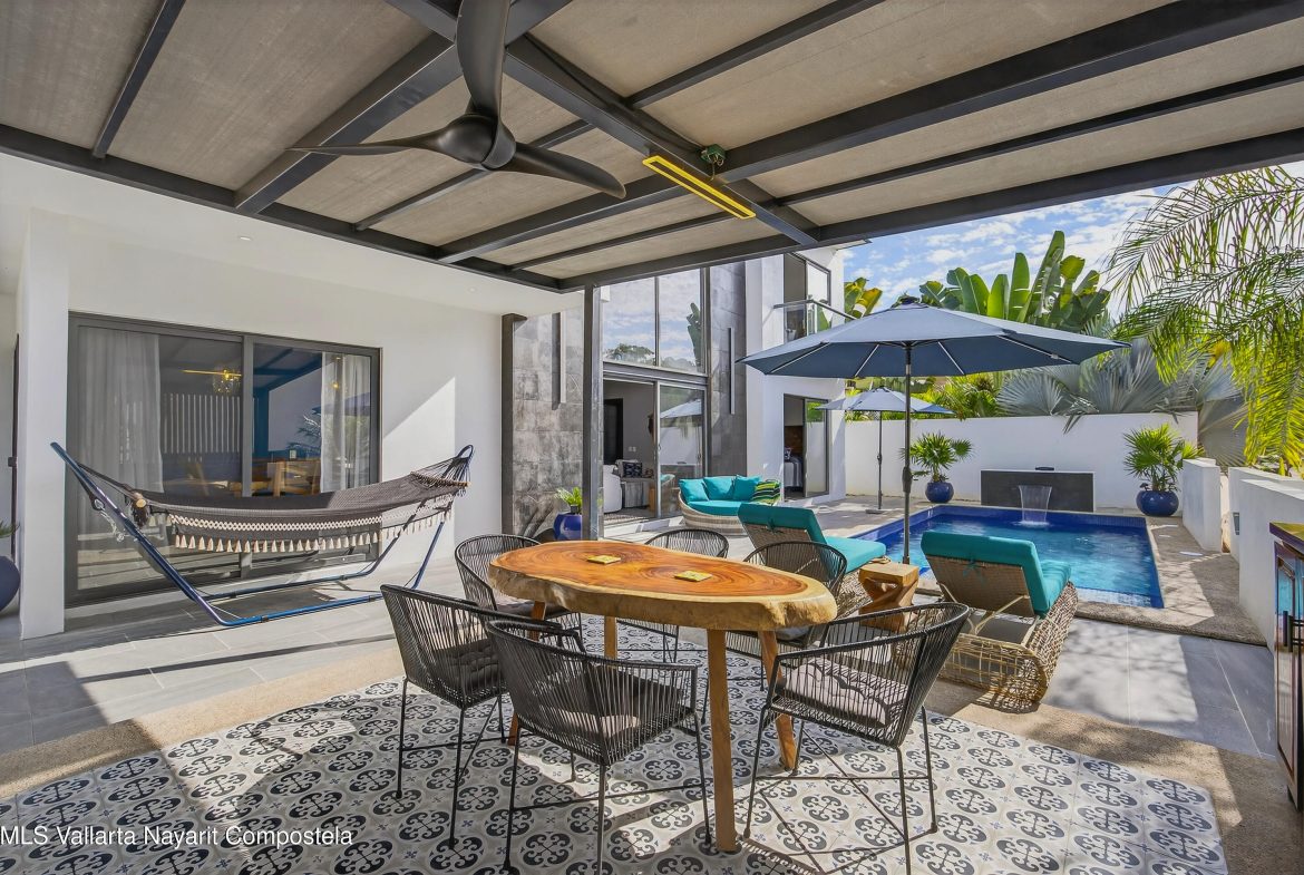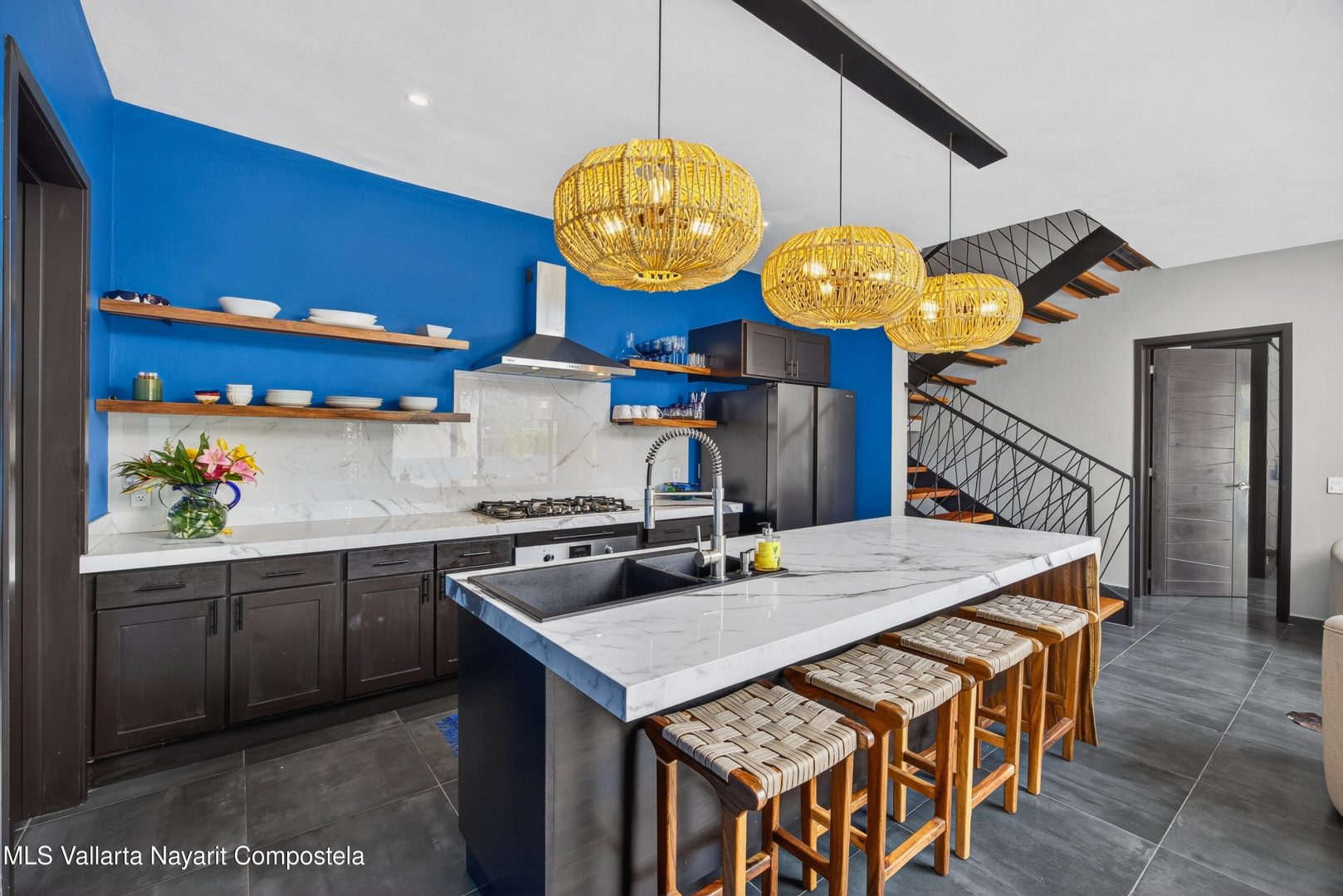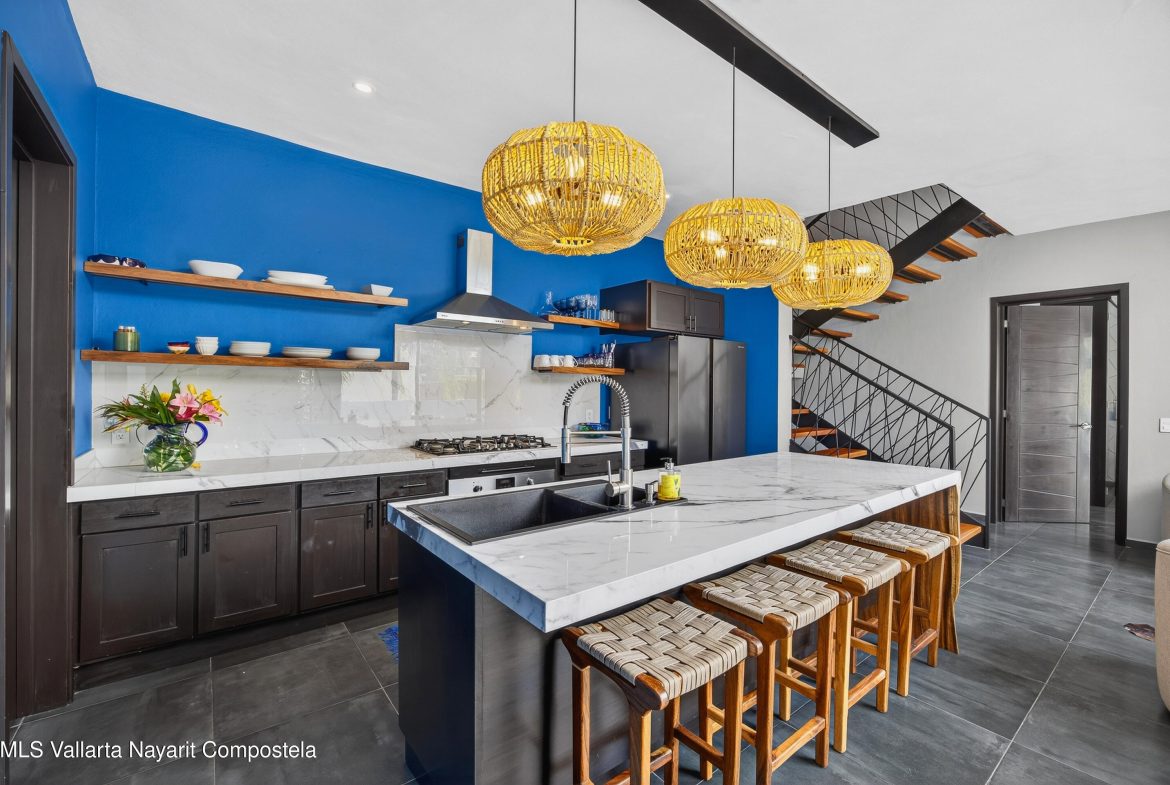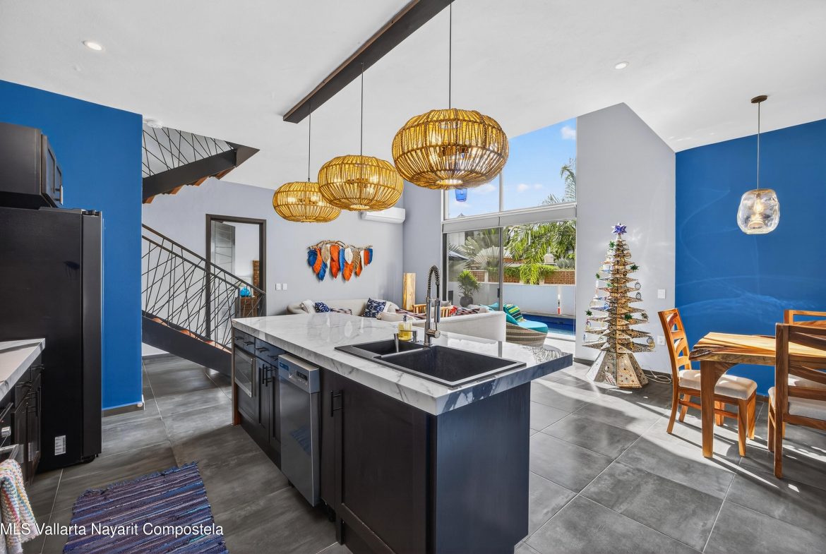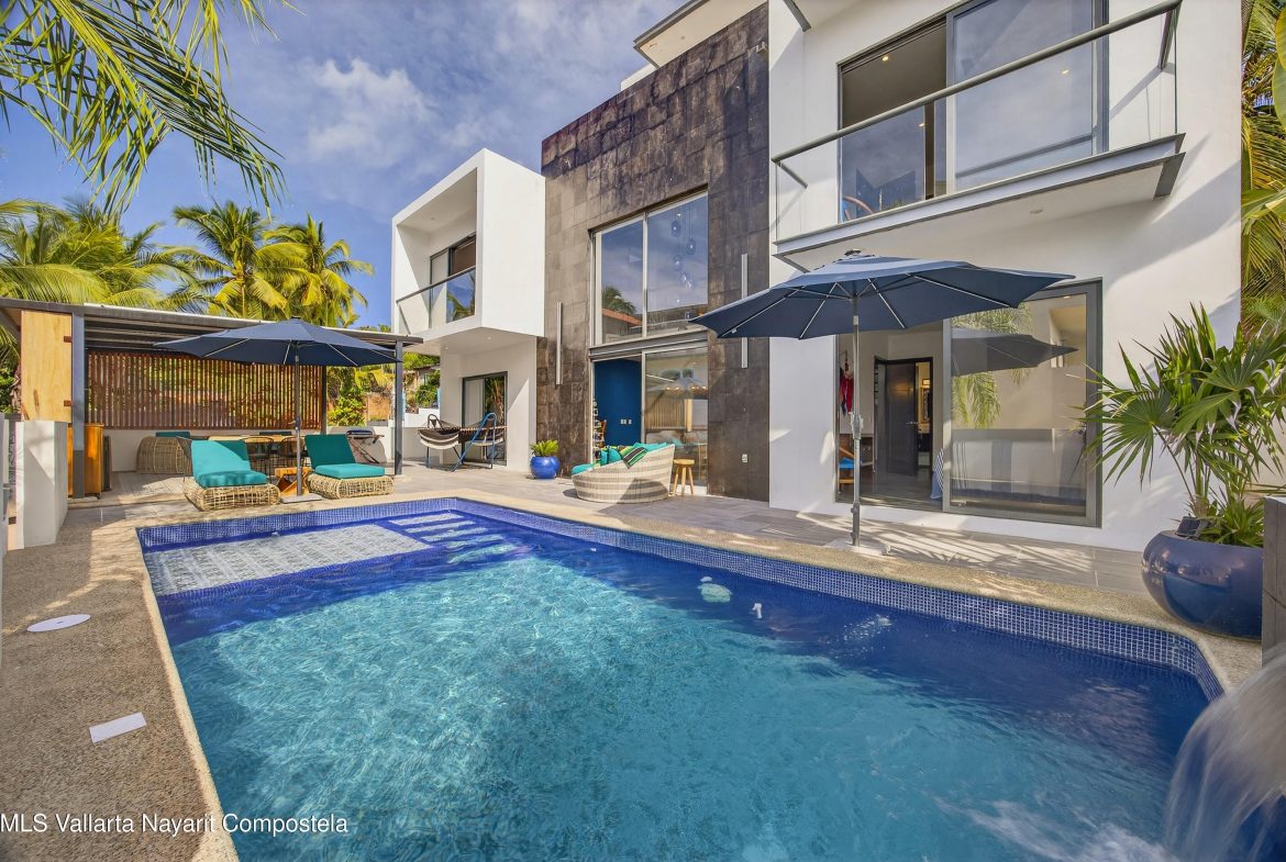 Casa Sol y Danza is a new modern home with ample natural light, an open kitchen with large prep island and open shelving. The focal point of the kitchen and living area is through large windows and sliding doors that open to a beautiful ornate pool complete with a shallow end for kids and/or just chillin’ with margaritas, surrounded by a large patio and outdoor bar lounge. It has three bedrooms, 3.5 bathrooms and a flex room that could be used as a gym, office, kids playroom or AV room. There is potential to put a pergola on the roof to catch evening sunsets reflected off the mountains that border the South end of San Pancho beach. Casa Sol y Danza is a 10 minute flat walk to the beach and all San Pancho restaurants and shops.
