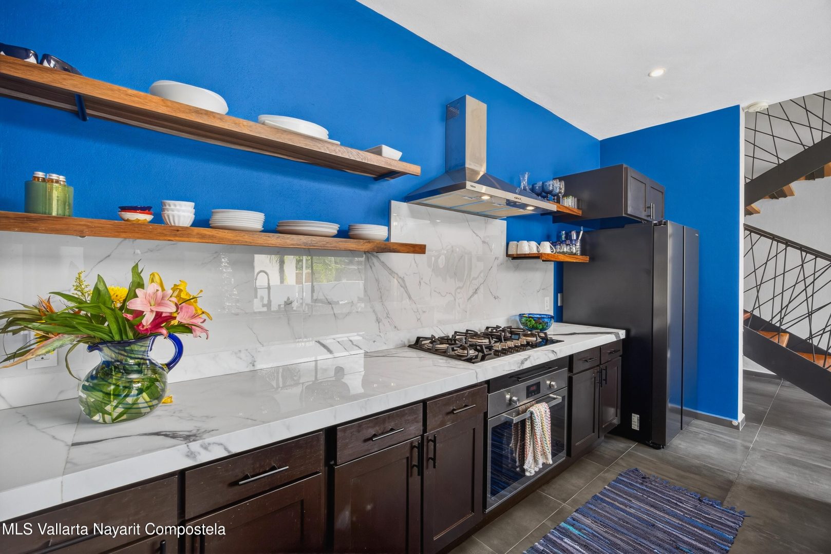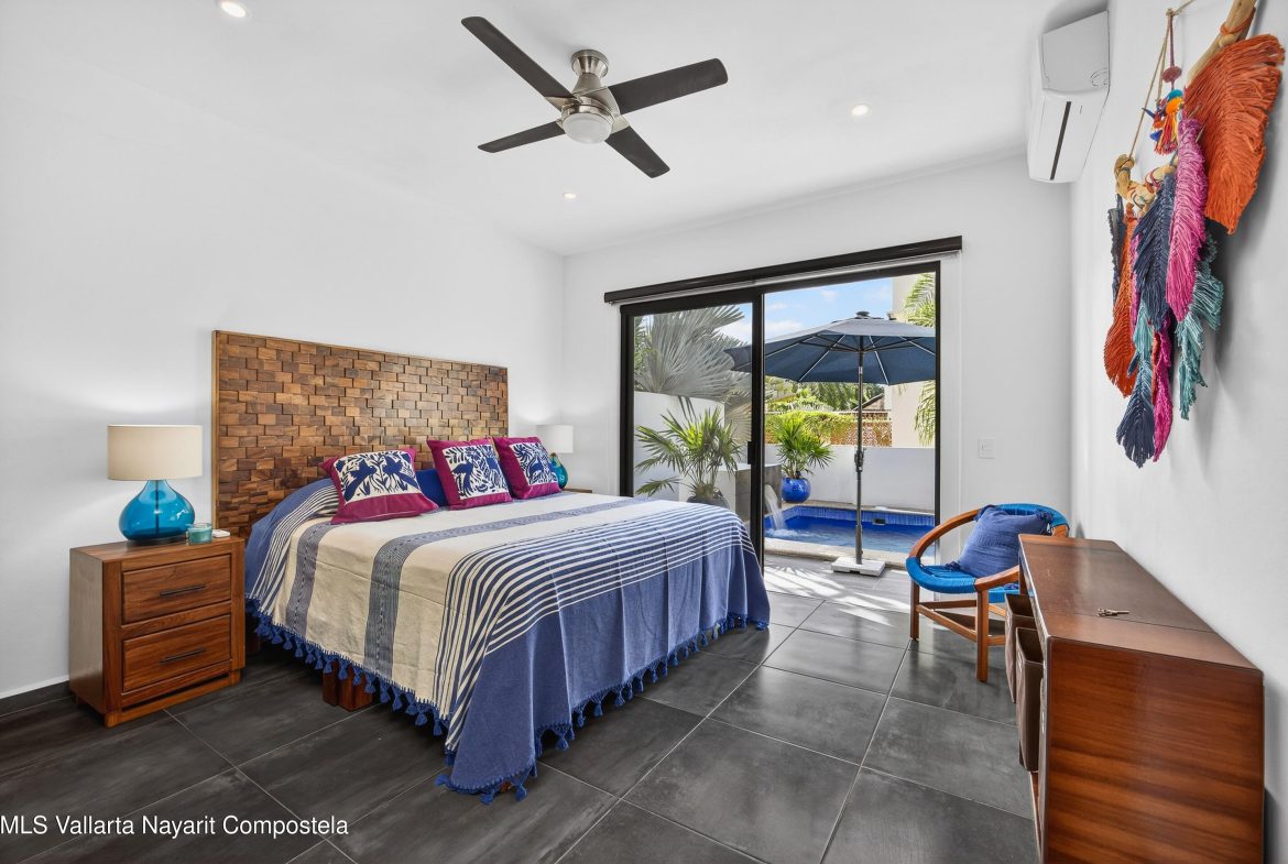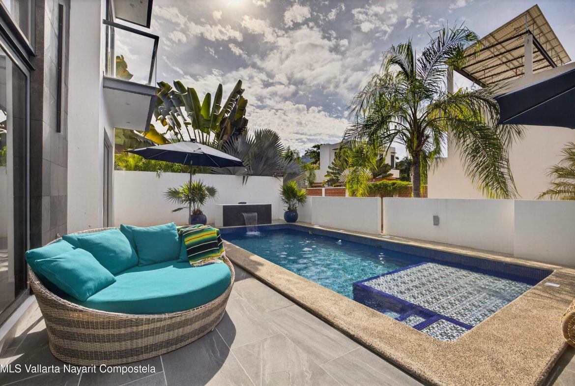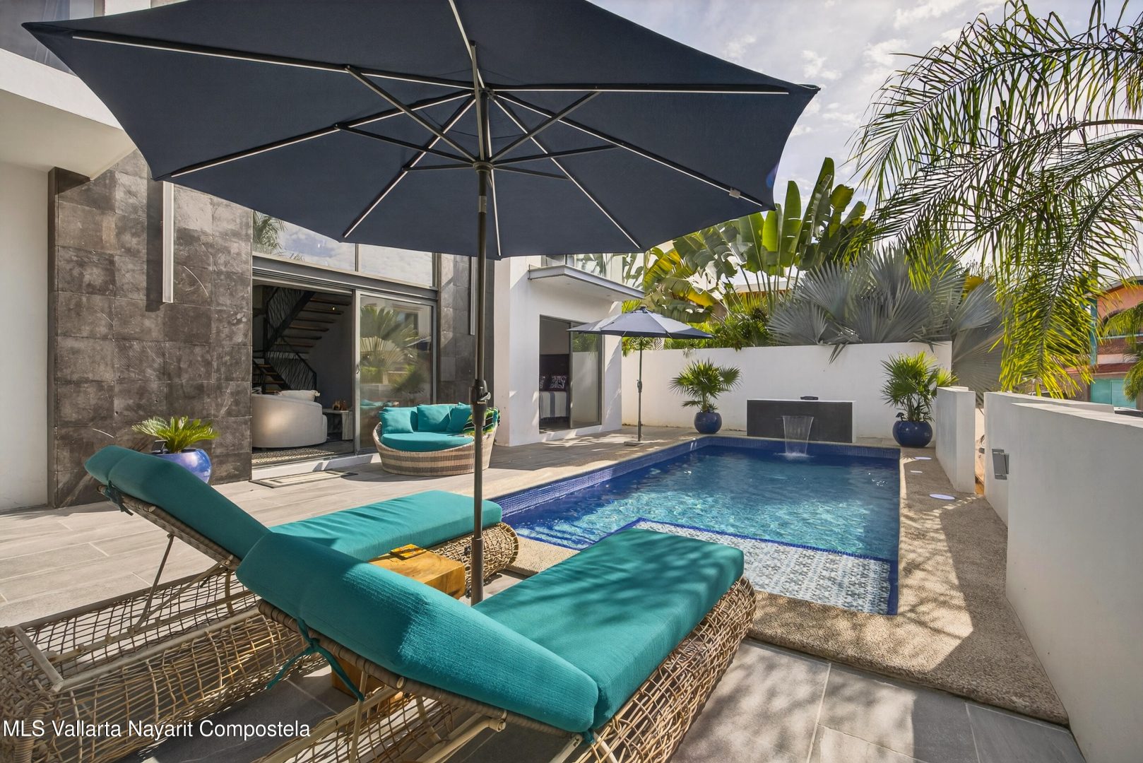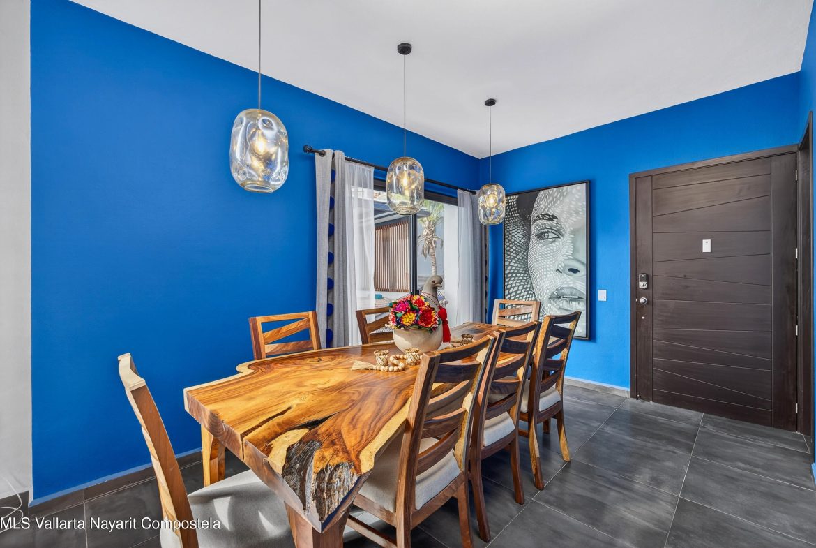 Casa Sol y Danza is a new modern home with ample natural light, an open kitchen with large prep island and open shelving. The focal point of the kitchen and living area is through large windows and sliding doors that open to a beautiful ornate pool complete with a shallow end for kids and/or just chillin’ with margaritas, surrounded by a large patio and outdoor bar lounge. It has three bedrooms, 3.5 bathrooms and a flex room that could be used as a gym, office, kids playroom or AV room. There is potential to put a pergola on the roof to catch evening sunsets reflected off the mountains that border the South end of San Pancho beach. Casa Sol y Danza is a 10 minute flat walk to the beach and all San Pancho restaurants and shops.