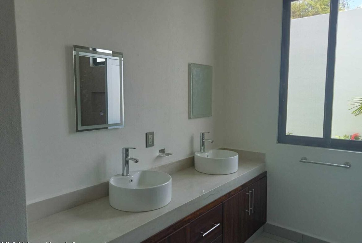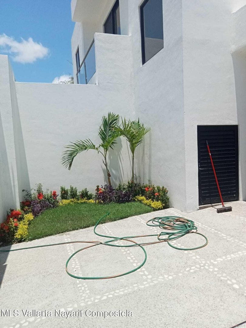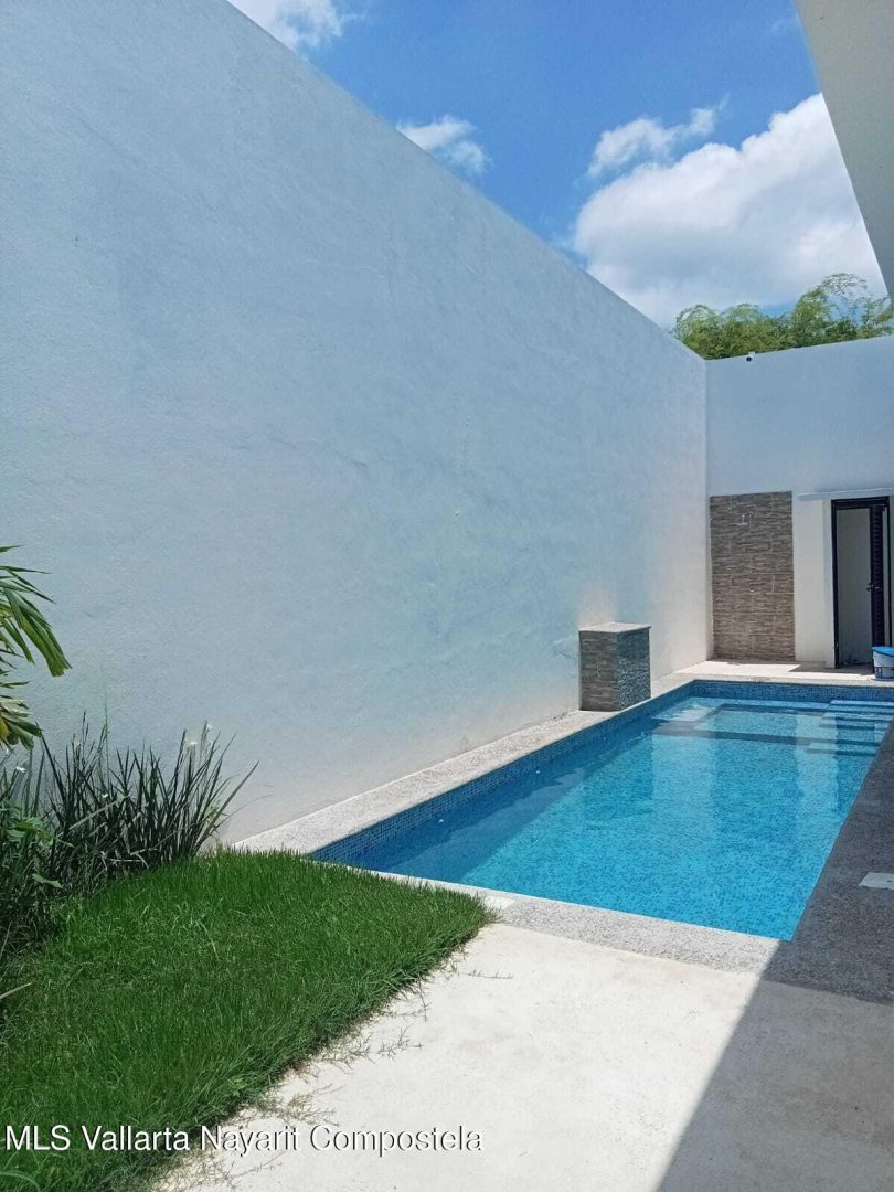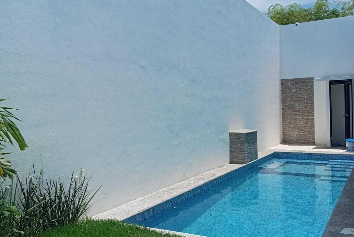 5 recamaras: en planta baja se encuentra una recamara principalcon vestidor, jardin privado y bano de lujo con doble inodoro y doble lavamanos, ademas de dosrecamaras secundarias con acceso independiente y bano compartido. En planta alta, hay dosrecamaras adicionales que comparten un bano completo, una de ellas equipada con cocineta, idealpara huespedes, renta o personal de servicio. La casa tambien dispone de una amplia sala-comedorcon elegante muro lloron, cocina integral con cubierta de granito, alberca privada, terraza en plantaalta, estacionamiento para dos autos, muros altos que garantizan privacidad y confort, y cercaelectrica para mayor seguridad. Su ubicacion es privilegiada: a solo 10 minutos de la playa y a unacuadra de la carretera federal.