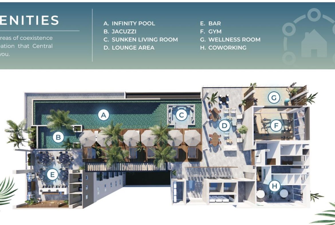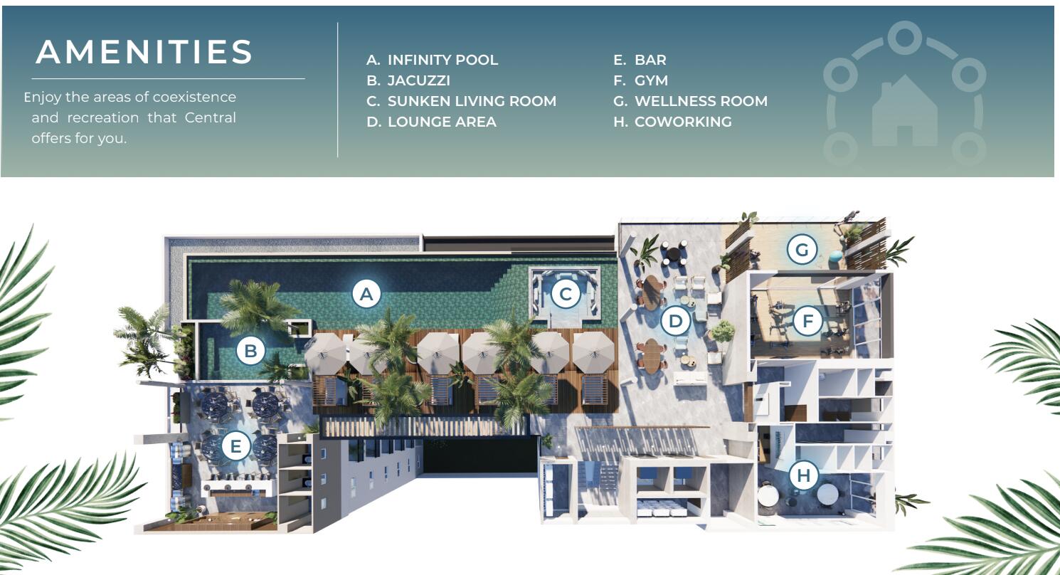 Introducing CENTRAL residences, the newest development in the Versalles neighborhood of Puerto Vallarta. Centralwill have 47 condos, of which 11 are type A, 24 type B and 12 type C. They range from 1 Bed + Den (type A), 2 Bed 2 Bath (Type B),2 bed 2 bath + Lock off 1 bed 1 bath (Type C). Thirteen of those units will have mesmerizing ocean views. With an array ofincredible rooftop amenities, Central will redefine luxury living – with an infinity pool that seemingly merges with the ocean and city, afitness center, wellness room, co-working room, Bar and Jacuzzi all facing the ocean and mountain views. Underground parking andBodega are a purchasable option to add onto your great Living Investment! Invest in your dream, invest in Versalles, Invest inCentral!