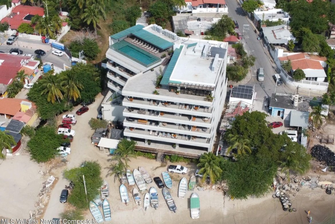 Condominio completamente amueblado y listo para habitar frente a playa en el corazon del pueblo, a pasos de restaurantes y del muelle a Islas Marietas. Cerca de Playa La Lancha, Marina La Cruz y a 45 min del aeropuerto. Ideal para vivir o invertir en renta vacacional. Esta propiedad se encuentra en el quinto piso y ofrece una vista amplia del oceano. Cuenta con una recamara, dos banos completos, balcon con vista panoramica y estacionamiento subterraneo asignado.