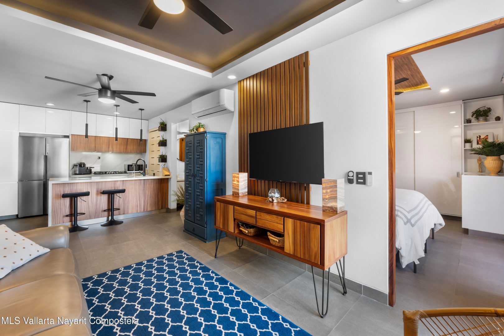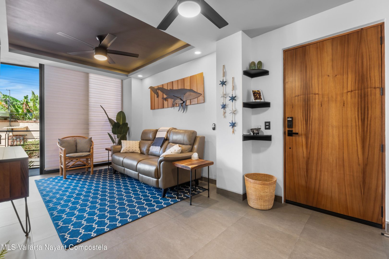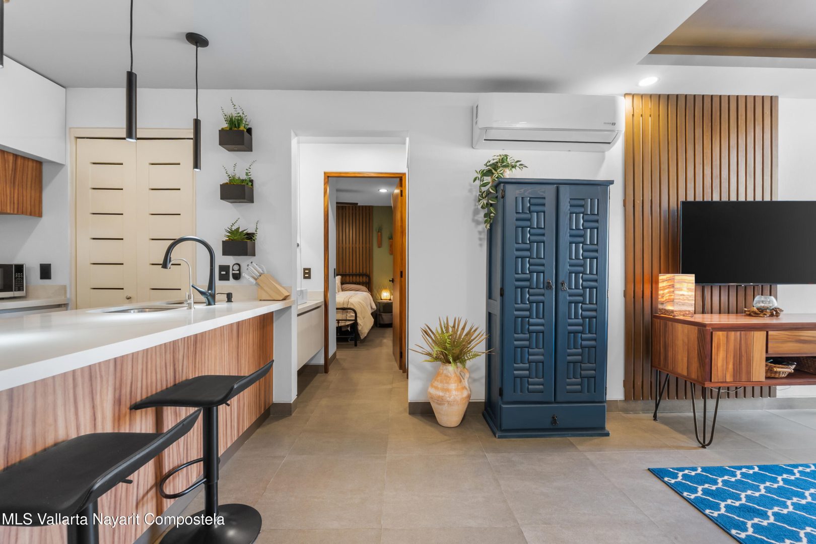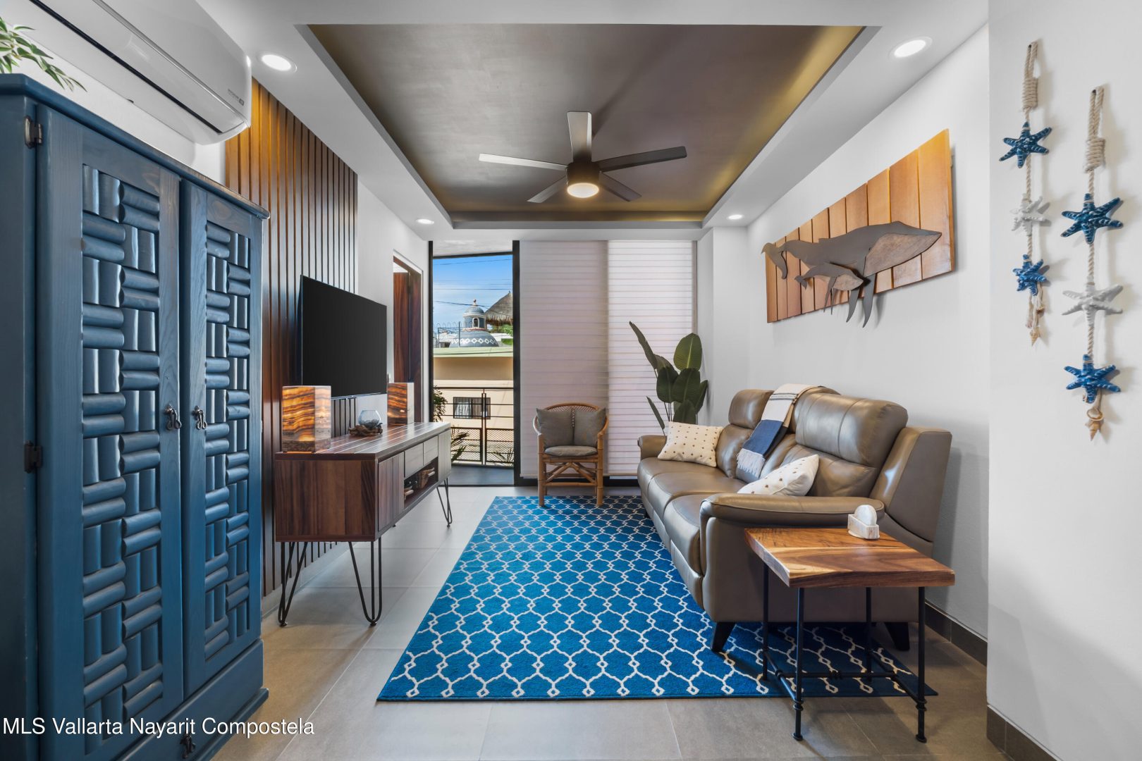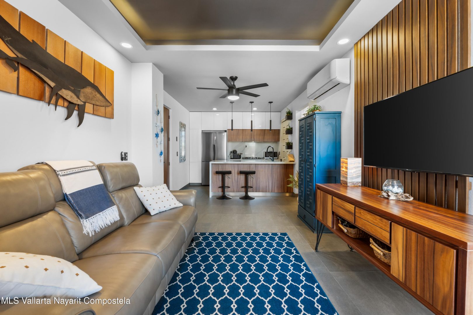 Beautiful newer, tastefully furnished 2-bedroom, 2-bathroom condominium located on the growing and highly desirable east side of Bucerias–just five short blocks from the stunning Golden Zone beaches. This prime location offers easy access to an abundance of restaurants, shops, pharmacies, and everyday conveniences. The unit is impeccably furnished and showcases high-end finishes throughout, including custom electronic blinds, blackout blinds in bedrooms,granite countertops, decorative wood panels, painted accent walls and ceilings, and soft indirect lighting in both the living room and primary bedroom. Comfort is elevated with controllable inverter A/C mini-splits, including a living room unit equipped with a programmable mobile app for remote operation, as well as ceiling fans throughout