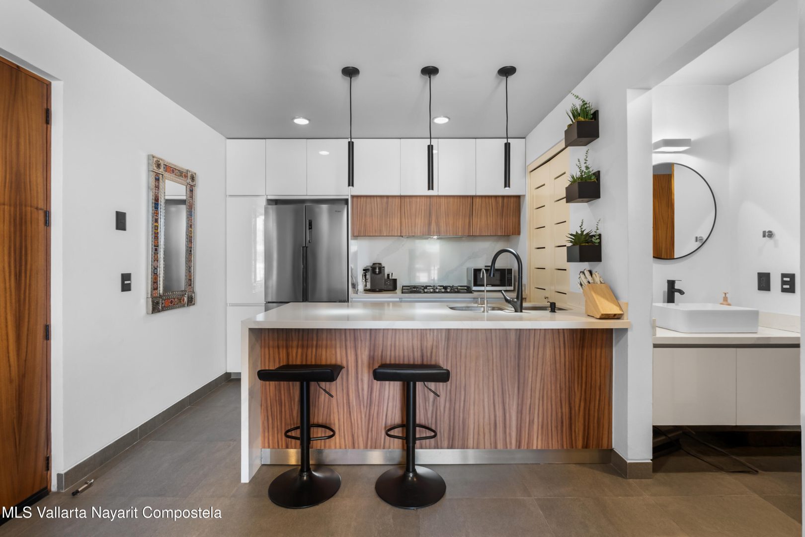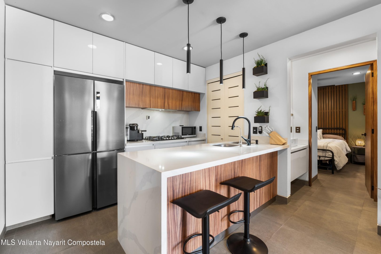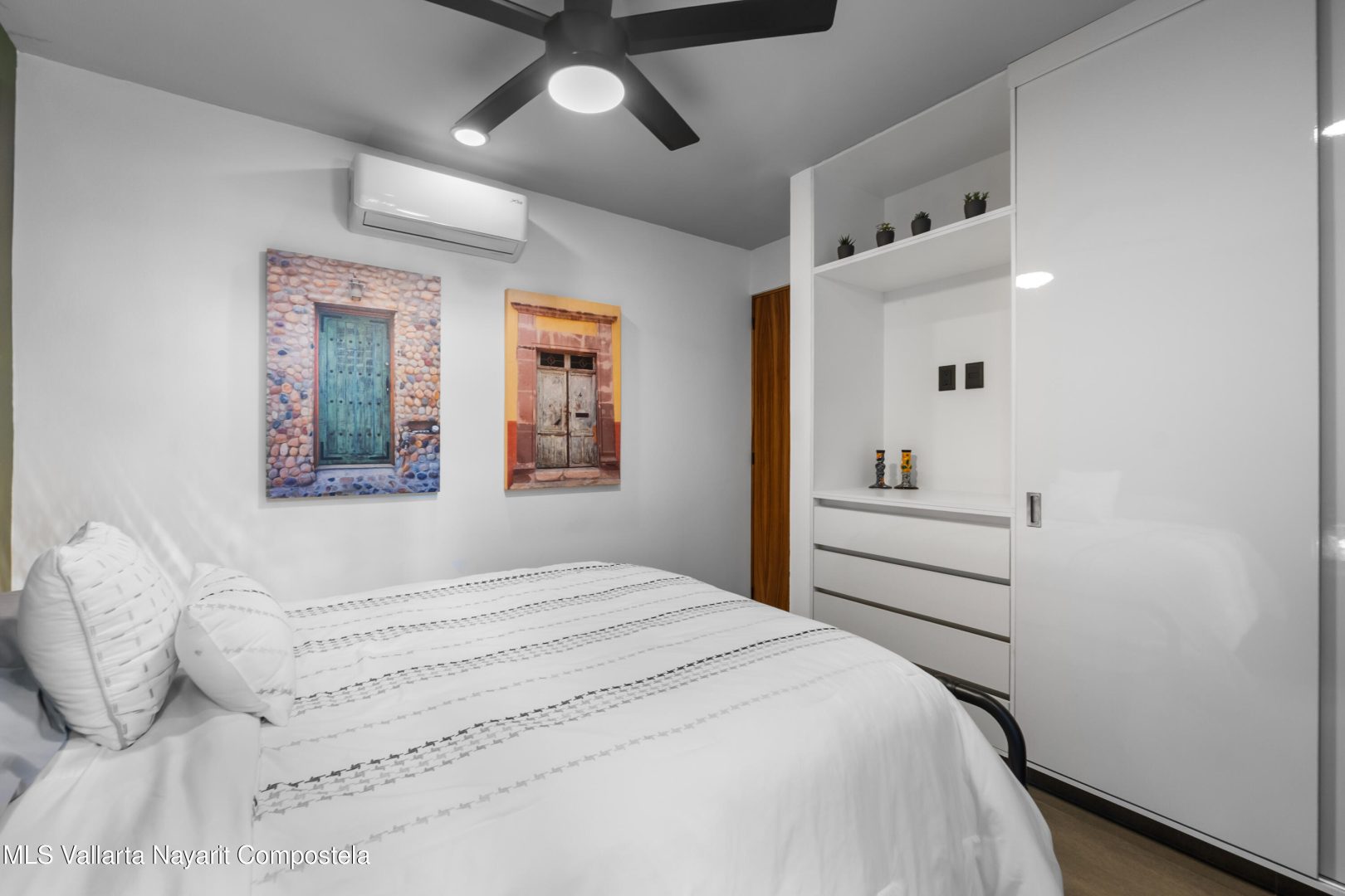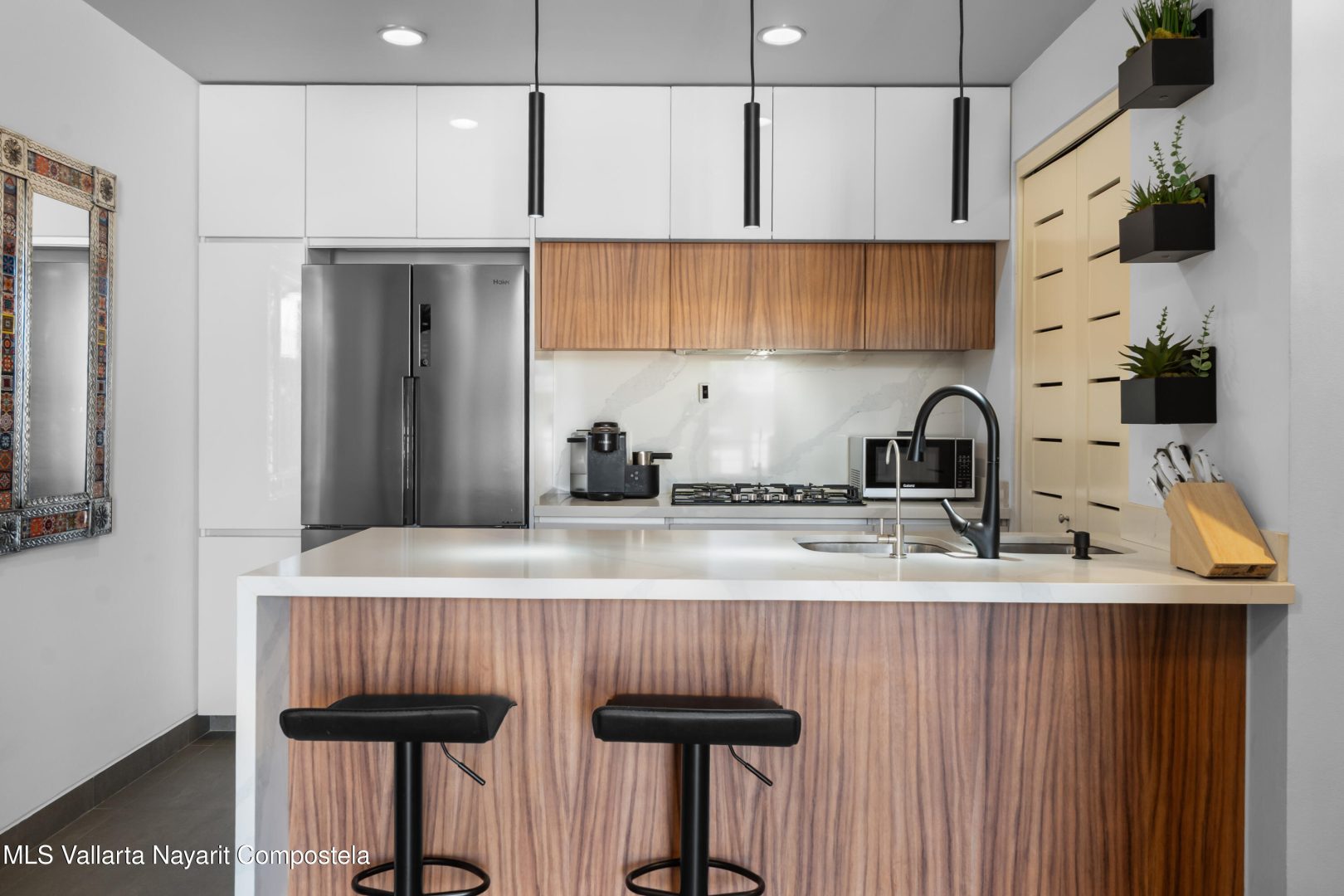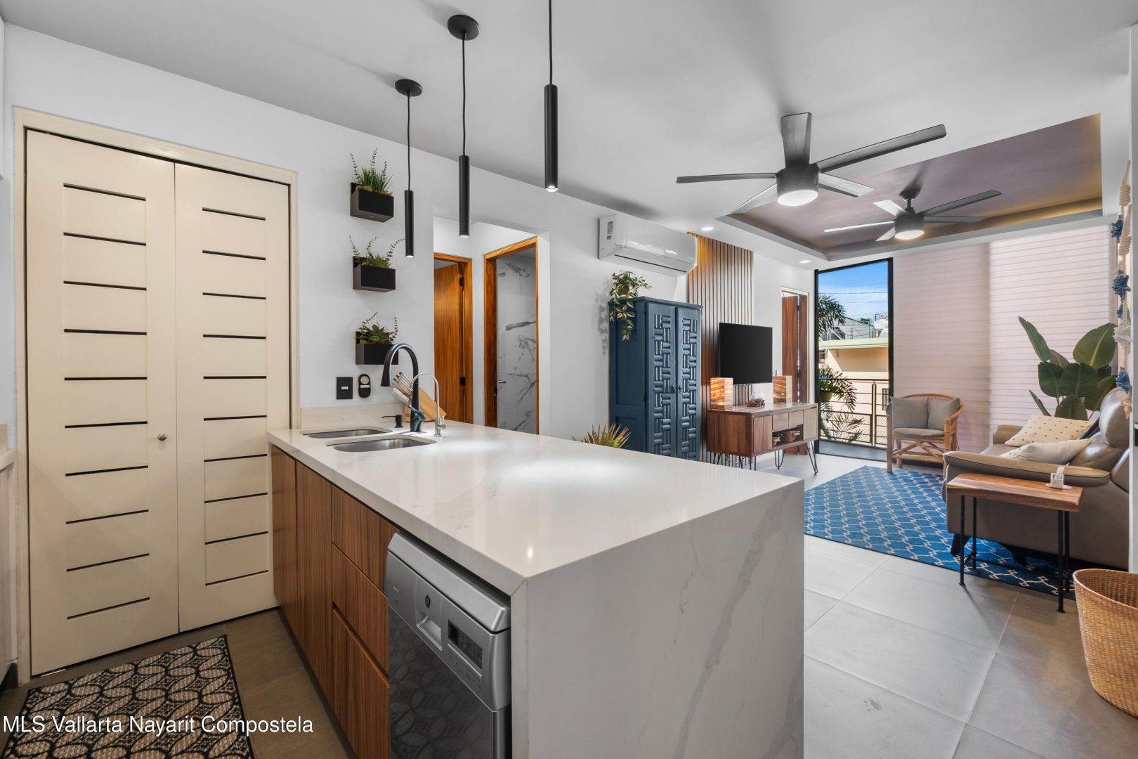 Beautiful newer, tastefully furnished 2-bedroom, 2-bathroom condominium located on the growing and highly desirable east side of Bucerias–just five short blocks from the stunning Golden Zone beaches. This prime location offers easy access to an abundance of restaurants, shops, pharmacies, and everyday conveniences. The unit is impeccably furnished and showcases high-end finishes throughout, including custom electronic blinds, blackout blinds in bedrooms,granite countertops, decorative wood panels, painted accent walls and ceilings, and soft indirect lighting in both the living room and primary bedroom. Comfort is elevated with controllable inverter A/C mini-splits, including a living room unit equipped with a programmable mobile app for remote operation, as well as ceiling fans throughout